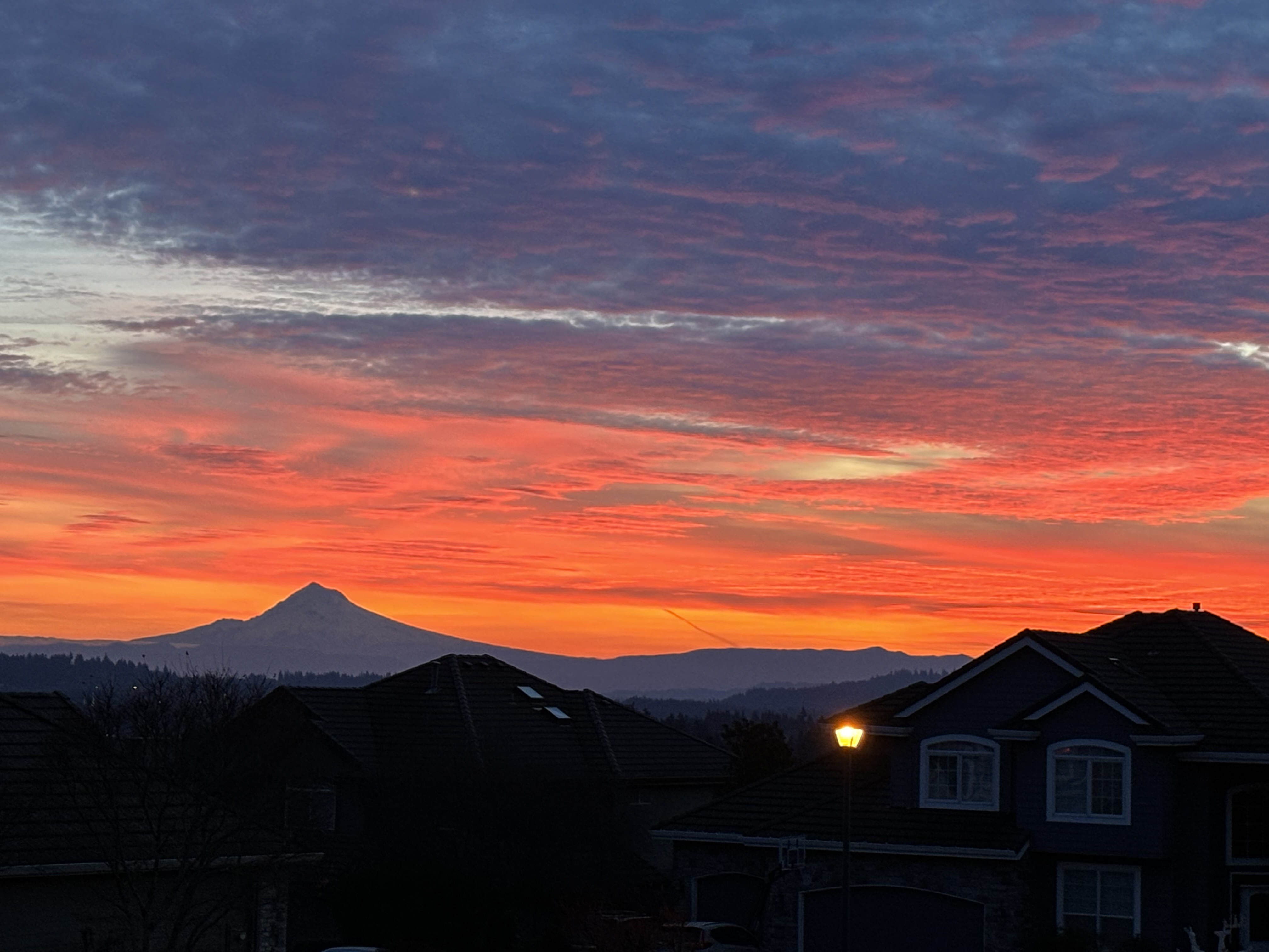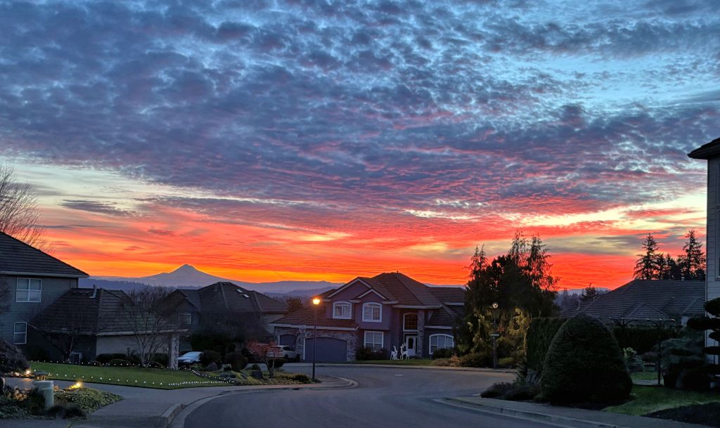 There was a man there already, in his sweatpants and slippers out on the sidewalk, taking a photo of the mountain with his phone too. I asked if he lived there, he said he did, and pointed to the house that was his. We oooed and ahhhed at the sky for a while. The man told us that the sky is often outstanding up there. He searched his phone for an old photo, of a checkerboard sky, with blue and red checks made by clouds at dawn. Just gorgeous. After we were done chatting and appreciating the sky, we said goodbyes, and have-a-great-days, and Pedro and I headed home.