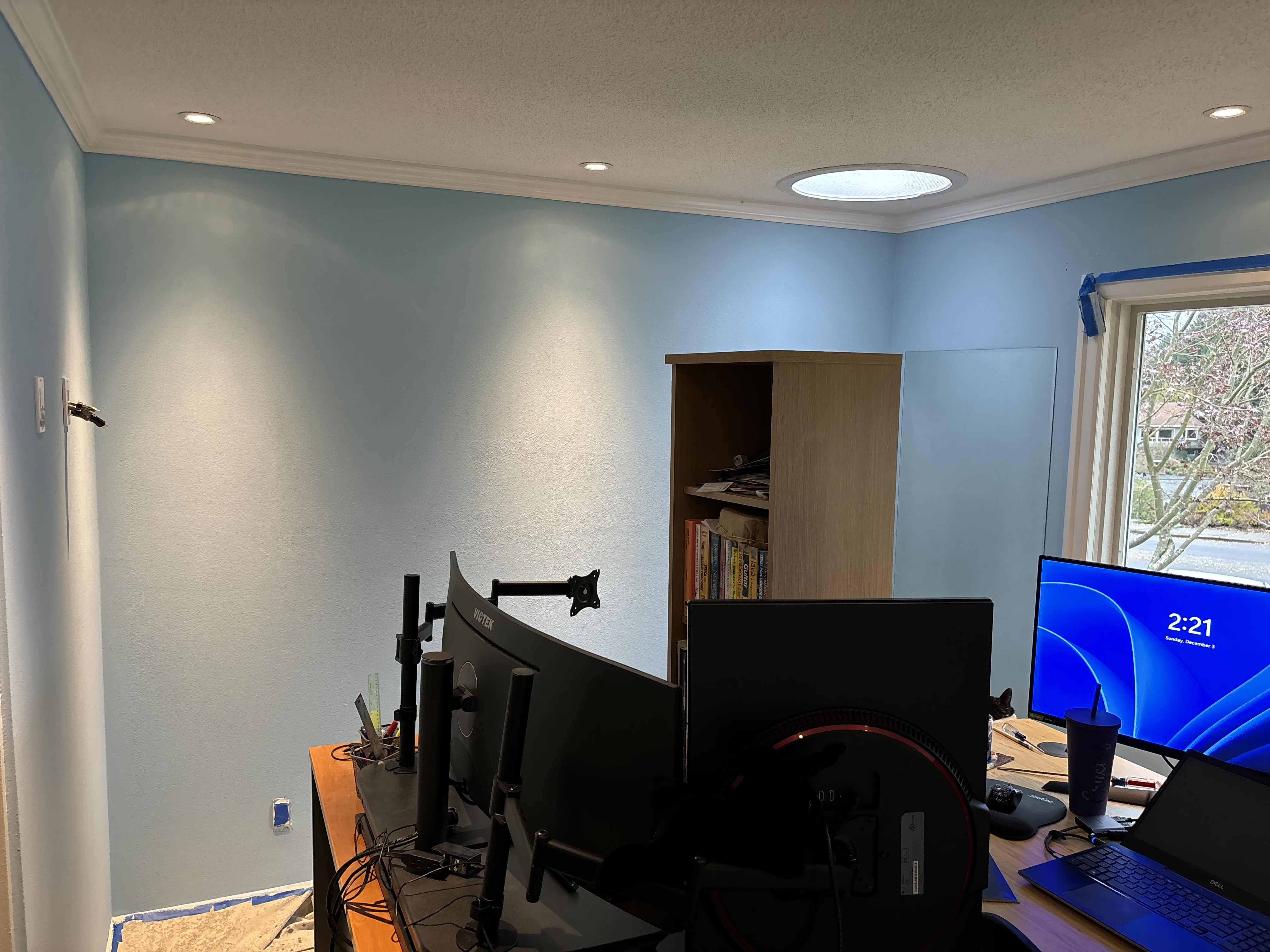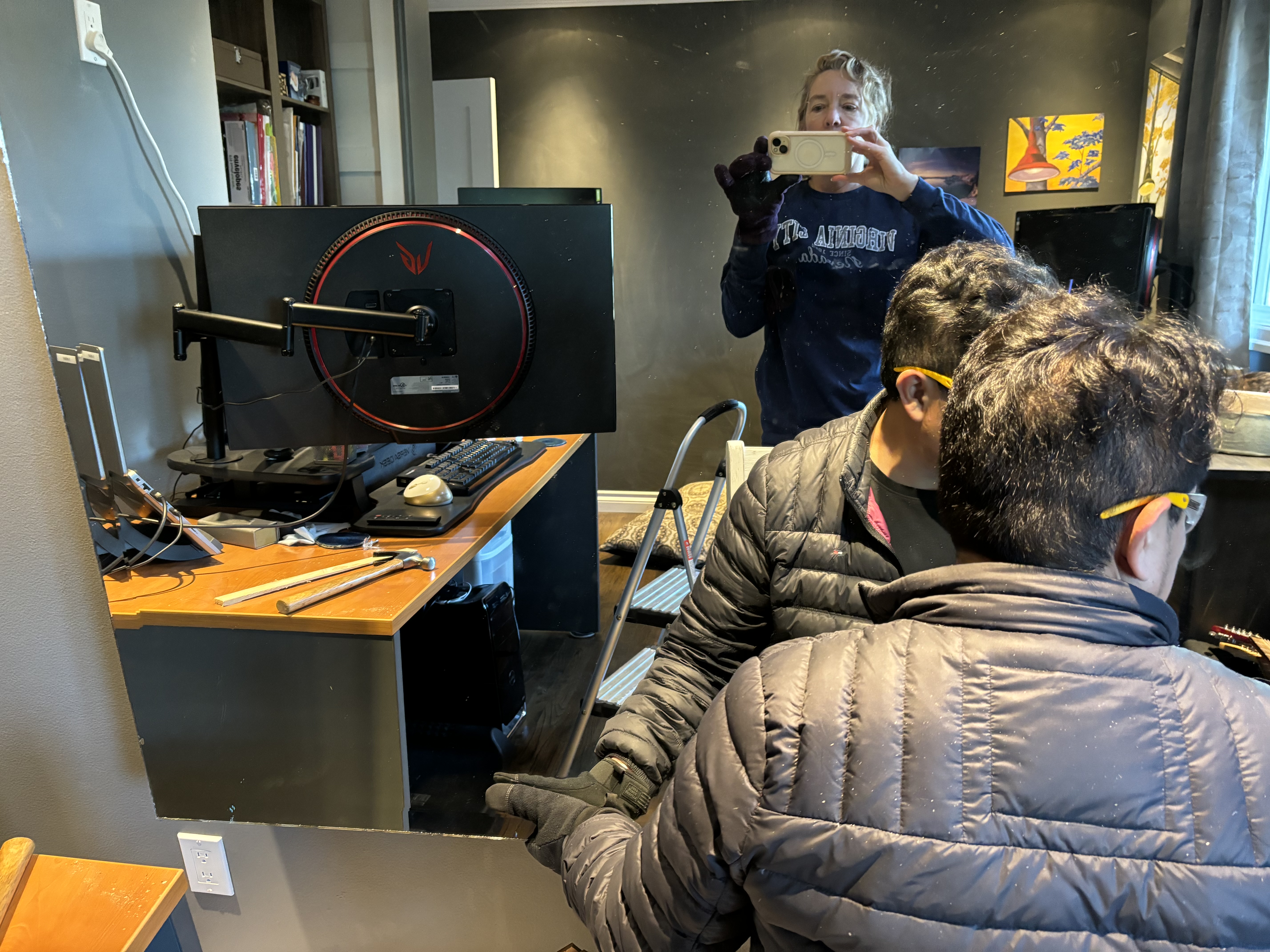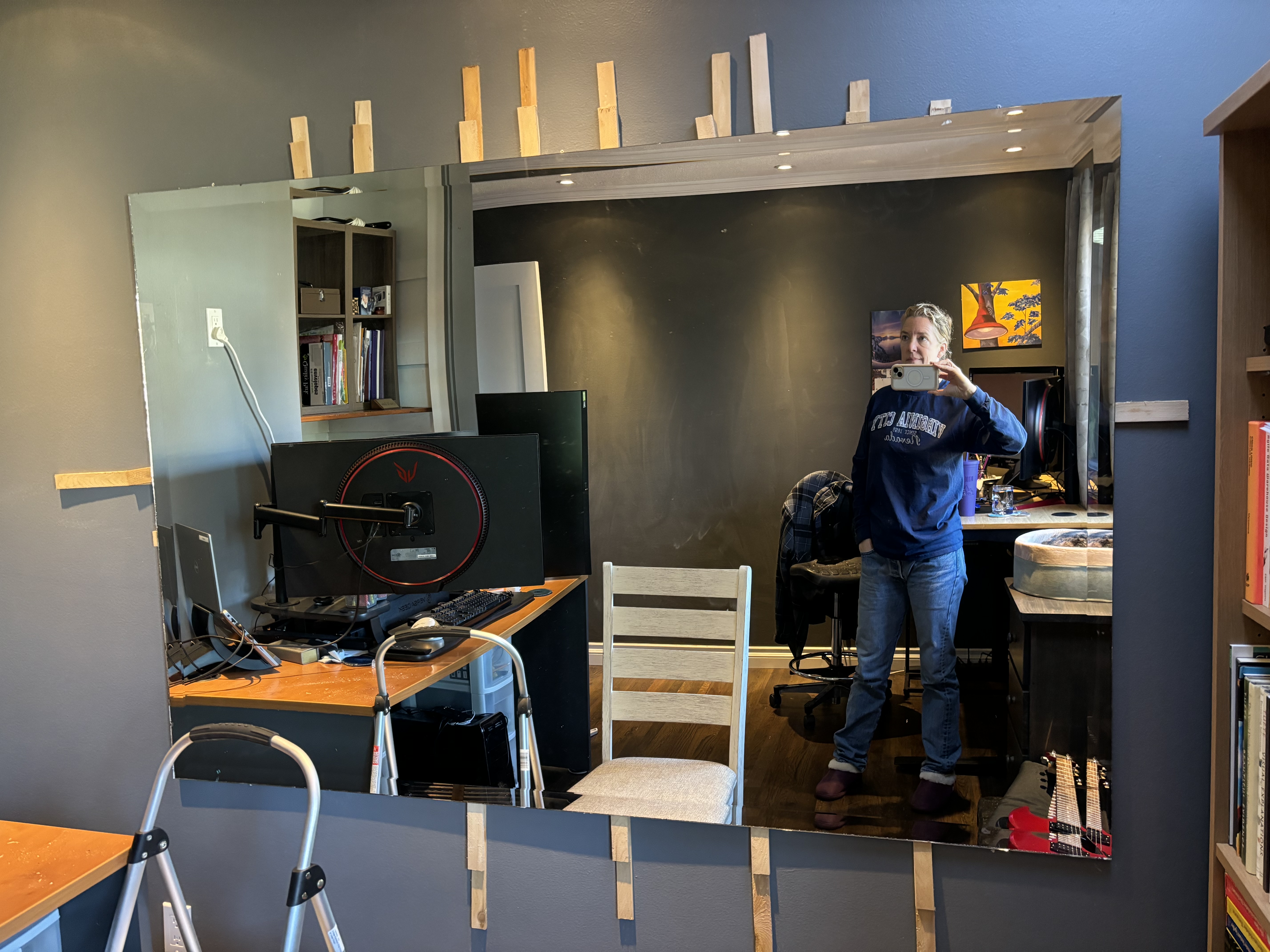 His first choice was to do what I did, and put his desk into the left corner, also looking out the window. But the mirrors are a problem. He has multiple meetings each day and the mirrors were interfering, with reflections and distortion in all directions. It has been his goal since the day we moved in, to get rid of that big wall mirror.