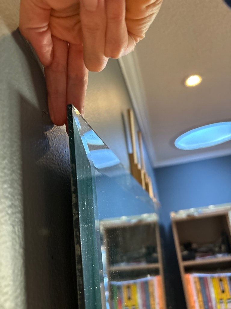 On a whim, I checked YouTube. You DO know that a video for absolutely every home DIY question under the sun exists? I typed in: “how to remove a mirror from a wall” and up popped a detailed instructional video for how to safely remove a large mirror that has been glued to a wall. Exactly what we needed. And a lifesaver! We never would have thought of this method before seeing the video and may never have retrieved it intact on our own. The person making the video said to gently hammer in wooden shims all around. Then hammer in more, and more, stacking them.
