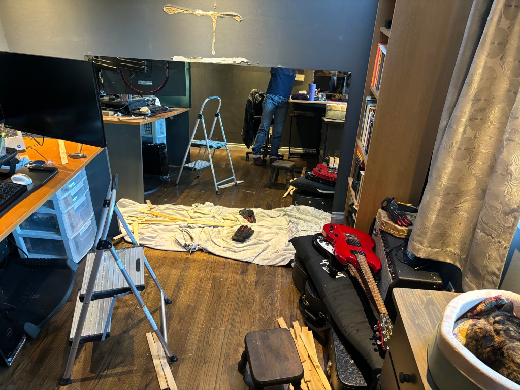Good grief with all the glue. Yikes. I love big mirrors. We have one in the dining area off the kitchen and it makes it seem spacious. But ours is framed. Heavy, but,well … no glue. I know Rainier well enough to imagine it’s quite an adjustment from an audio perspective but the trade-offs seem worth it. I’m inspired by Racecar’s bed. I want one for Yoda!