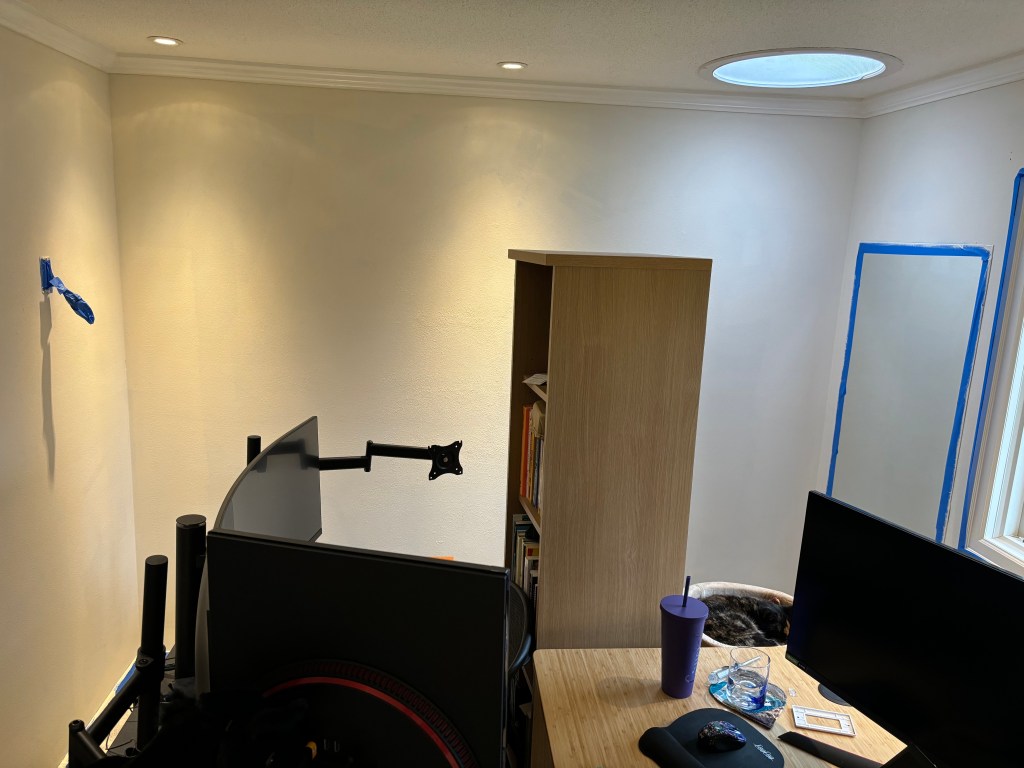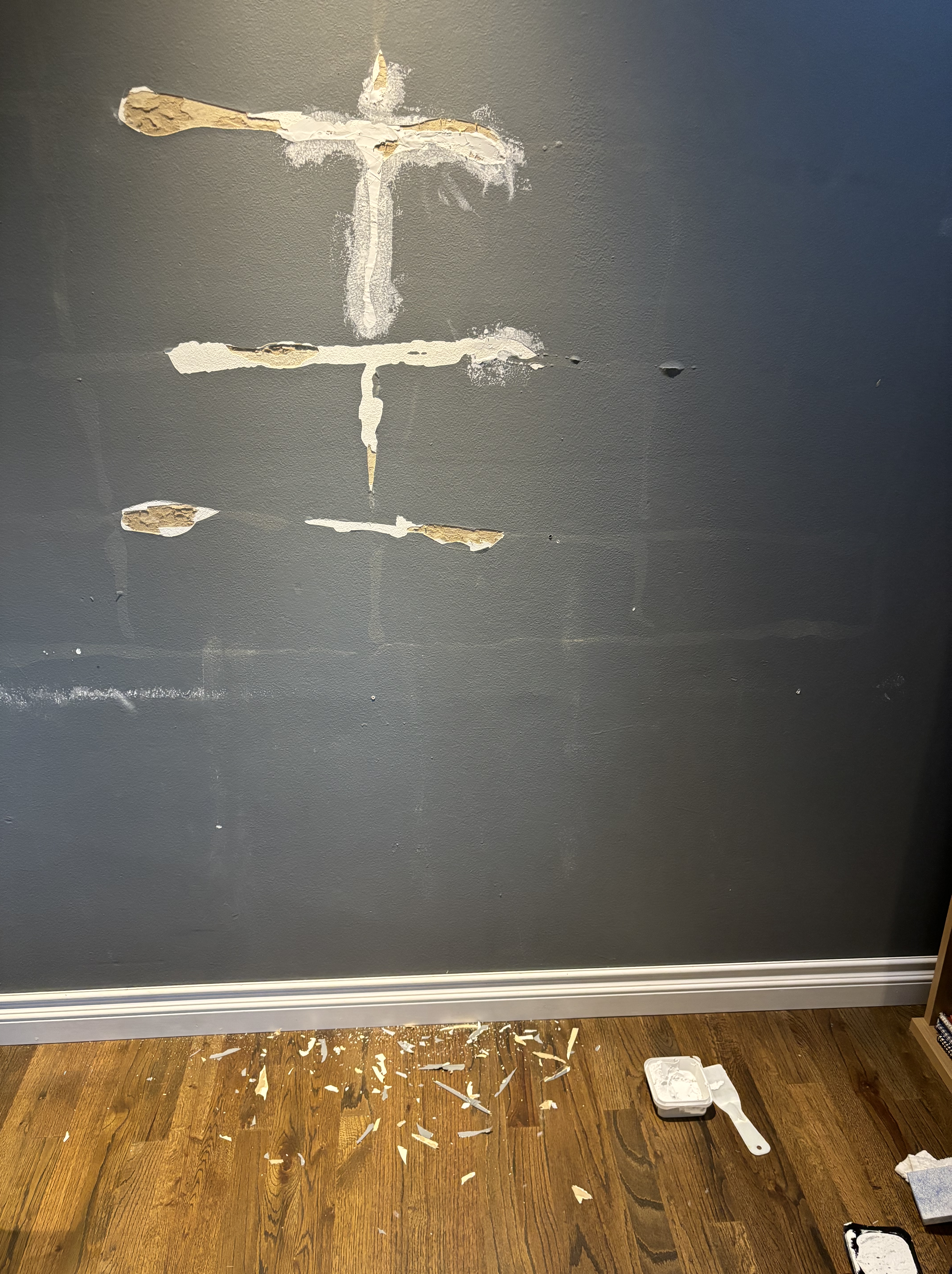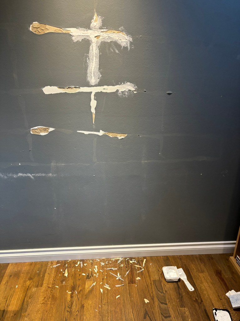 The other thing we did not like about our office was that it was painted dark grey. Likely because one full wall was chalkboard paint, and the other walls matched the chalkboard. Probably cool and fun and convenient if this was your workout room, but it just looked messy as our office. So we would repaint it. First, we had to repair it.