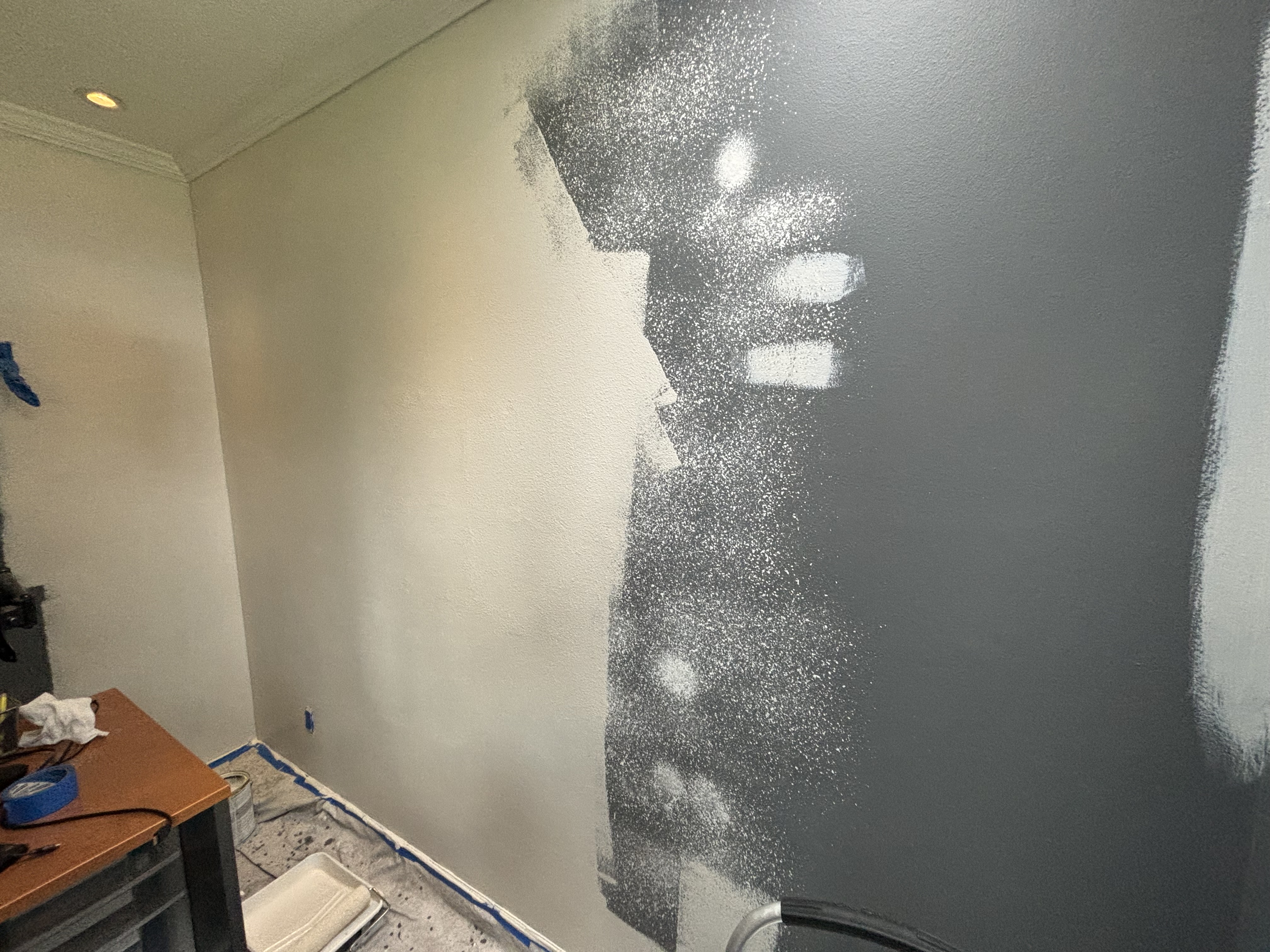 On the third day we felt it was ready for paint. Our goal was to not purchase any paint. In our garage, we had inherited about 17 cans of house paint of various shades. Six of them were mostly empty, so we had disposed of them. Of the remaining cans, I chose all the whitish ones and lighter colours, and painted samples onto a scrap of cardboard. We used that to match to other walls in the house and thus eliminated paint that matched other rooms in the house we might want to use for patches later. There was one very old gallon of a creamy white that we couldn’t match anywhere. It took me two days of effort, but I finally stirred it enough to blend the separating colours and textures and weights of the fluids inside. I used that as a base paint, to brighten up that dark grey.