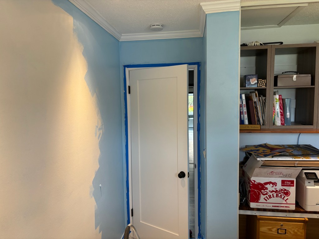 Next it was time for colour. I used the remainder of the cream paint, the entirety of what remained of a can of light blue paint that we couldn’t find a match to anywhere in the house. Then I added in another shade of white paint to make a full gallon. I mixed and mixed and mixed, then began with a colour we called Simpson’s sky blue.