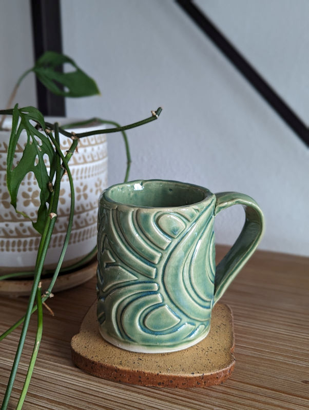 Pretty mugs from our table. The one on the right was decorated by pressing lace into it.