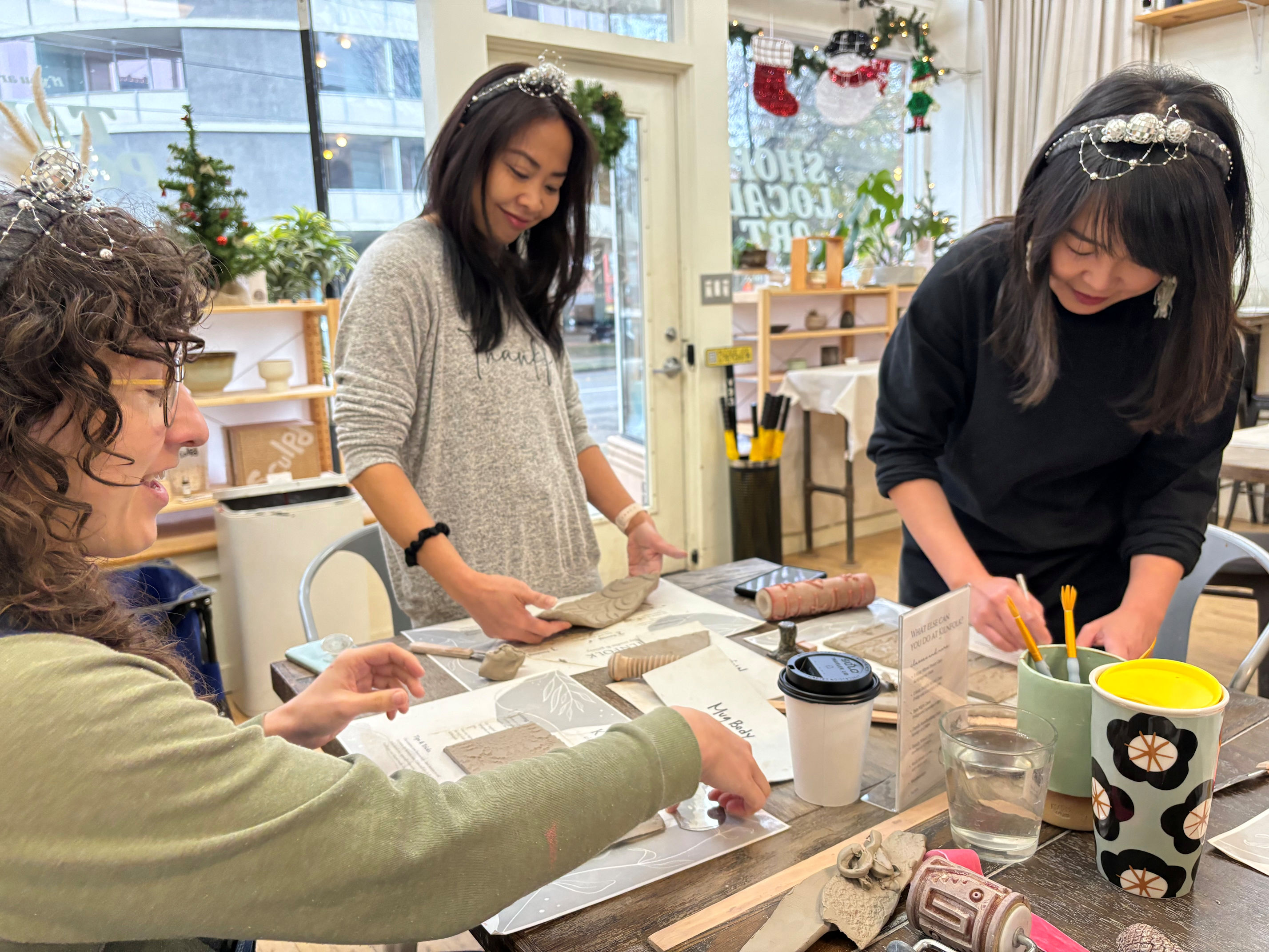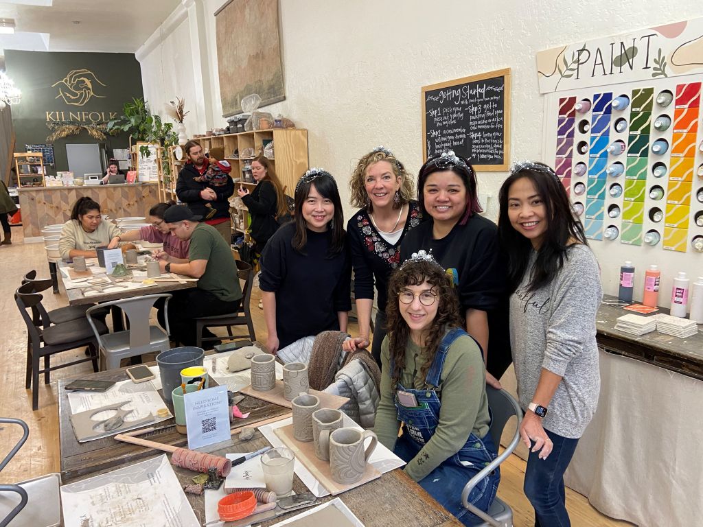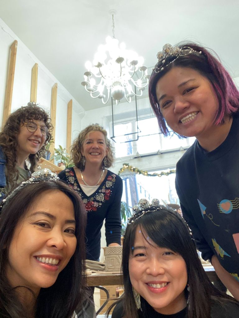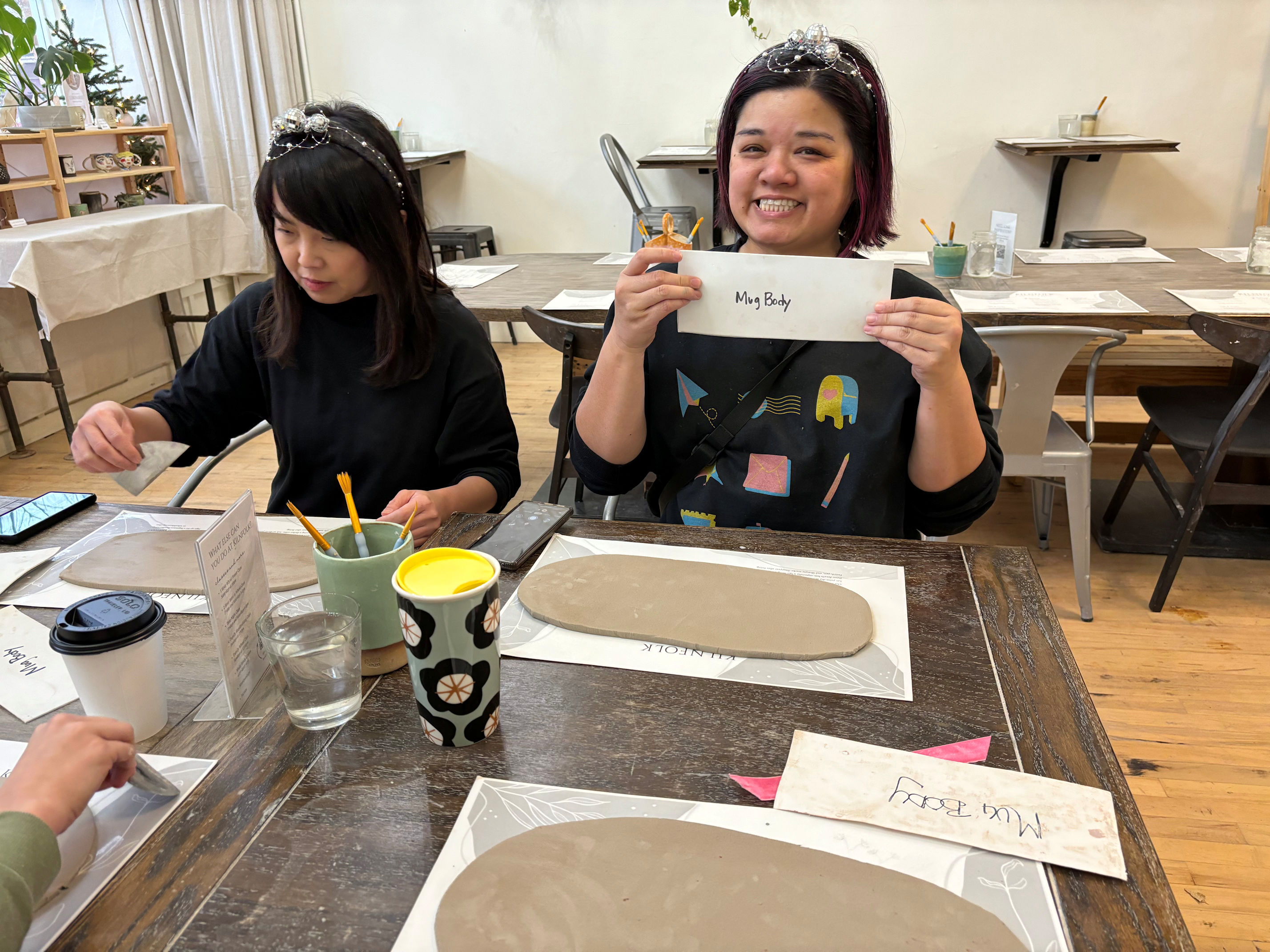 My friend Maria loves crafting and is great at bringing her friends together. Recently she invited us to join her at a pottery place called Kilnfolk she found that offered a mug-making workshop. A group of us signed up online, then all showed up at the class. I met all of them but Maria for the first time. Maria made everyone sparkly New Year’s headbands to wear.