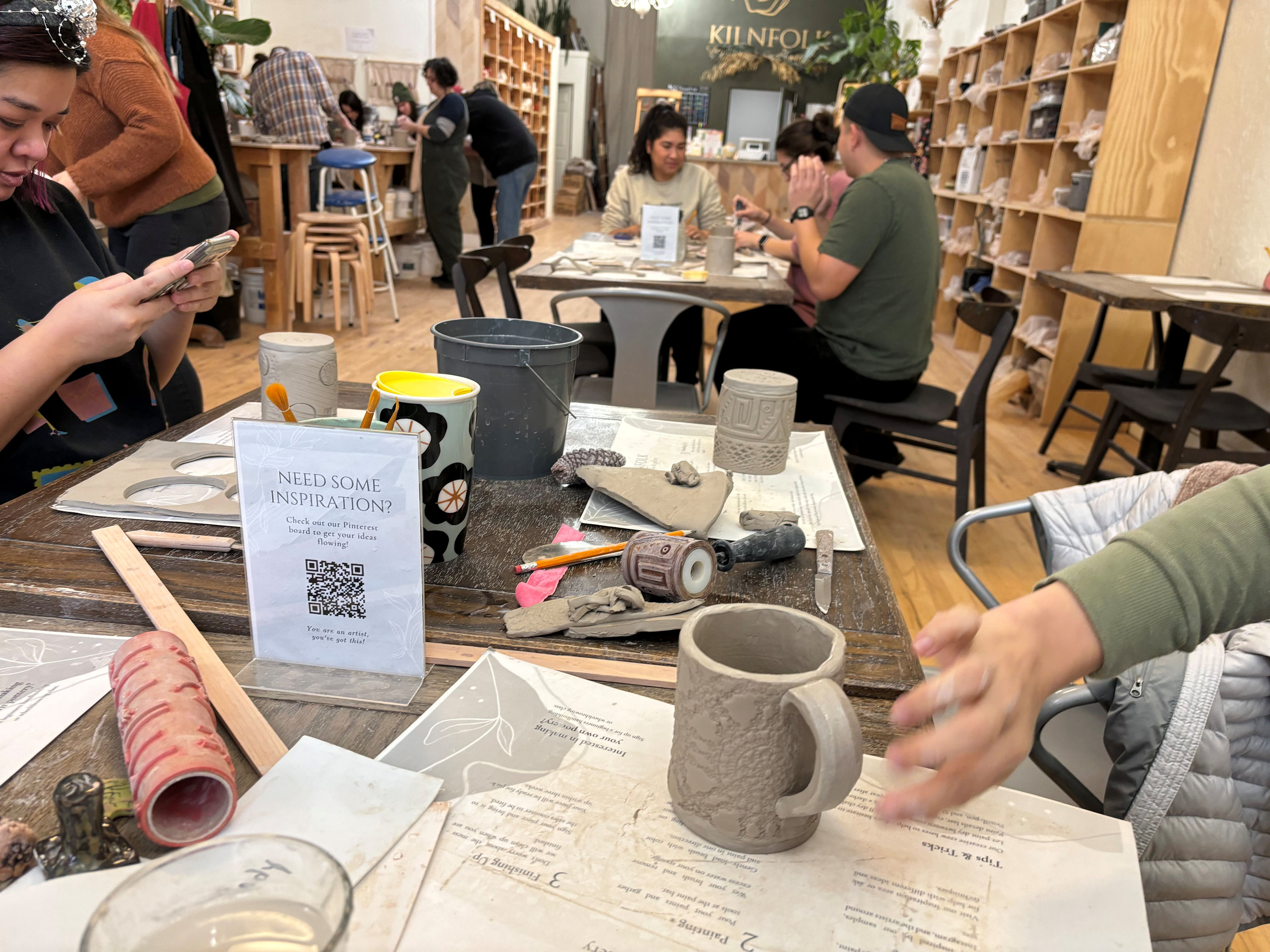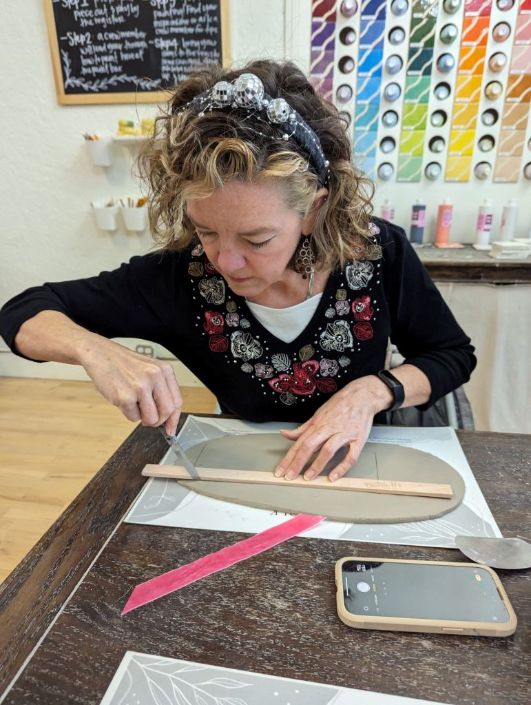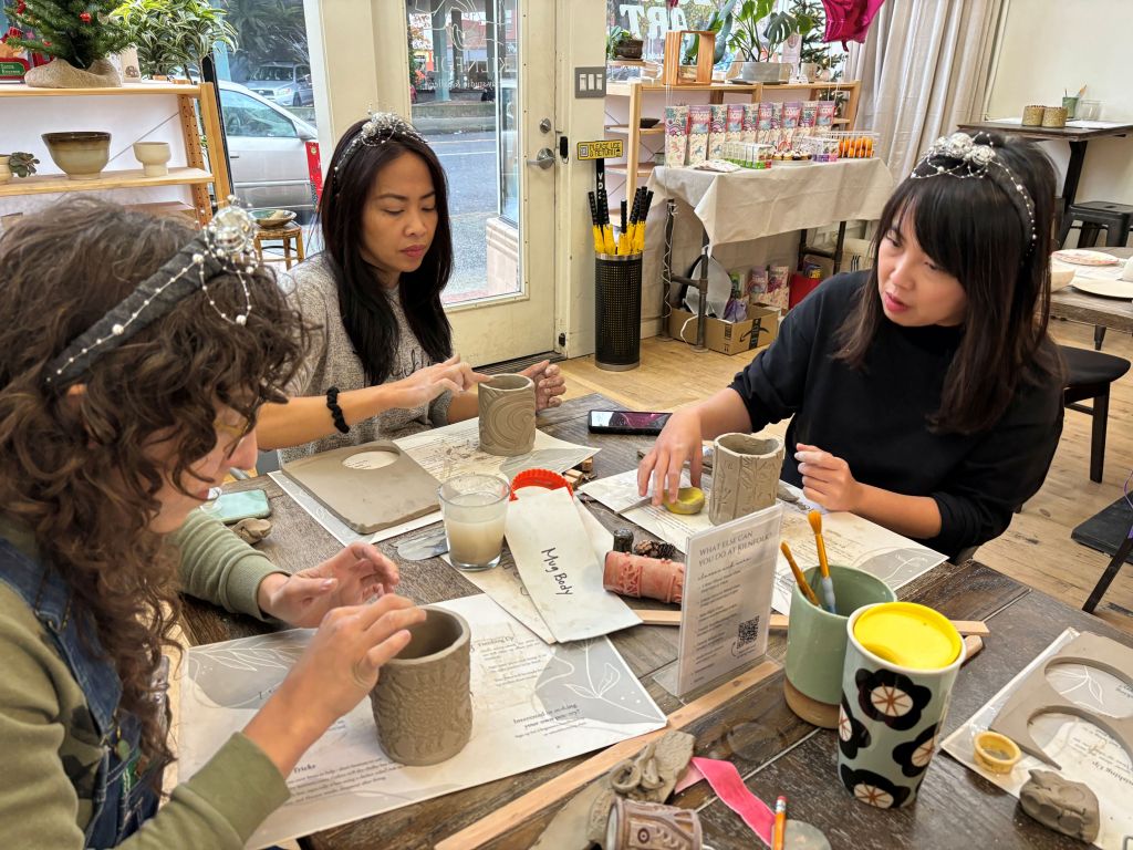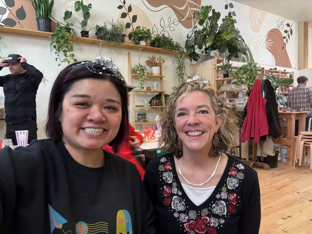 My friend Maria loves crafting and is great at bringing her friends together. Recently she invited us to join her at a pottery place called Kilnfolk she found that offered a mug-making workshop. A group of us signed up online, then all showed up at the class. I met all of them but Maria for the first time. Maria made everyone sparkly New Year’s headbands to wear.