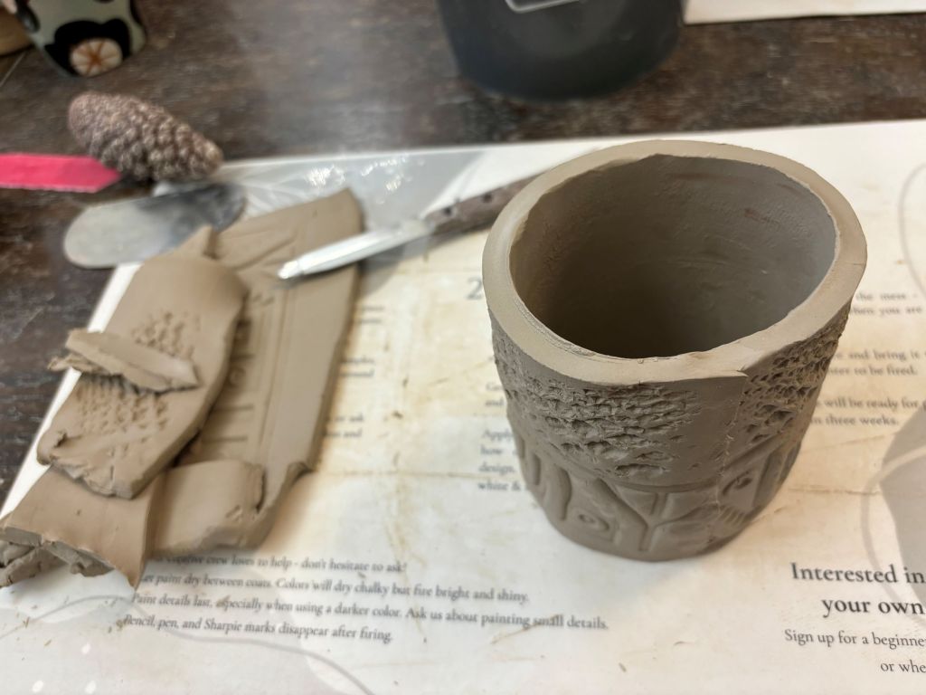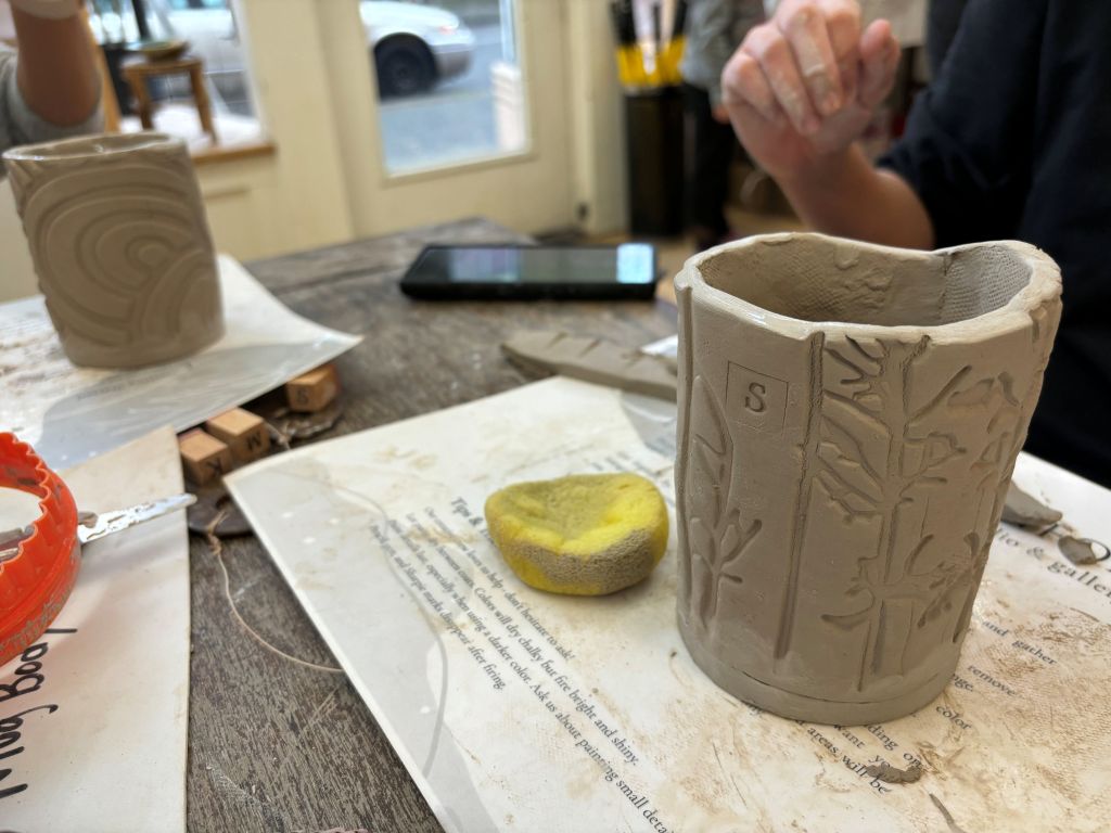 When we had our rectangle, then we were supposed to decorate our mug. This involved digging through containers of design rollers and fabrics and sticks and pine cones and all kinds of things with interesting textures. I started calling it the Toybox. Then we pressed our things into the clay. In retrospect, I would have given instructions differently. For all of us, pressing the designs warped our clay, so then when we shaped the mug, everyone’s had to be fixed, some more than others. It makes more sense to me to press the designs, THEN cut out the rectangle shape.