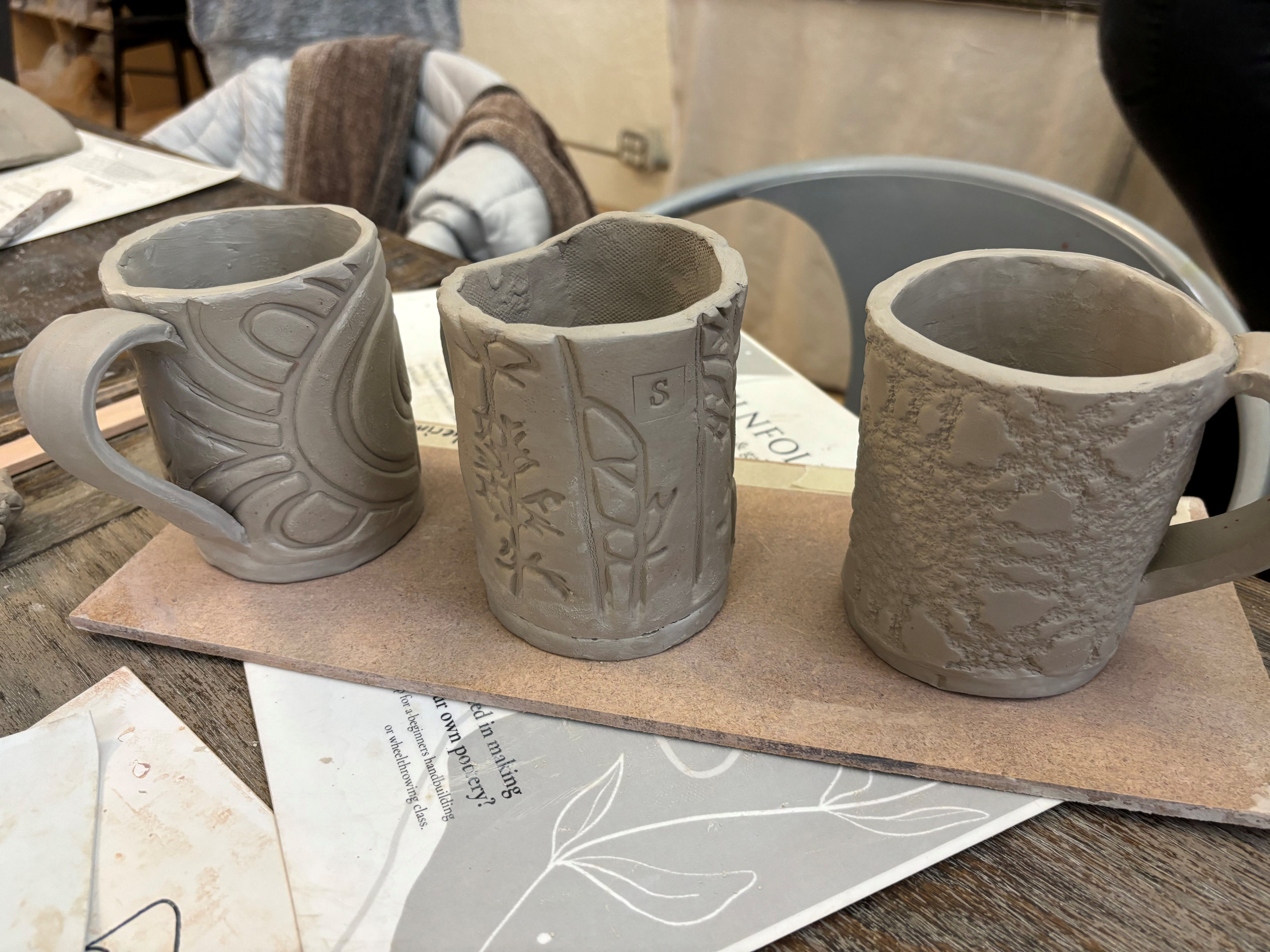 We each received a pre-flattened oval of clay, and a thin piece of cardboard in the shape of the mug body.