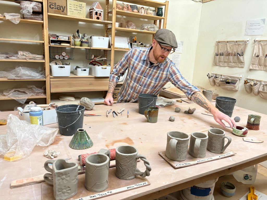 The Kilnfolk employee who helped us, and lots of creative mugs.