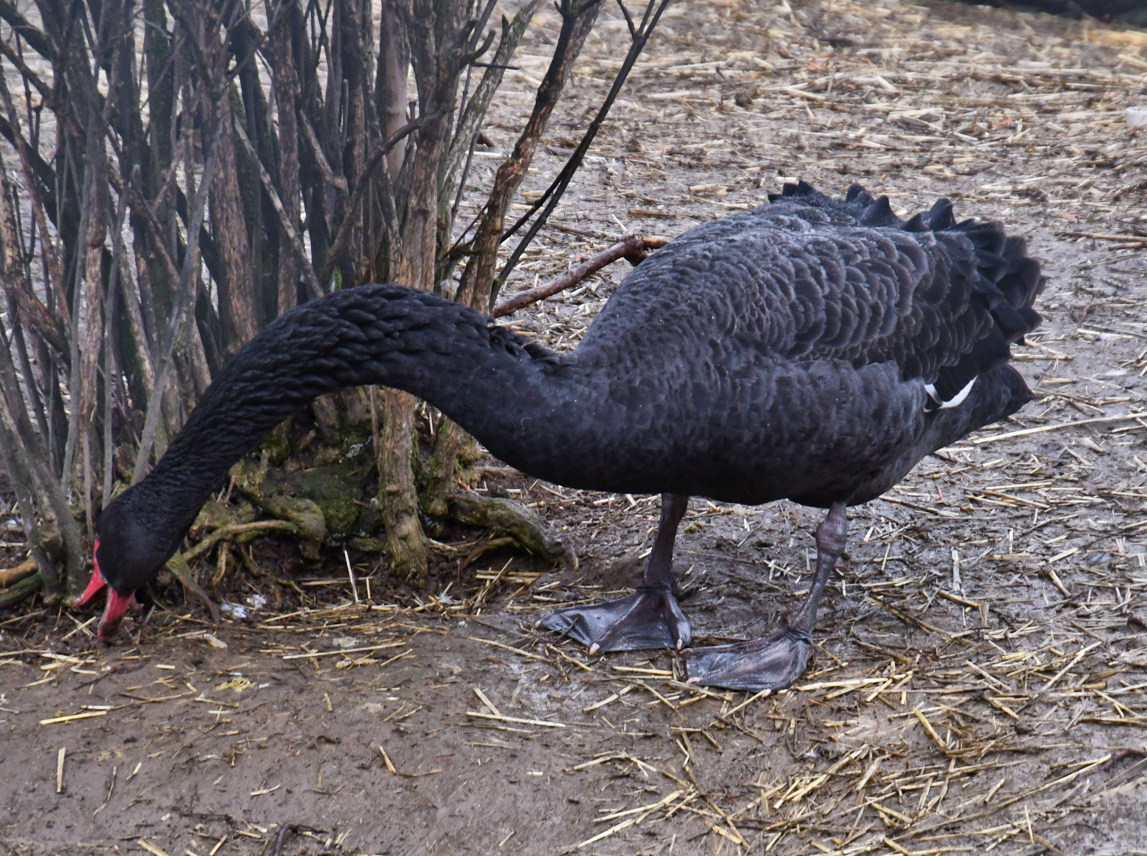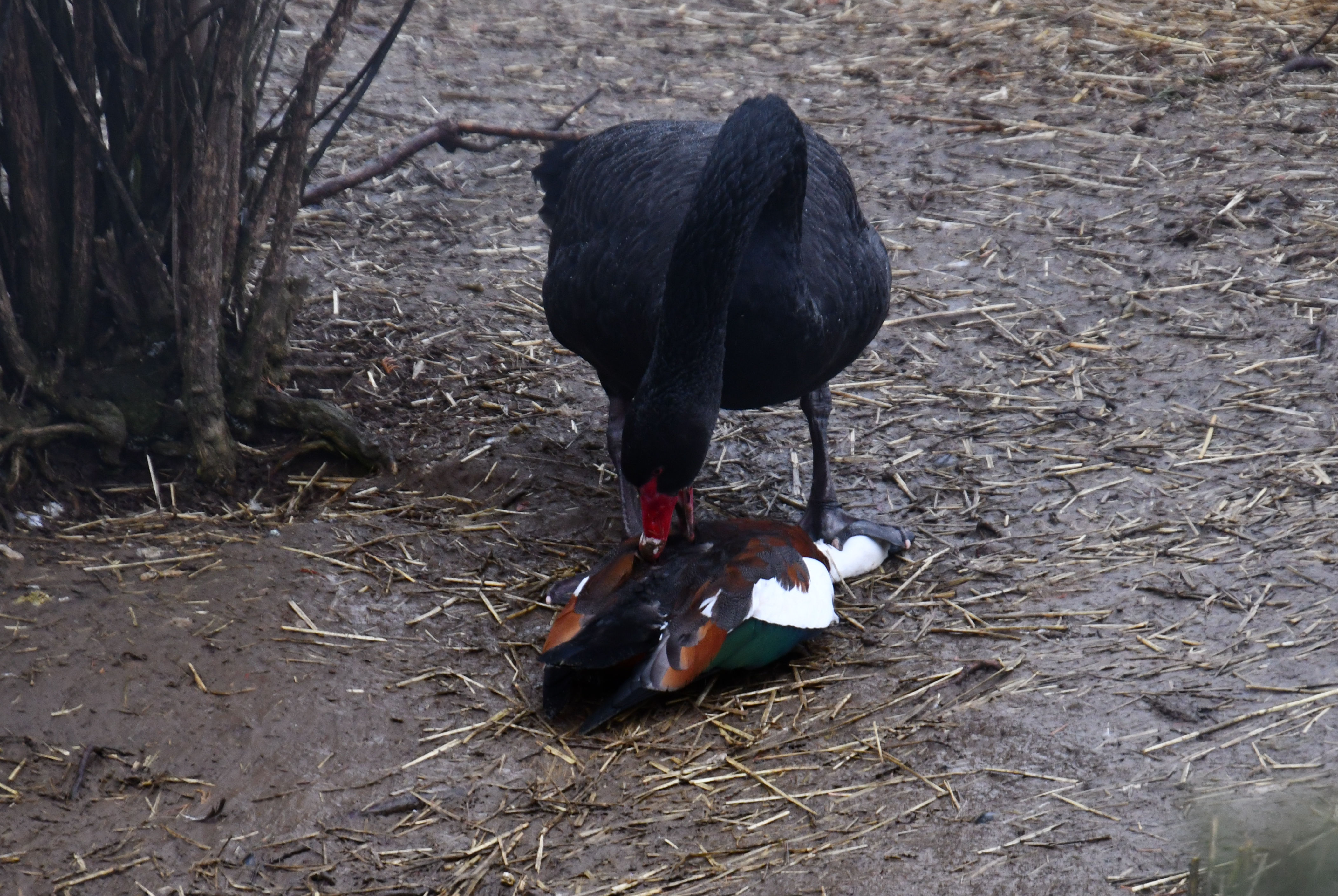 We saw the craziest scene while we were there. Even with photos and discussion about it afterward, we do not know what we witnessed. It appeared for all the world as though the Black swan was getting ready to eat a dead duck. The huge black bird was standing on top of the large duck and jabbing its beak into it, and pulling hard at feathers and wing. We watched in morbid fascination expecting at any moment to see shreds of flesh being pulled from the duck on the ground, but it did not happen. The Black swan had one foot firmly planted on the duck’s head, appearing to pin it to the ground. Suddenly, the duck below hopped up and ran off, without so much as a limp.