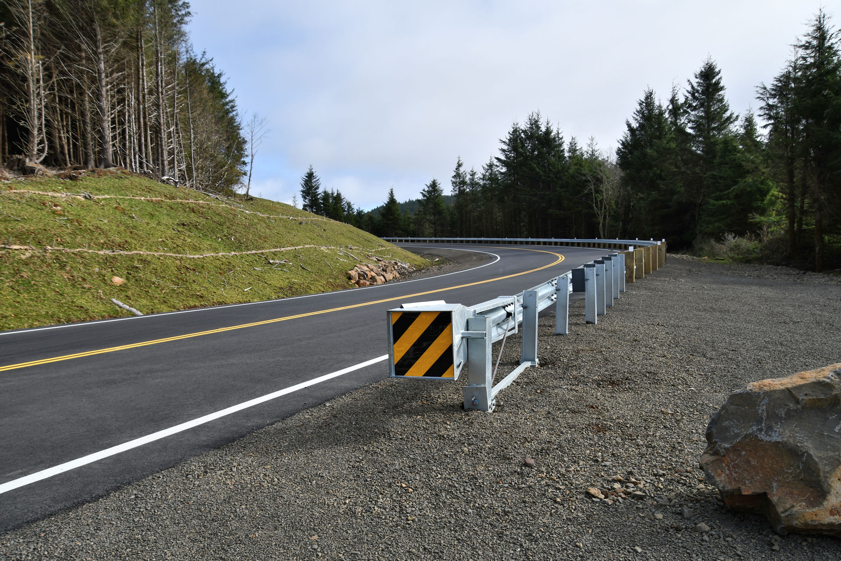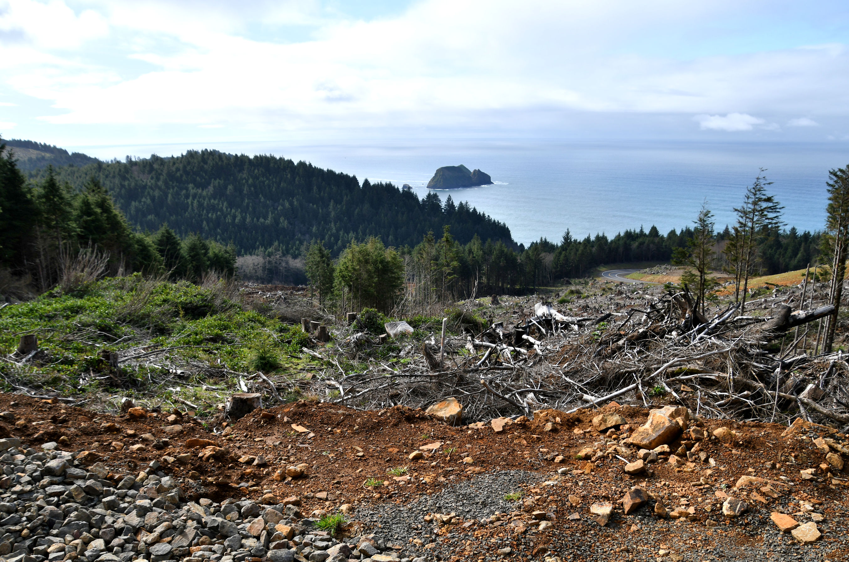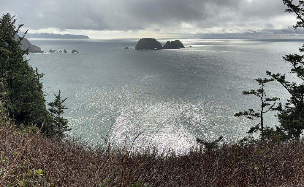 Saturday, February 24, the weather was good, and Pedro and I decided to hike the cape trail nearby. For as often as we have hiked trails along the coast, Cape Meares State Park was one that neither of us had hiked. We followed a clearly brand new highway to the cape, wondering if this new route out of Tillamook was constructed due to frequent landslides on the coast that wreck the roads every winter. This one did provide us with an impressive vista on the way, as you see in the photo below.