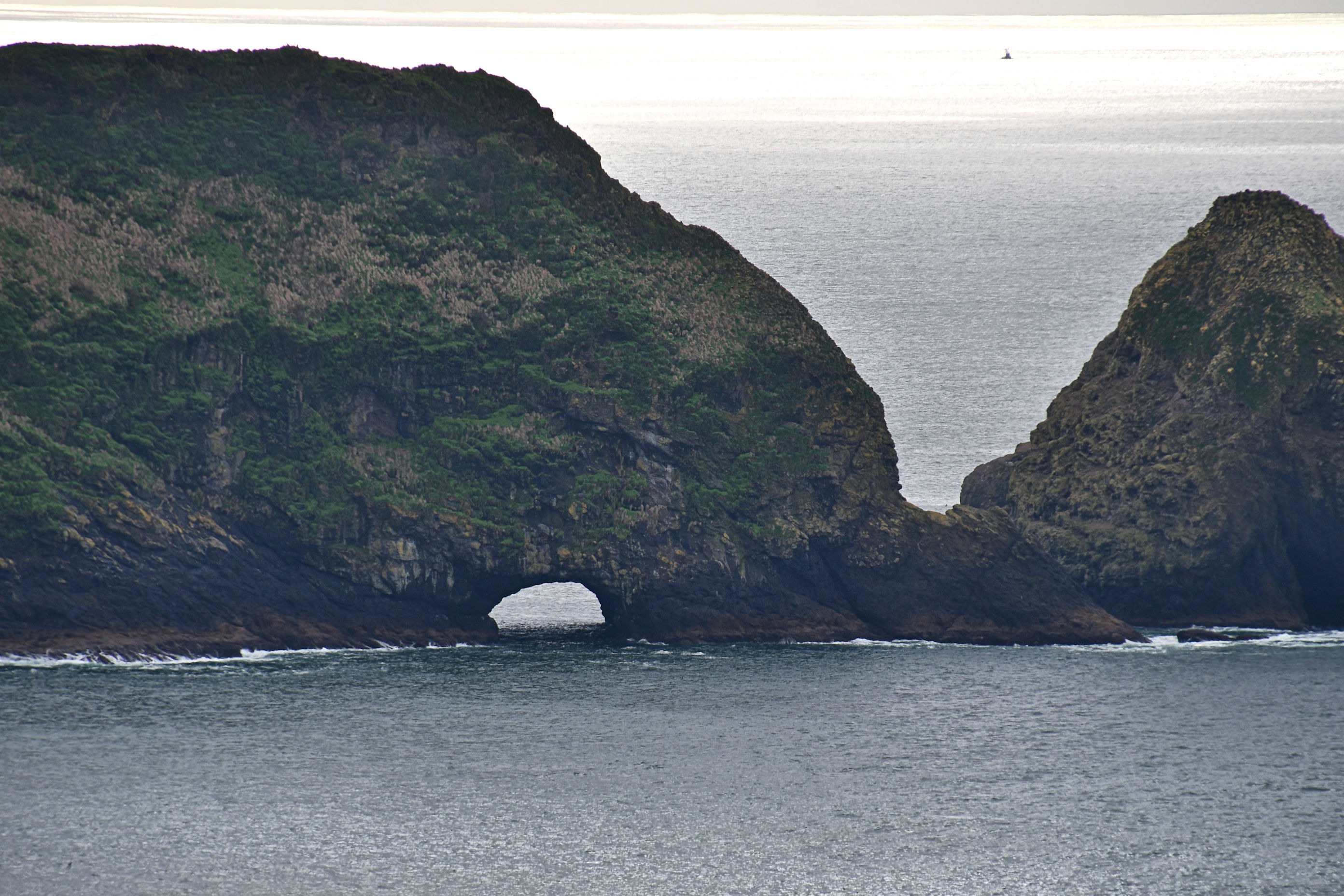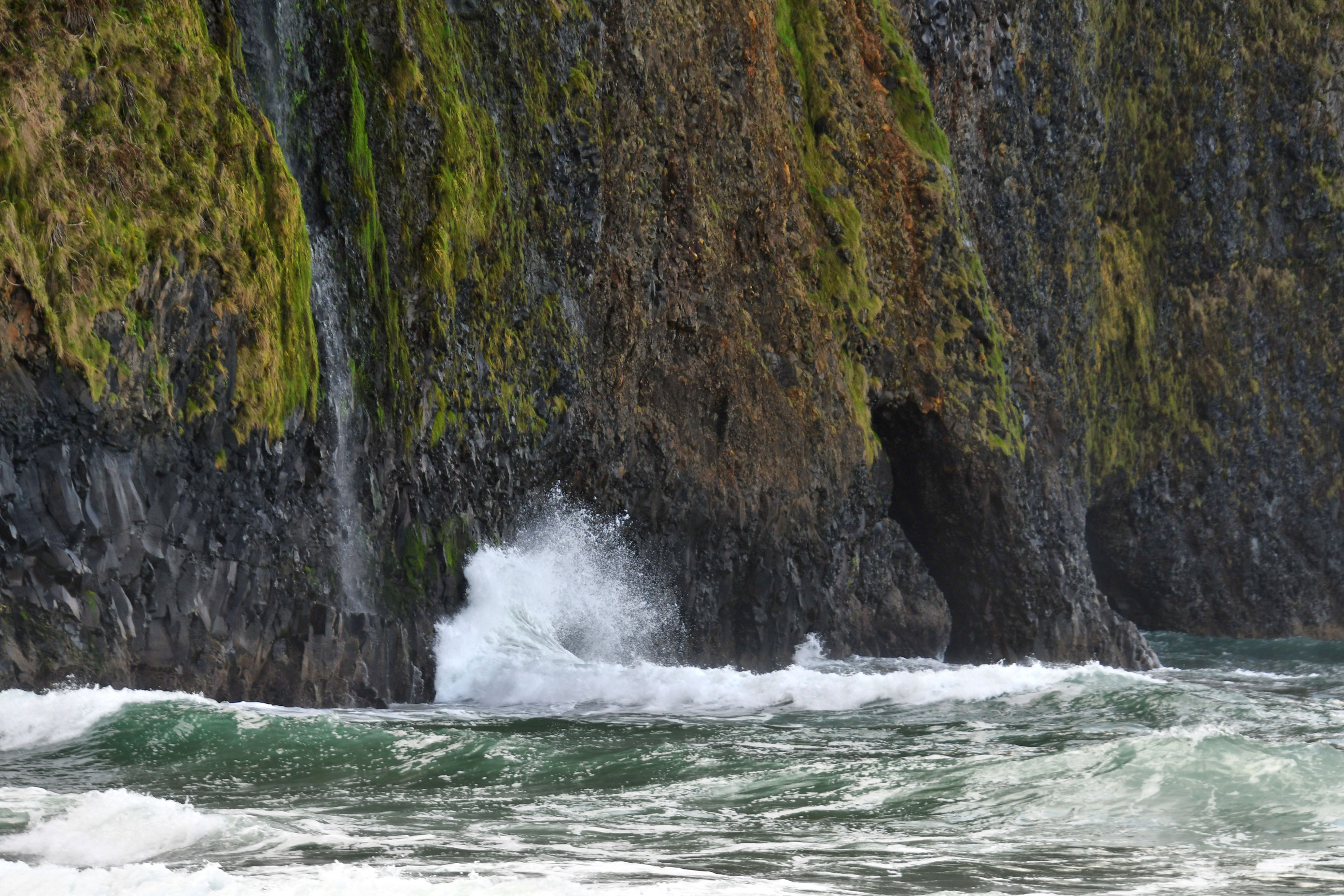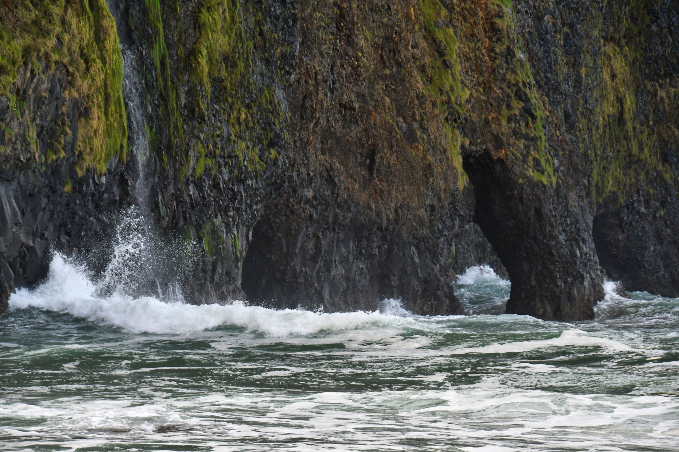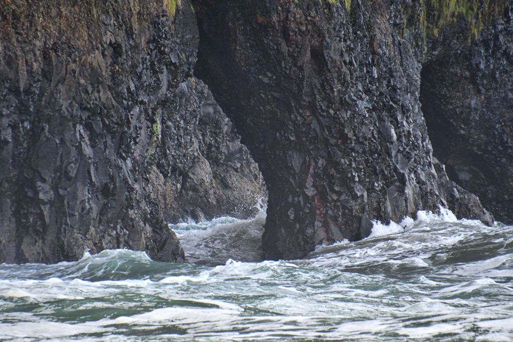 We stood for some time on the rocky beach and listening to the clicking of the rocks as the waves rolled them around and against each other. We gazed out to the horizon and wished for more heat as the cool sun peeked through the low clouds. We watched waves upon waves crashing against the wall. And then I noticed an arch!