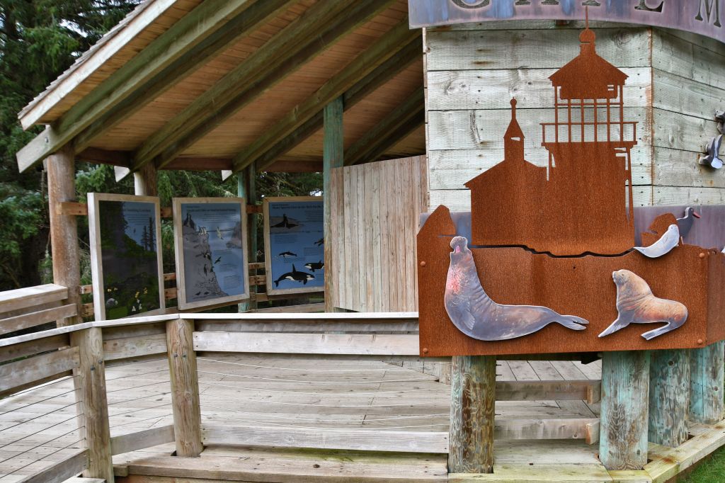 When we had absorbed enough of the crashing waves to sustain us, we turned back and climbed the zig zags again, back up to the top of the cliff. We hopped into the Jeep and drove down Lighthouse Road to the paved parking lot for Cape Meares State Scenic Viewpoint. In that parking lot was a new structure that caught my eye. It must have been built within the last few months, because the wood was barely weathered.