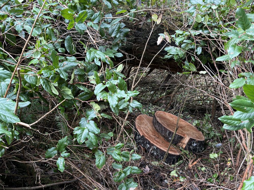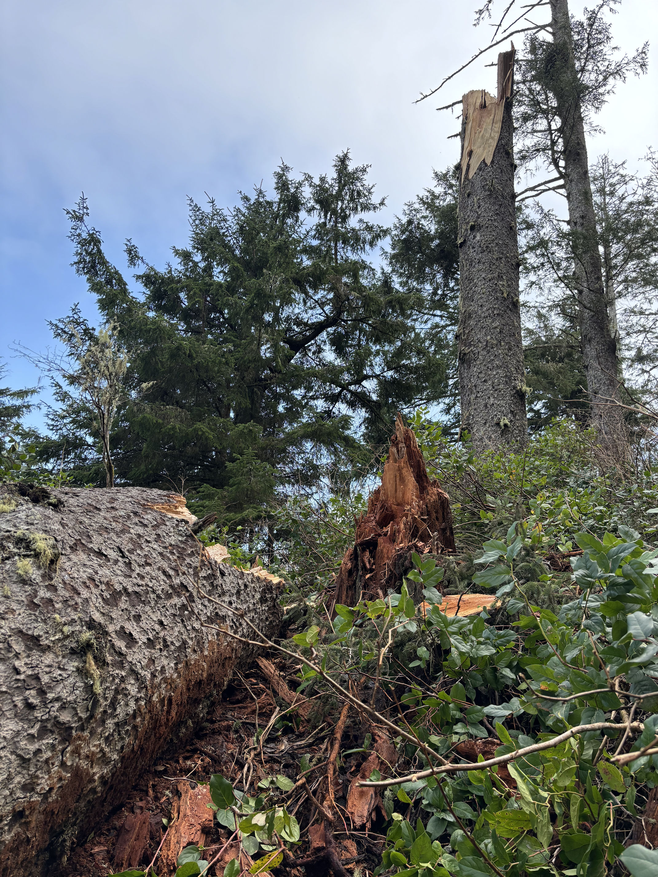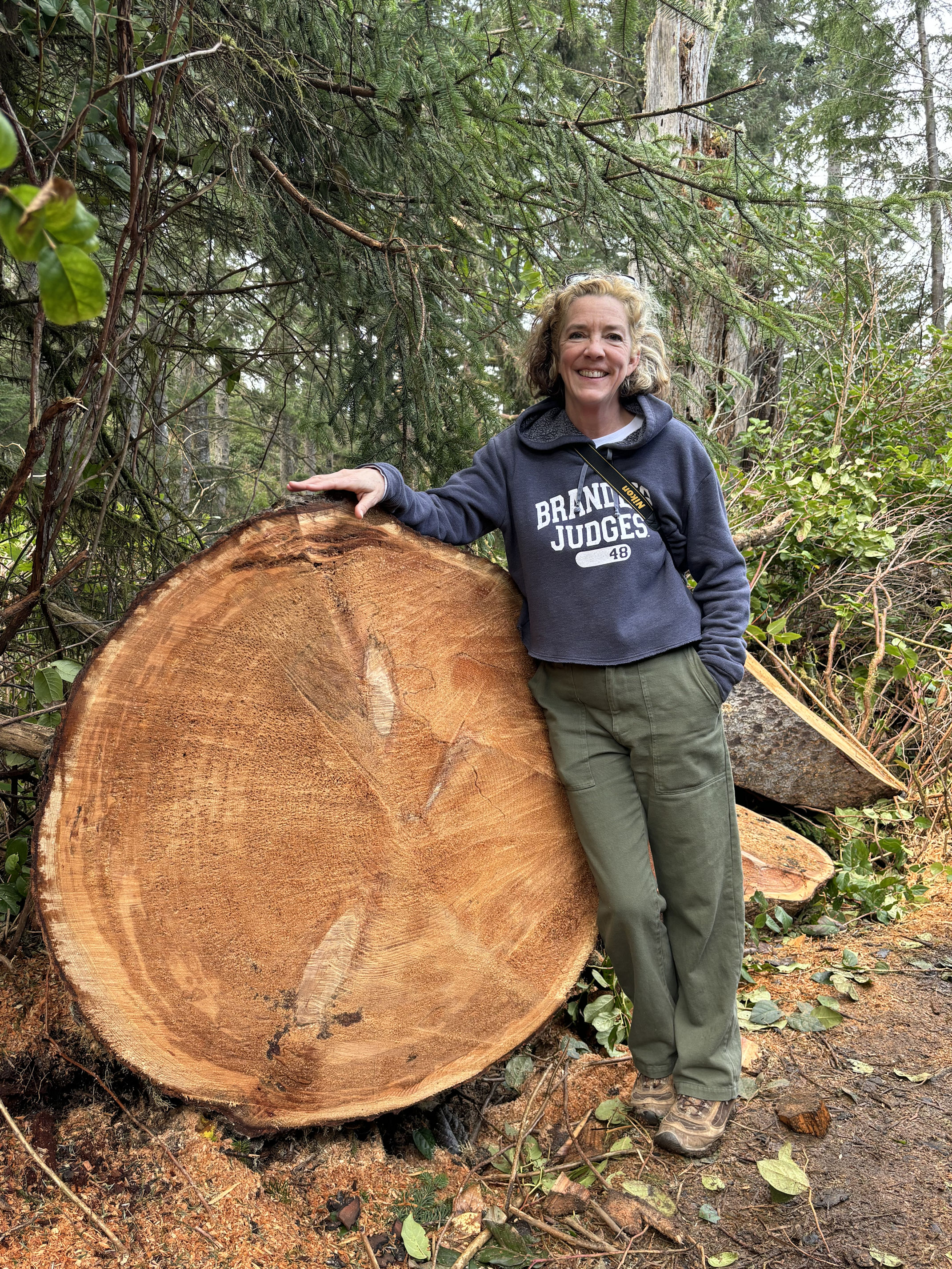 When a tree snaps off its trunk this high above the ground, that is usually because of wind. It takes a pretty massive wind event to do this to a healthy tree. But it takes something even stronger to snap a tree of this size. It’s giant! Chainsaws had cut a path through it and I stood beside it to model.