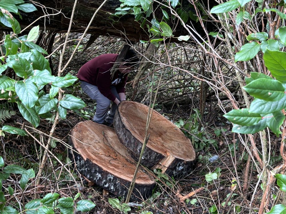 We walked farther along the trail and saw some more pieces of it, cut into discs and rolled off the trail. They were massive and I took a photo.
