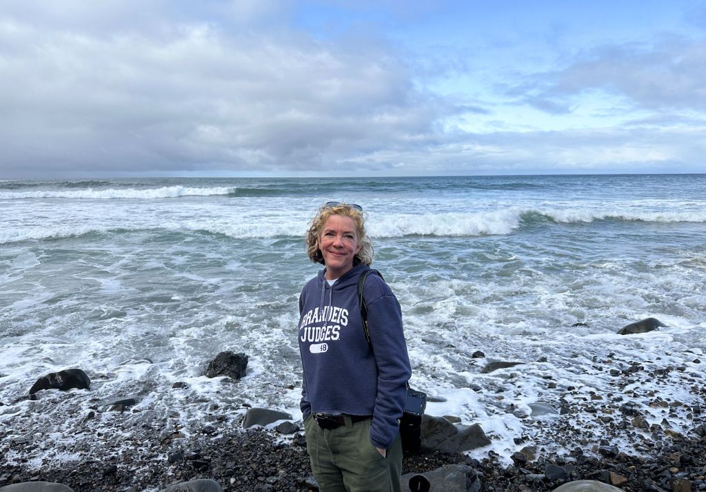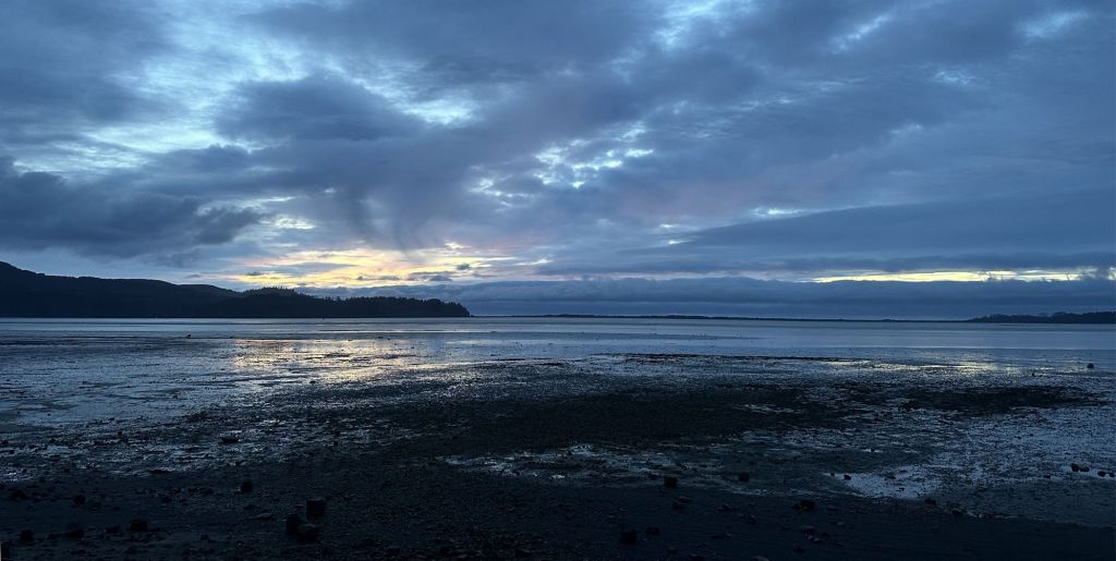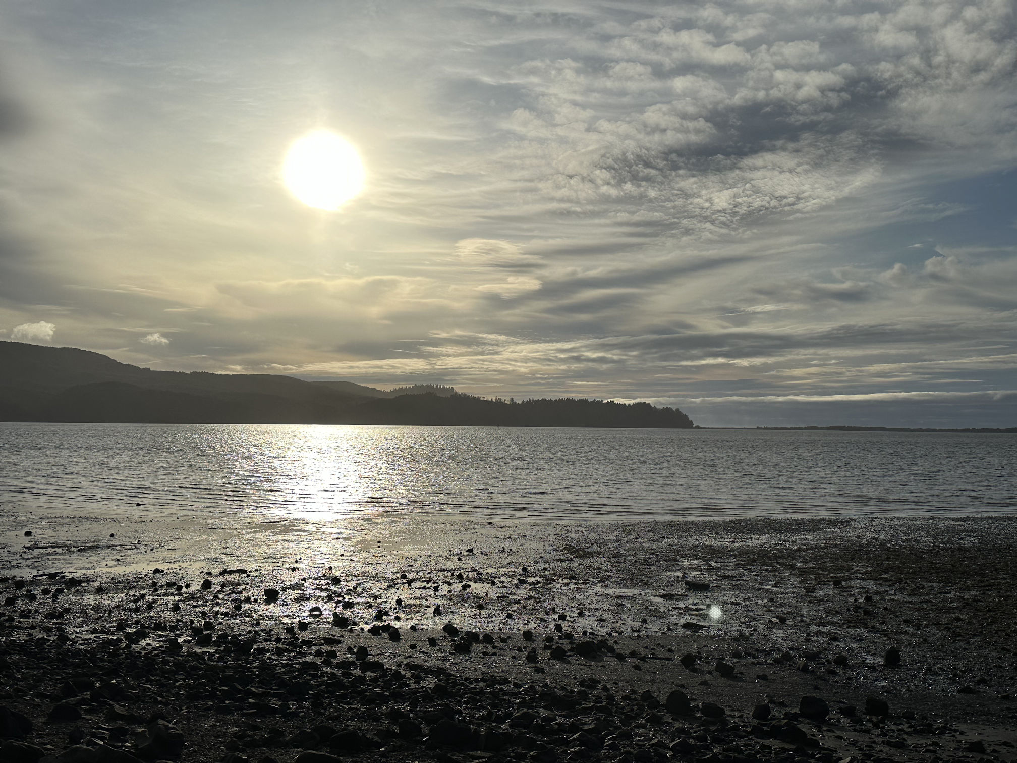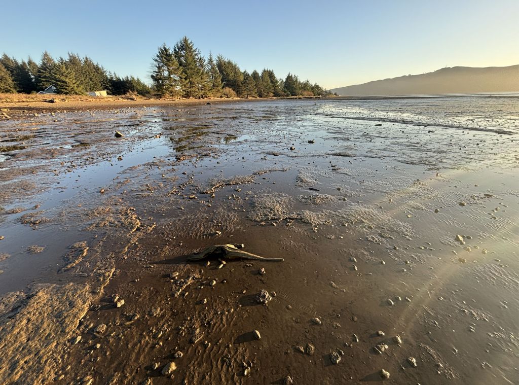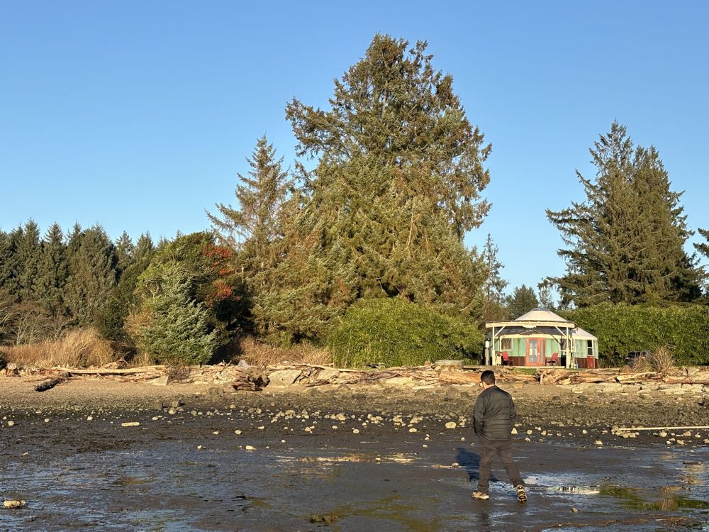 Pedro exploring Tillamook Bay in front of the yurt on Friday.