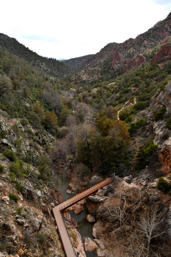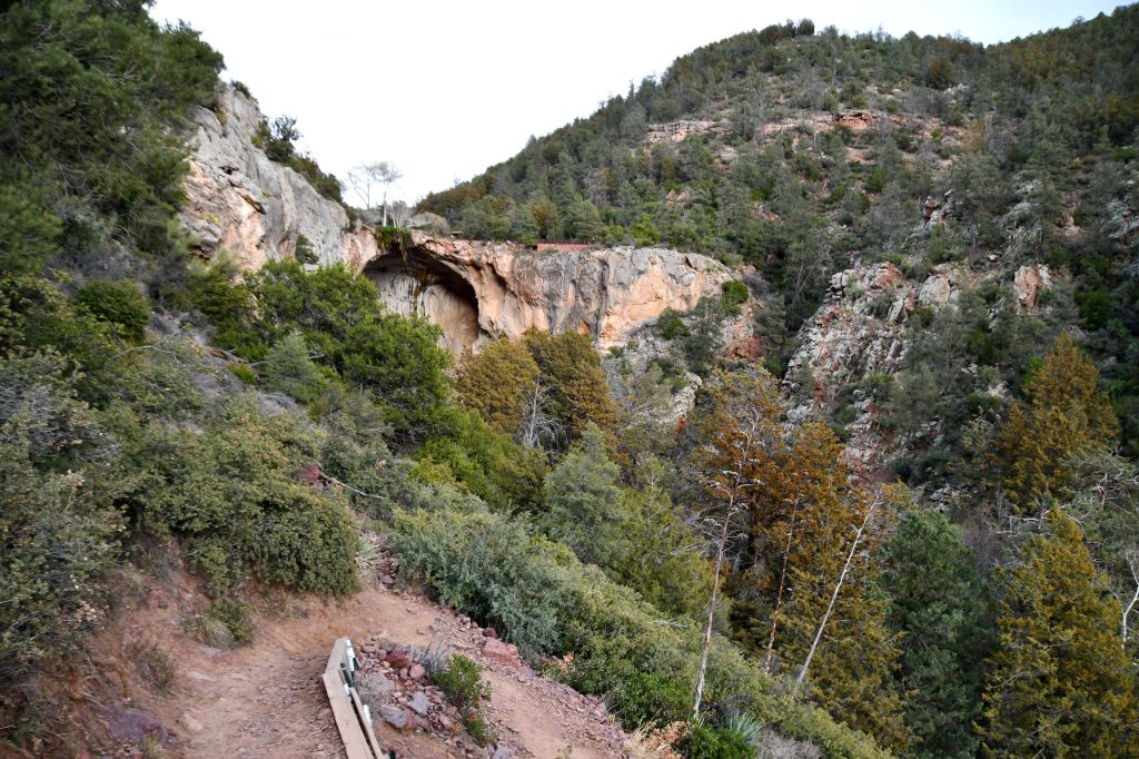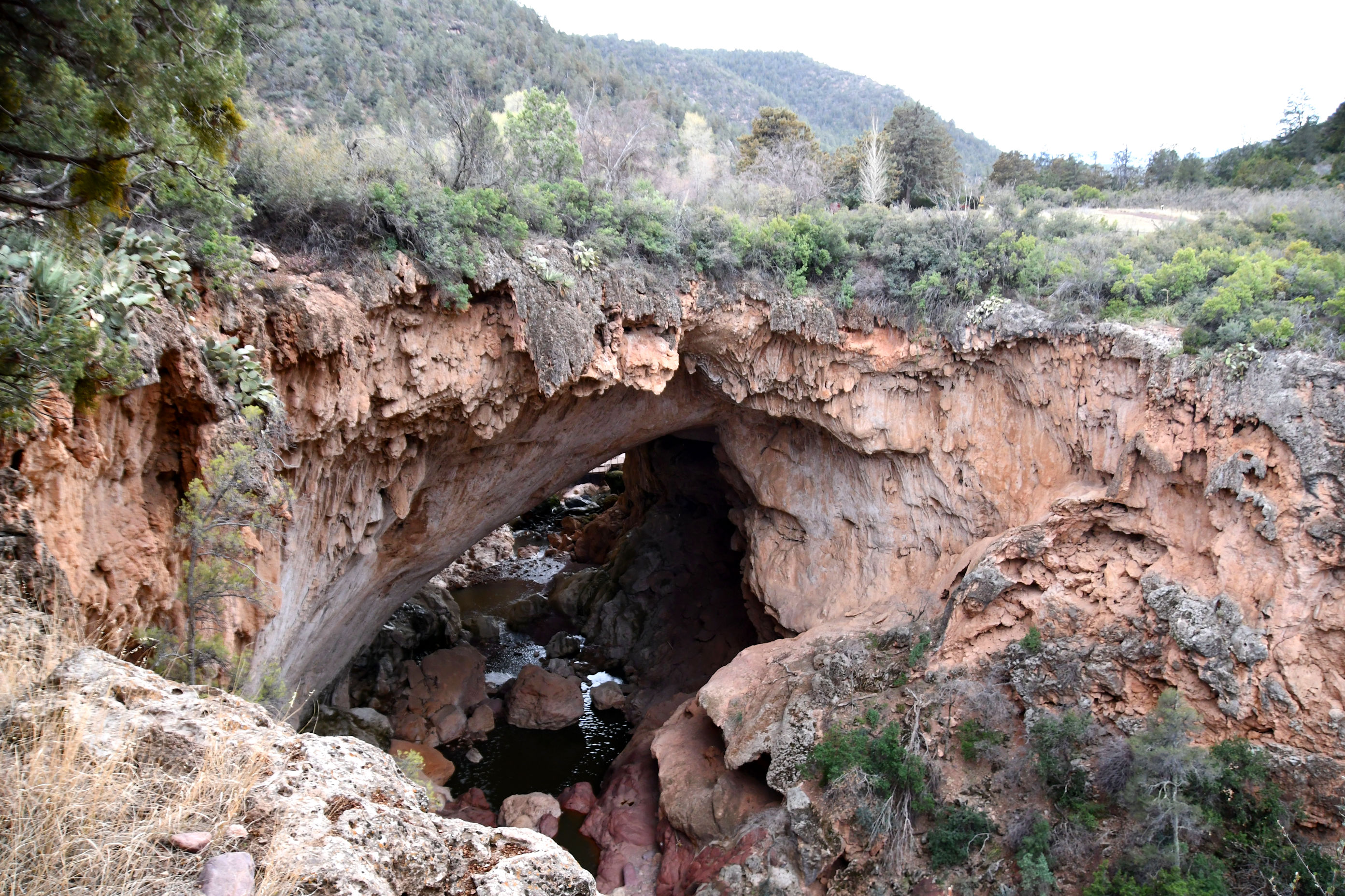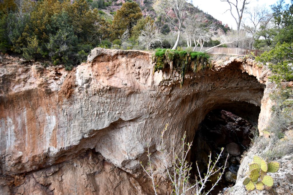The Tonto Natural Bridge is one of the world’s largest known travertine bridges. It is 150 feet wide, and 183 feet high. The tunnel inside is 393 feet long, and I guess they mean the distance that Pine Creek travels beneath the arch? It took thousands of years to get like this, and is still undergoing the formation process, like the baby arch I showed above.