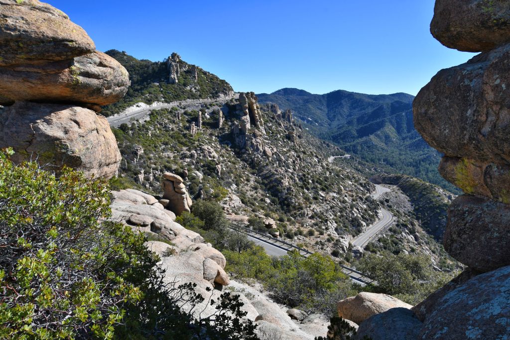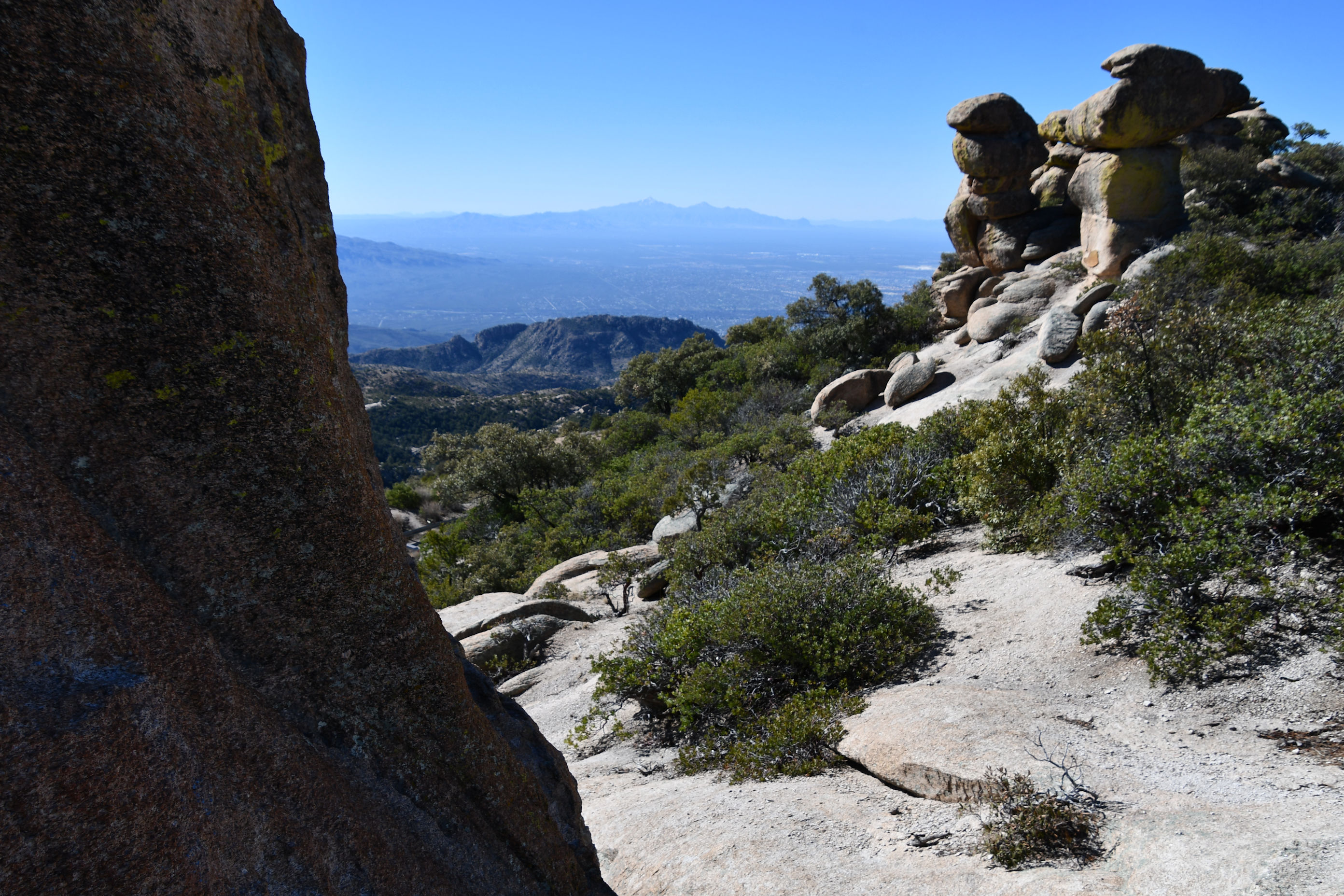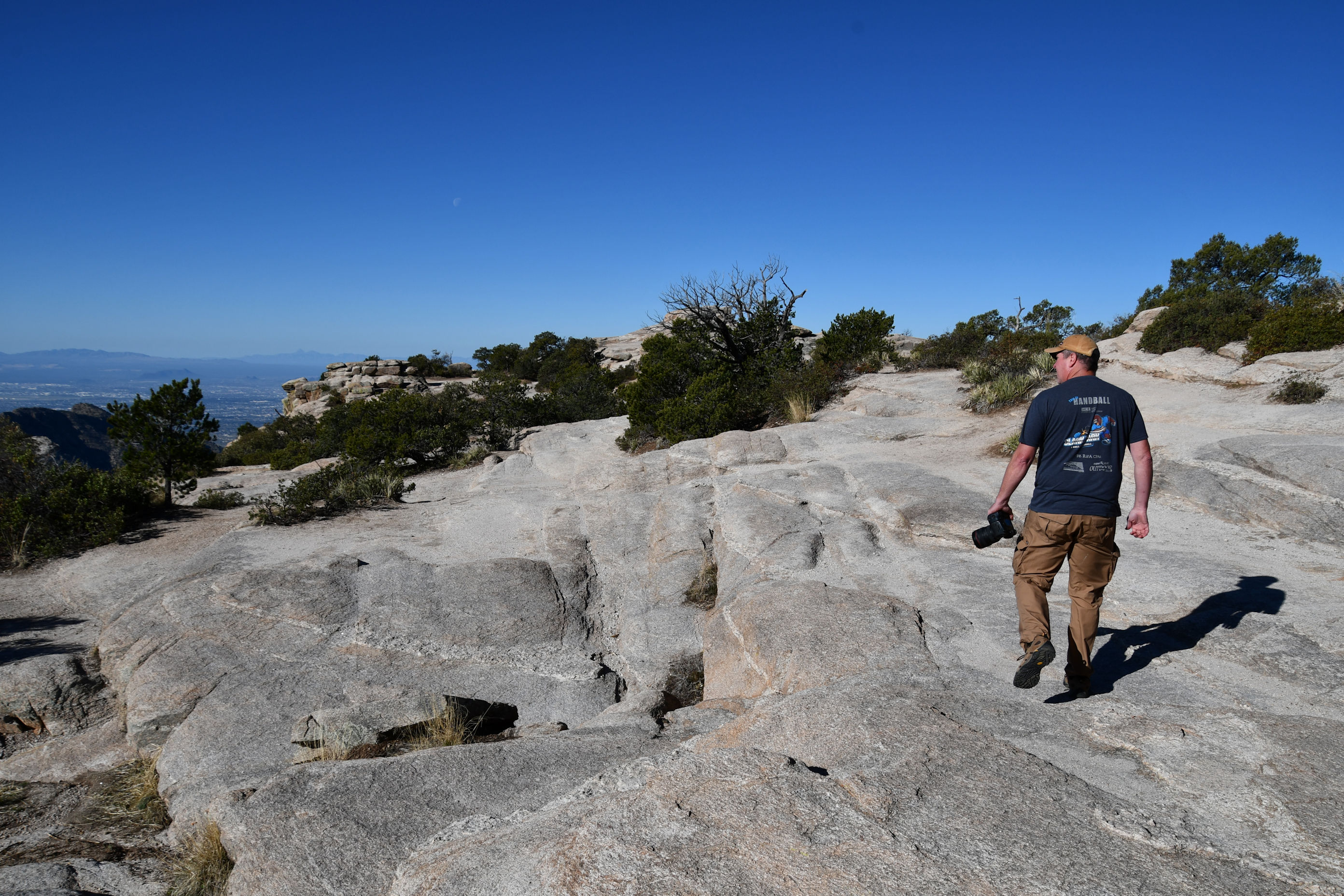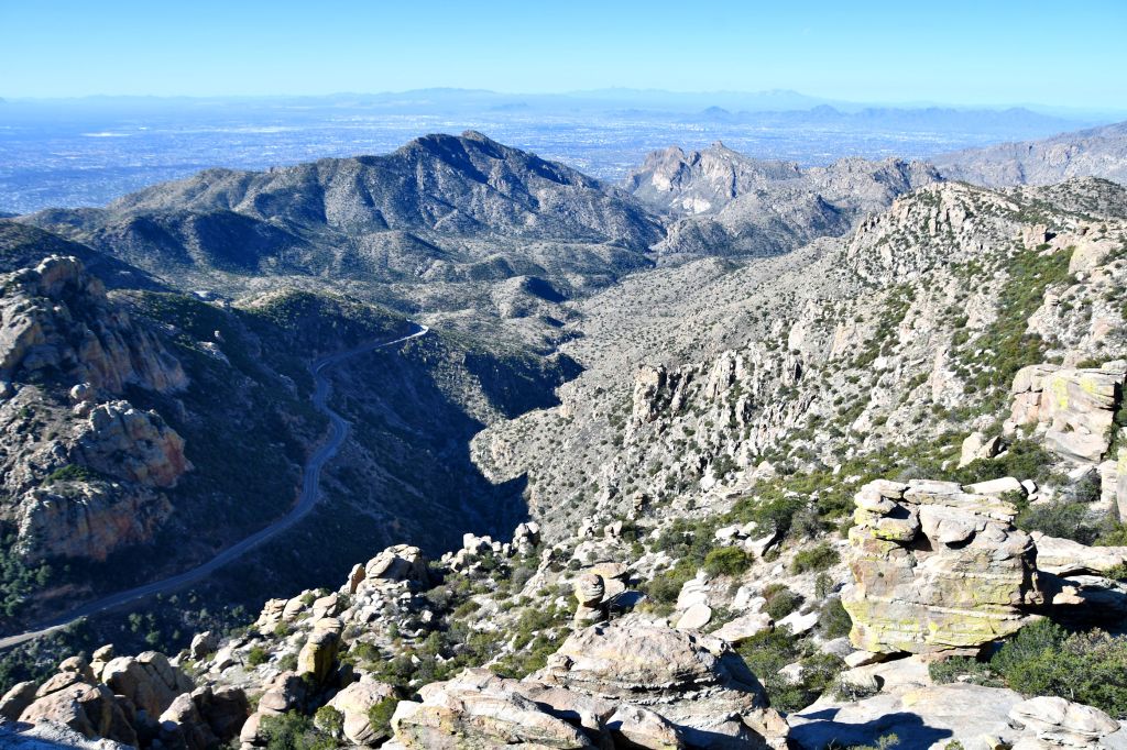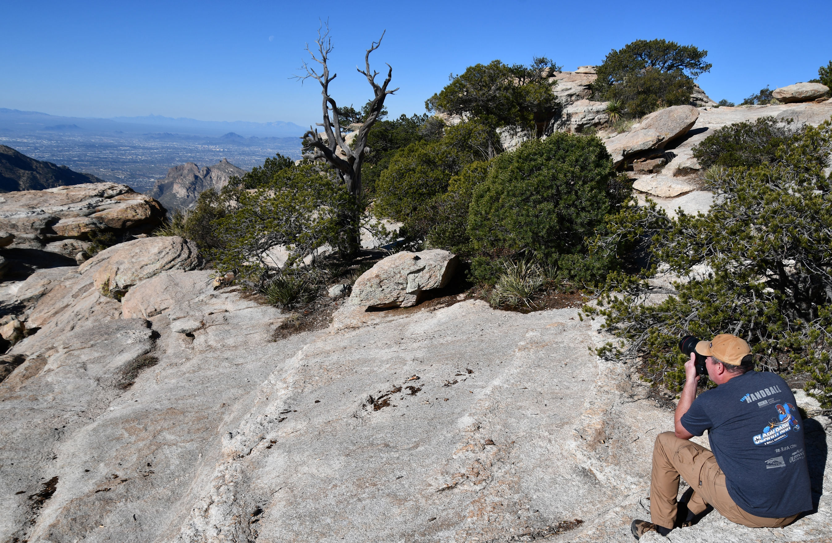 We drove up Mt. Lemmon Highway and parked. When we arrived, we were the only vehicle to pull over. By the time we left, there were a dozen. In the photo below, you can see some tiny people walking on the rocks, sort of near the center of the photo (one is wearing yellow). That is where we took most of the shots you see here. We struck out across the rocks almost as far as we could go. That provides an outstanding view of the valley on three sides of the promontory.