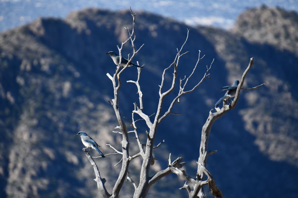 The first birds of the day that visited us were groups of Mexican Jays. Mexican Jays live in family groups of up to 25 individuals. They are mostly found in Mexico, but do have territory that ranges along the shared state border of Arizona and New Mexico, and they can cross the country border into Texas as well. These look a lot like the Scrub Jay that I am used to seeing in the mountains of the PNW, and the two species’ terrain does overlap.