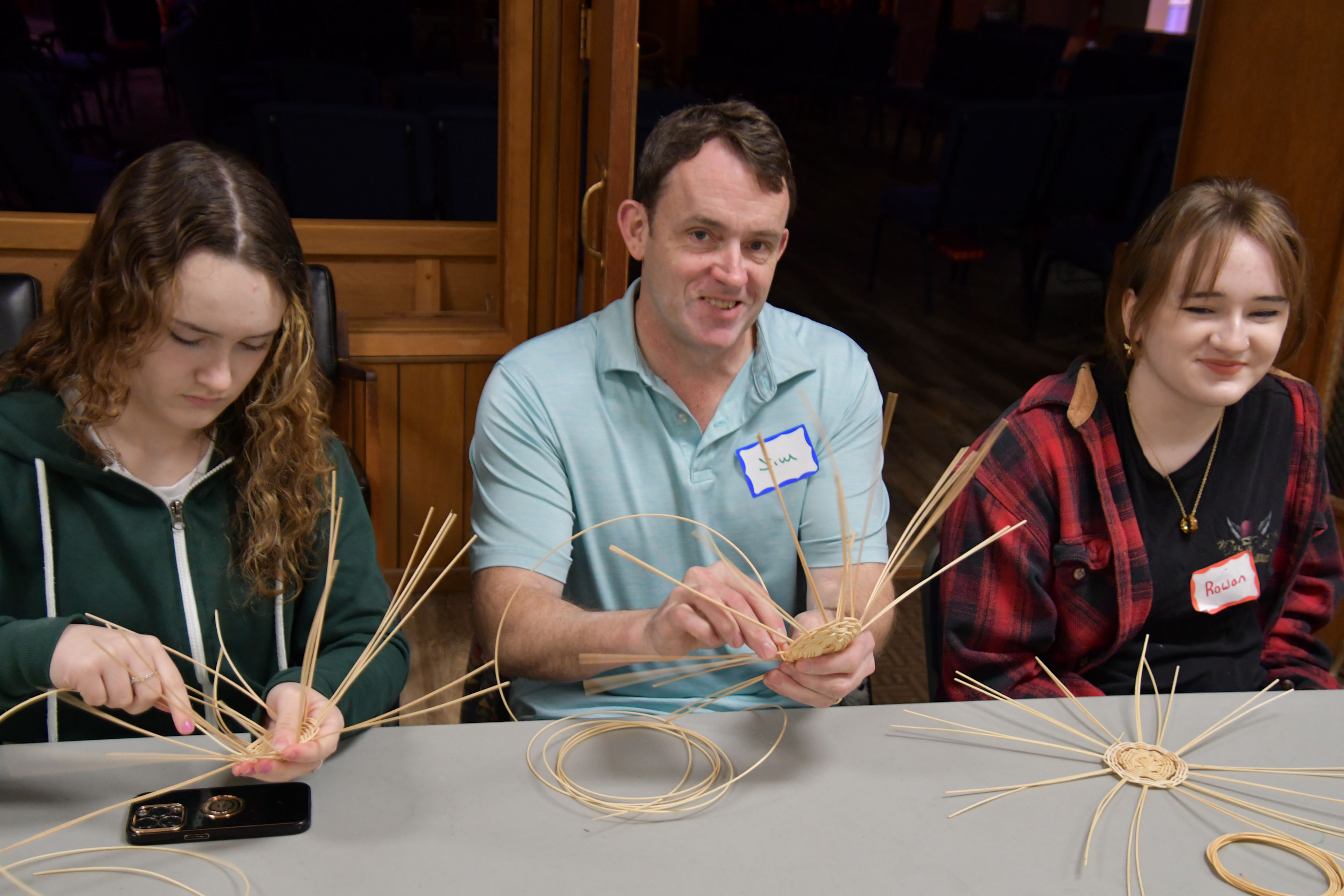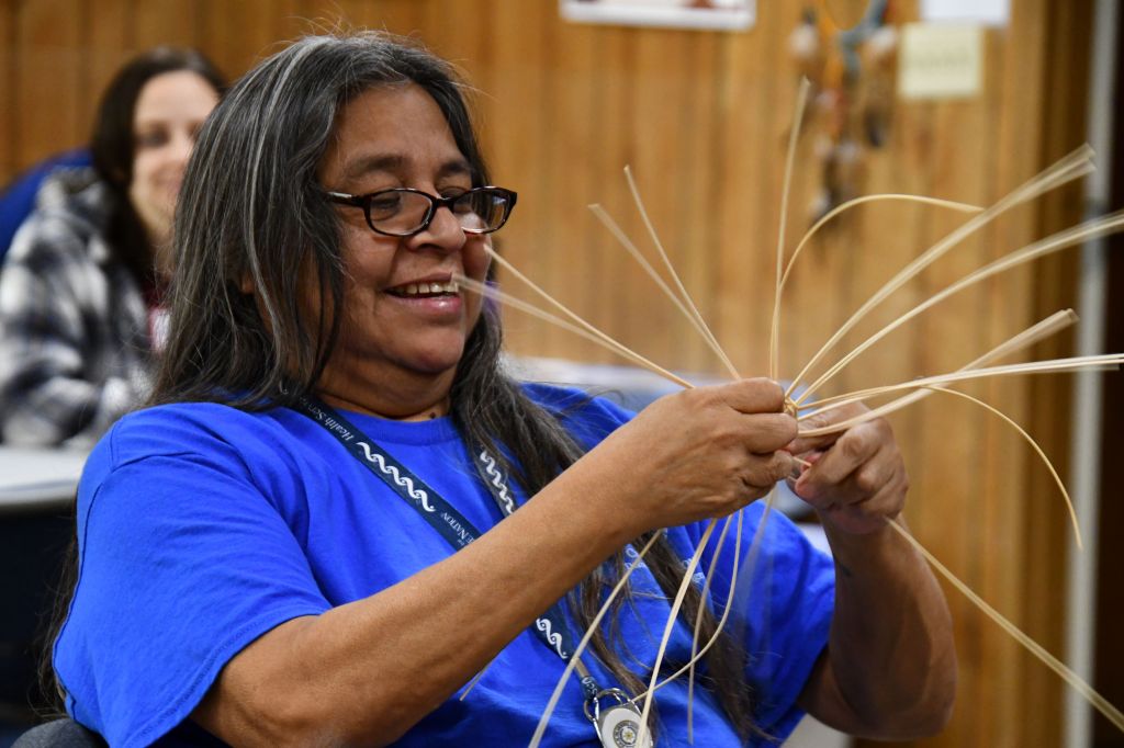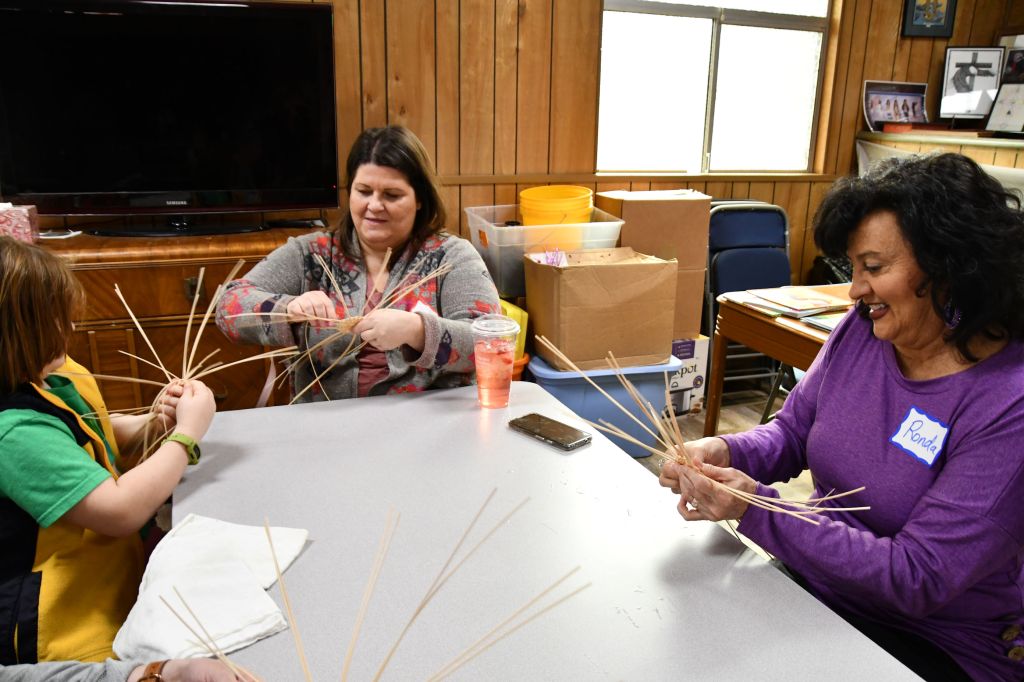 When we arrived, Barbara had already prepared supplies for us (the supplies were also provided by Cherokee Nation), primarily soaking reeds in tubs of water. In the interest of time, since our meetings typically last only two hours, Barbara had begun many basket starts, which are the small grid of reeds at the bottom of the basket. She said it’s tricky for beginners to learn this, so she gave us a head start.
