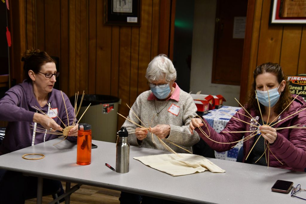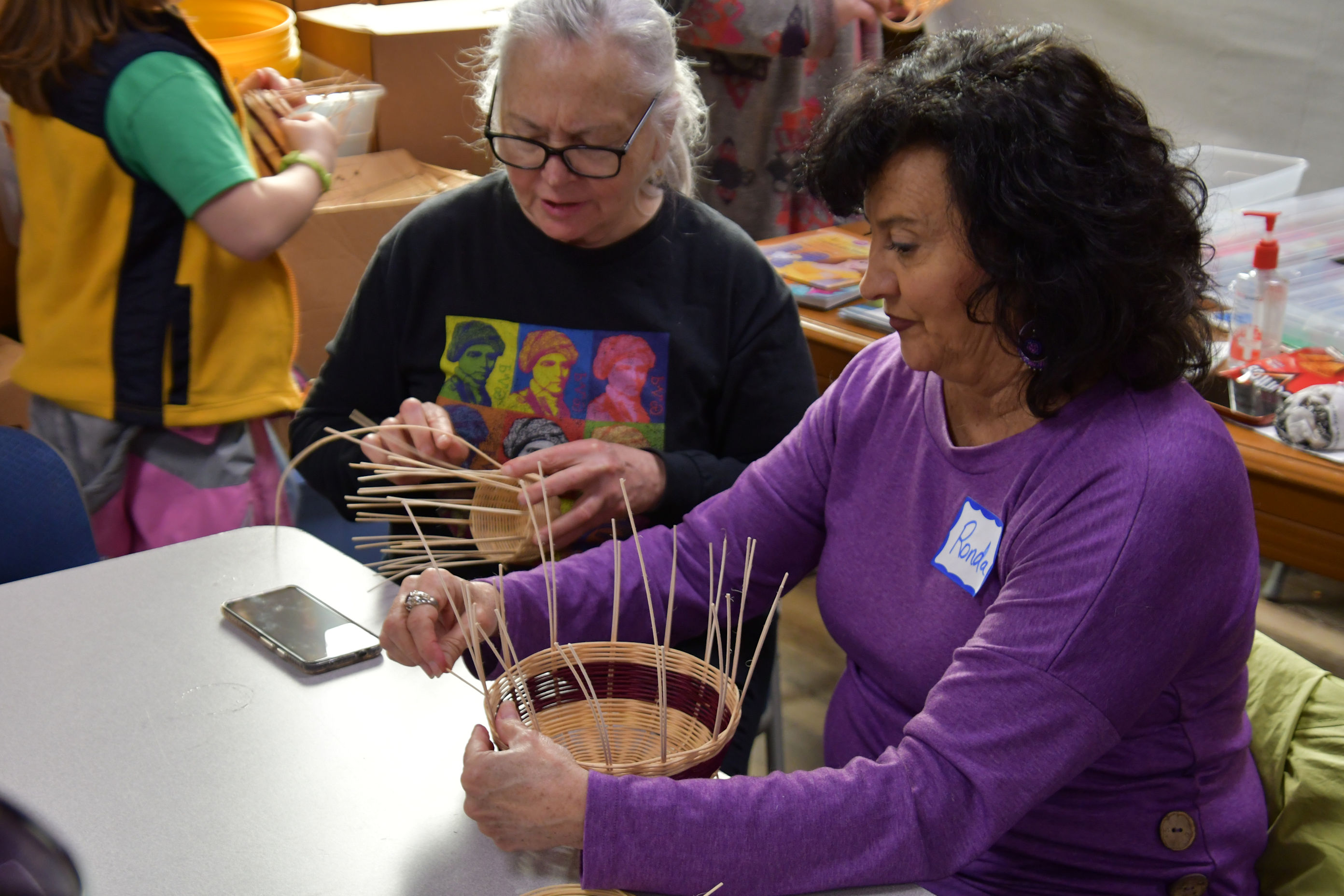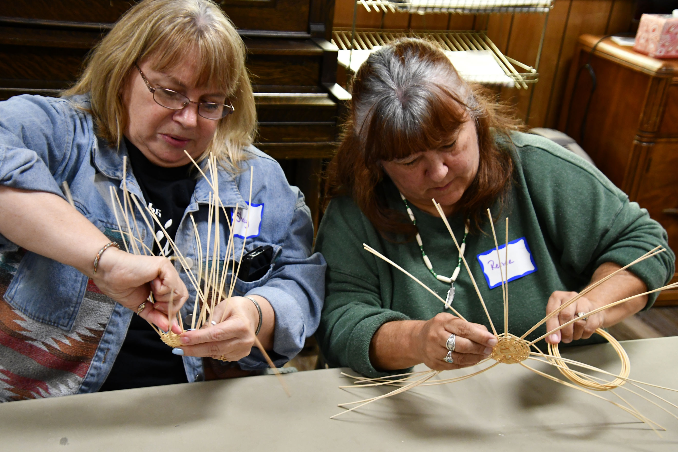 Brenda Mallory and Rhonda Rutledge are nearly done with their baskets.