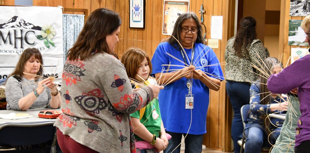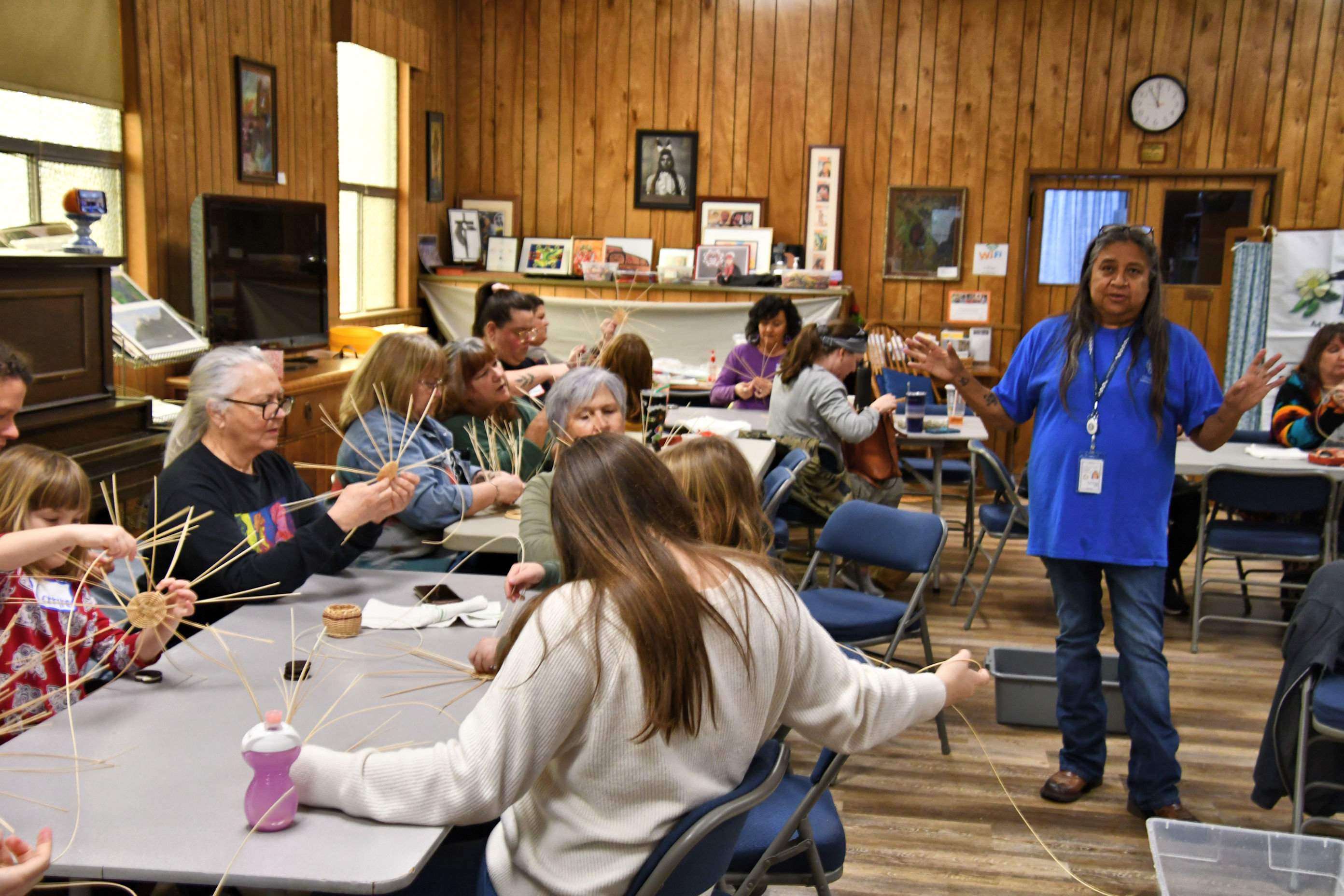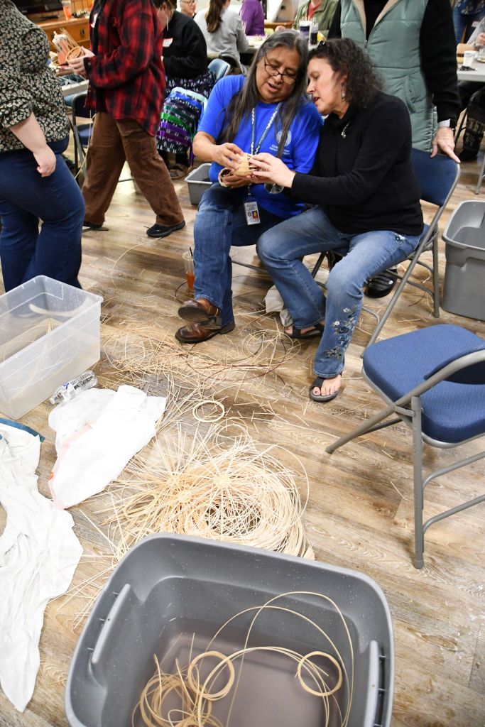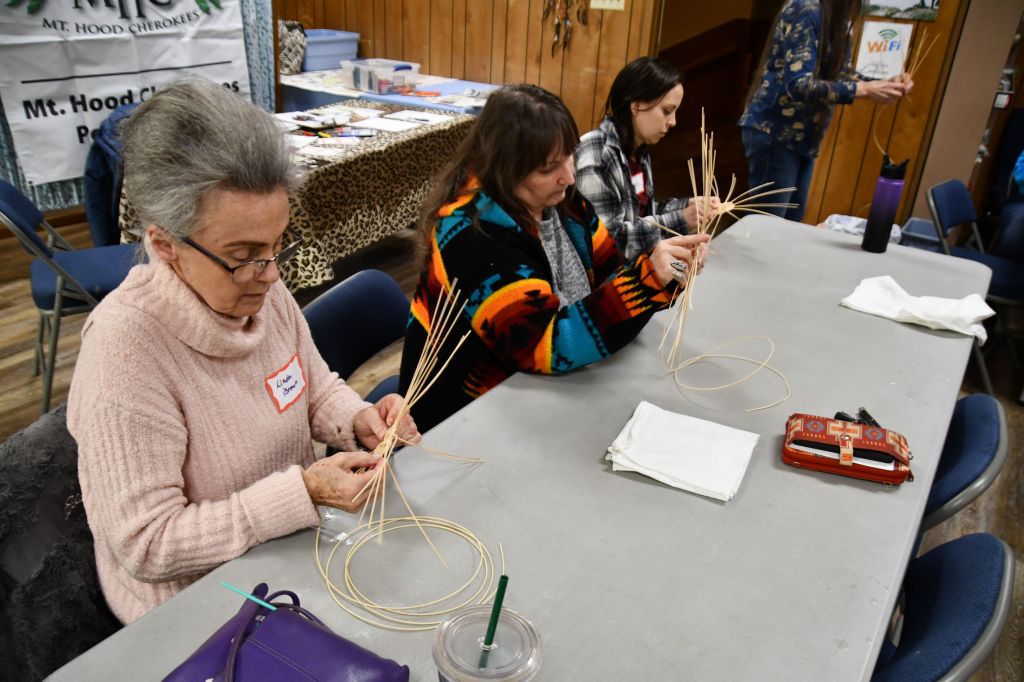 Our local Cherokee group has been having the best meetings lately. I’ll tell you about basket weaving here, and next I’ll tell you about the field trip to view Pictographs. I call them “meetings,” but that’s just the word I use to describe our monthly gatherings. We gather at an indigenous Methodist church in North Portland on the second Saturday of every month, and our Council always has something specific planned for us. Sometimes it’s a show-and-tell, when we bring our Cherokee artifacts, photos, or memories, and talk about what it was like growing up Cherokee. Sometimes we talk genealogy, bringing a list of family surnames, and books of photos and relationships and often people find their cousins! We have played Cherokee Bingo, where we learn the characters of the alphabet and how to write and pronounce the syllabary, invented by our esteemed leader, Sequoyah.