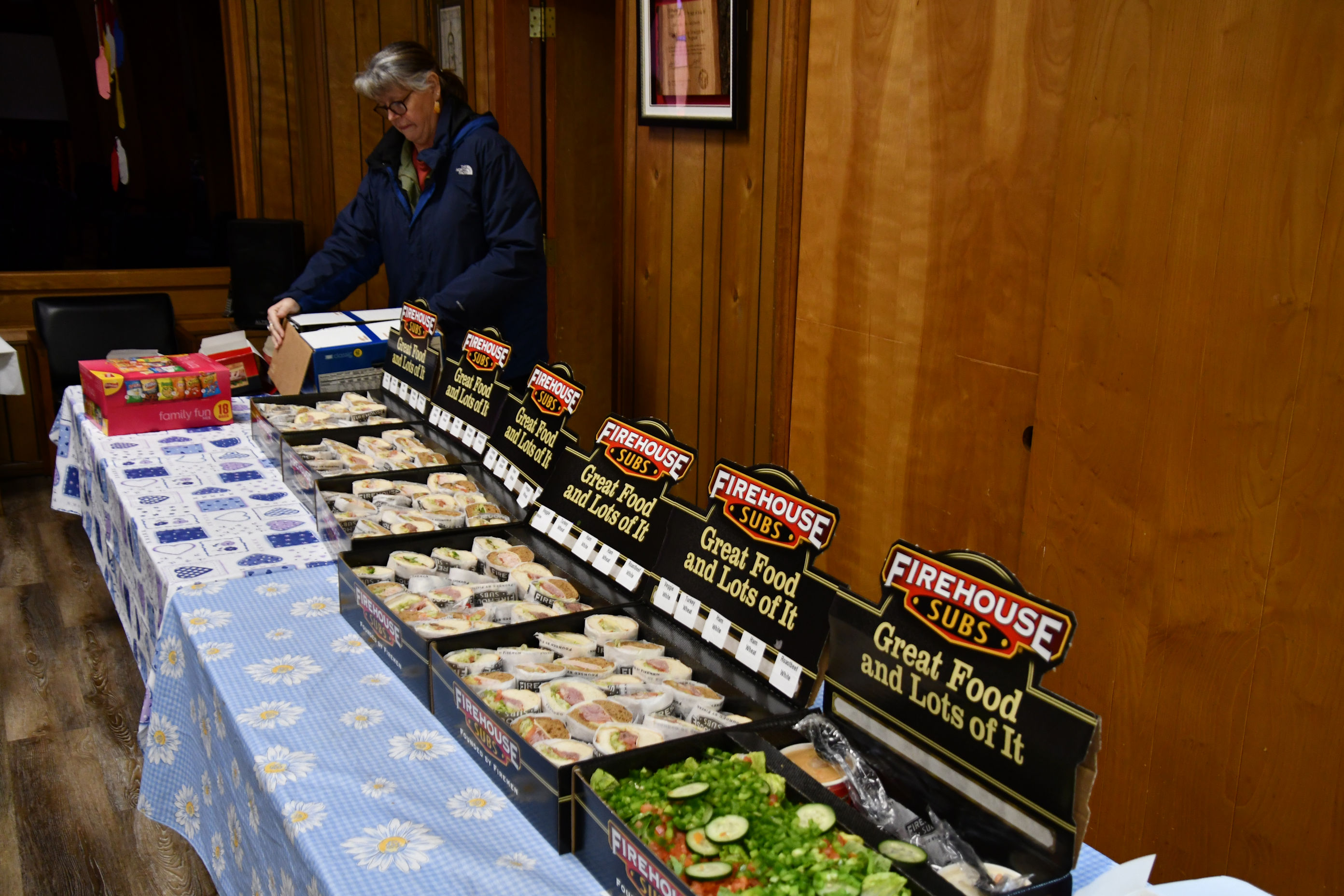 Usually, we bring potluck to the meetings, but this one was catered, so we could focus on building baskets.