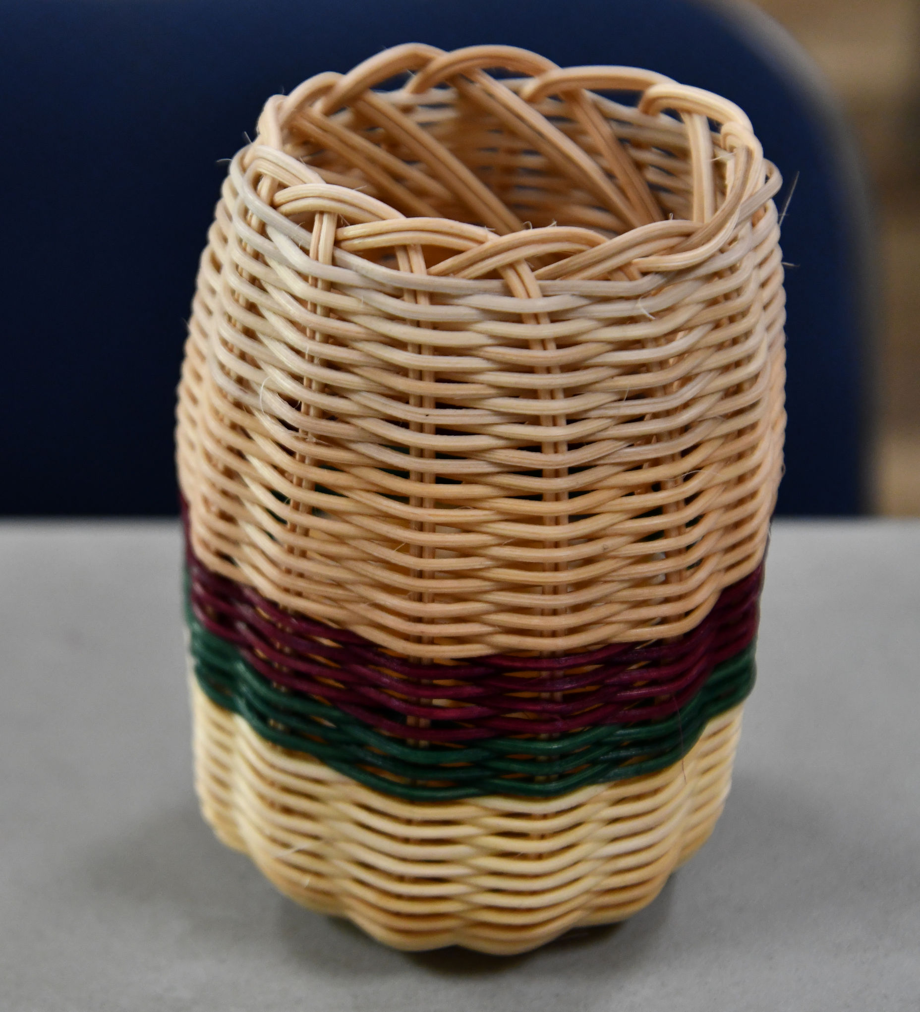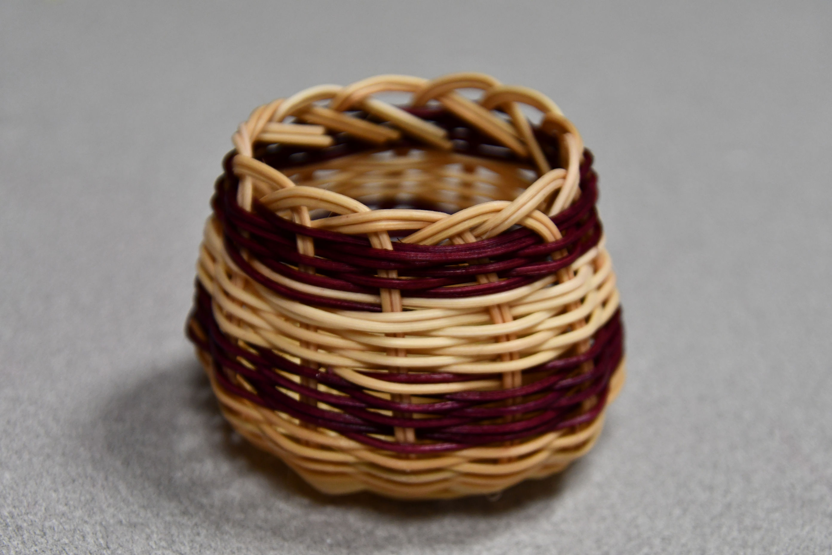 It was fun when Barbara turned our attention to the coloured reeds. Once we knew the basics of weaving, we could be trusted to add colour. To add a new natural or coloured reed, we just laid it beside the one we were about to use up, overlapping an inch or two, and simply copied the pattern of the weave. It was easy to tuck the wet reed ends into any gap to make the outside smooth.