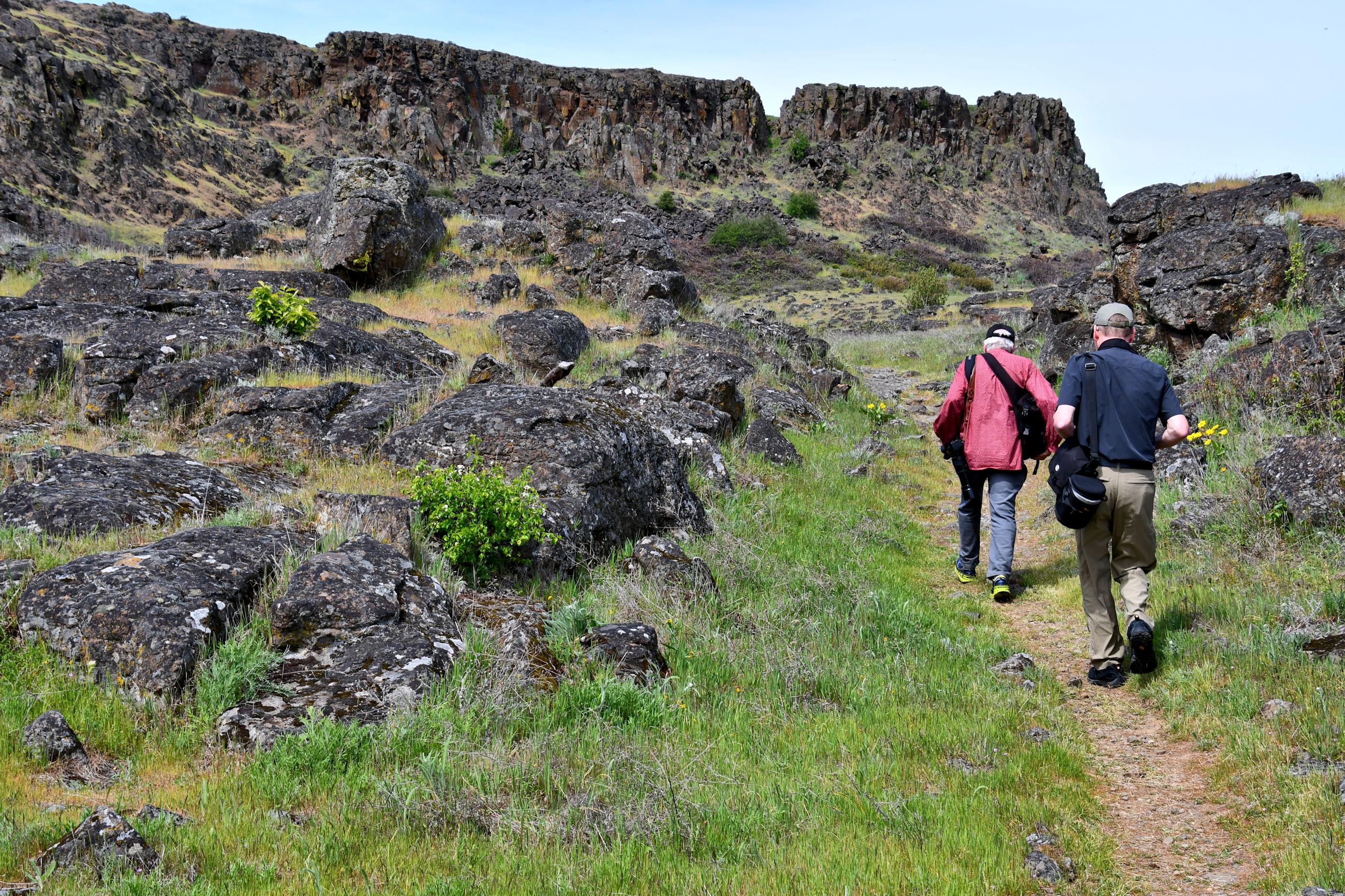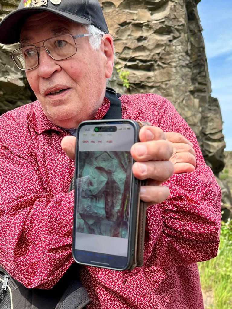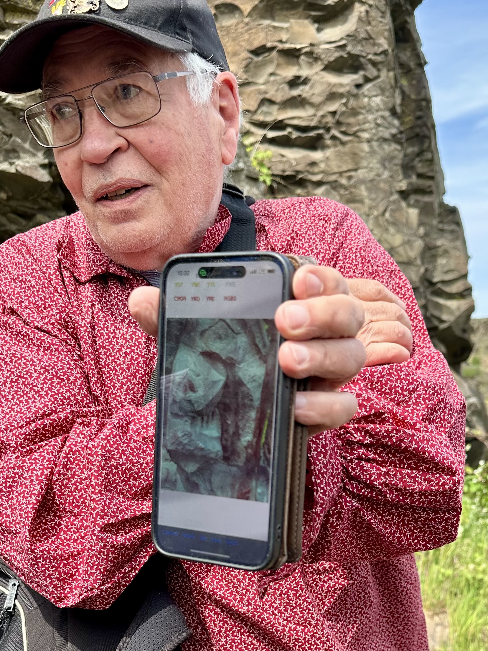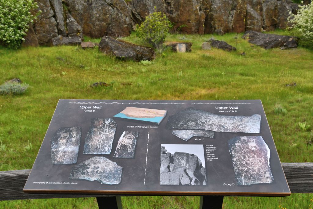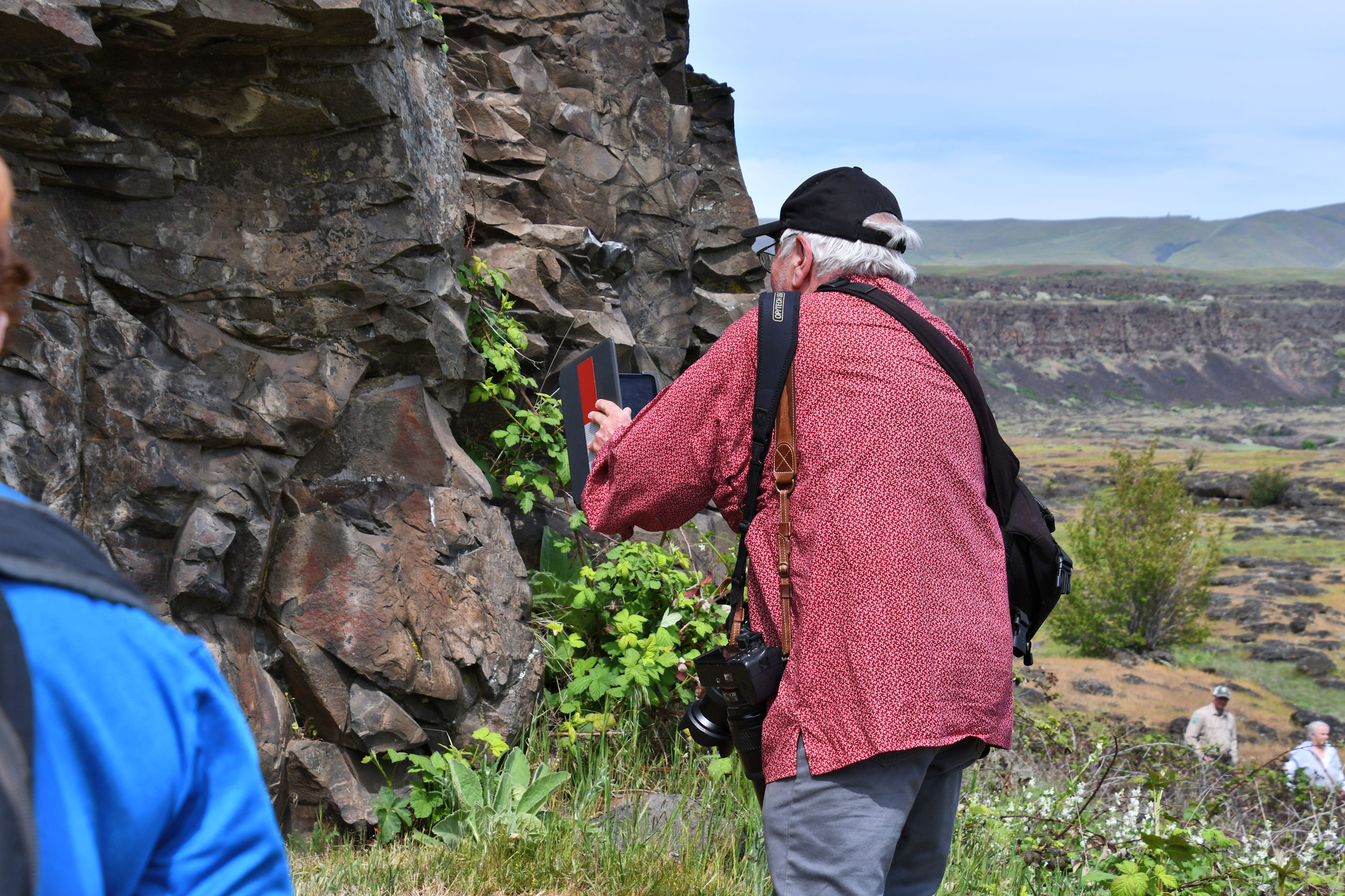 In 1993, vandalism at the site was of such concern that the pictographs are now protected by the State of Washington. The trail to reach them is locked and people can only visit with a park Ranger or an authorized docent. Those who are interested in seeing the site must call ahead and make an appointment with Columbia Hills State Park. We had both. Ranger Brock came to unlock for us, and Joe Cantrell is a docent.