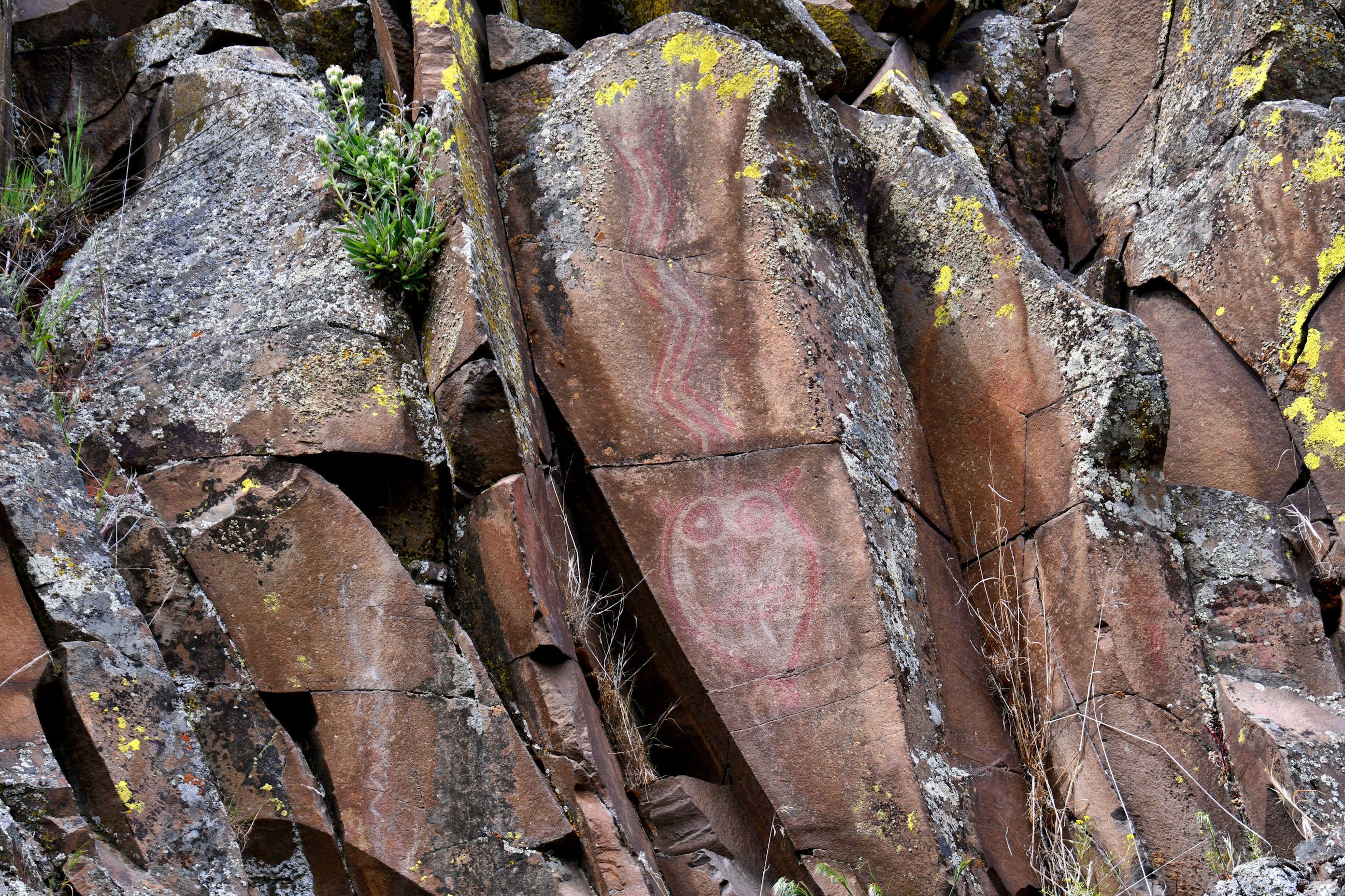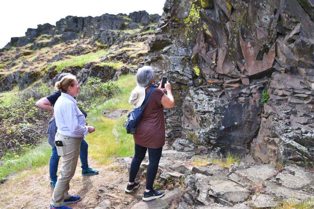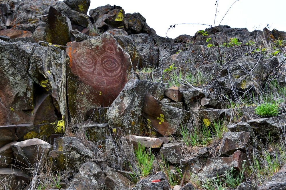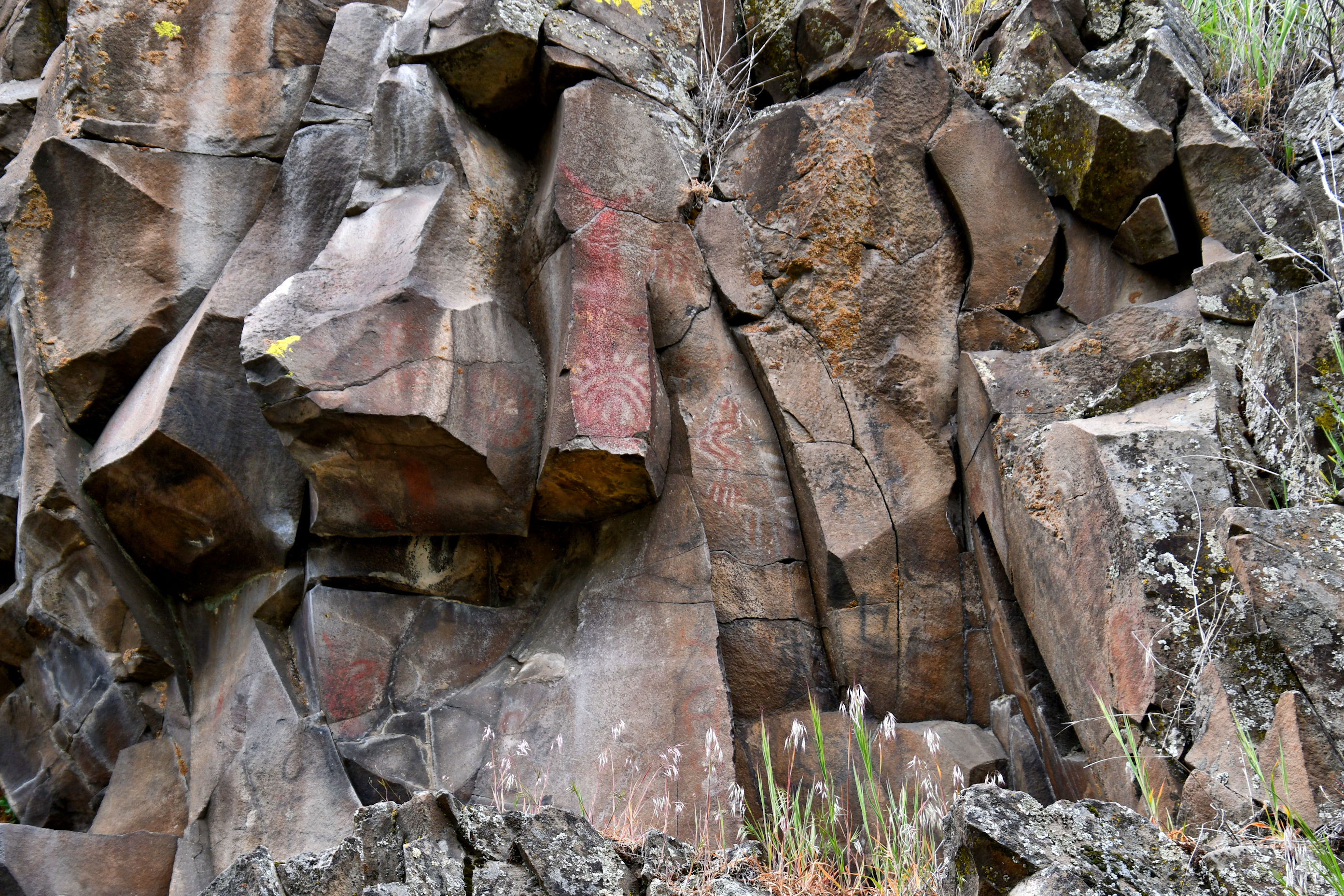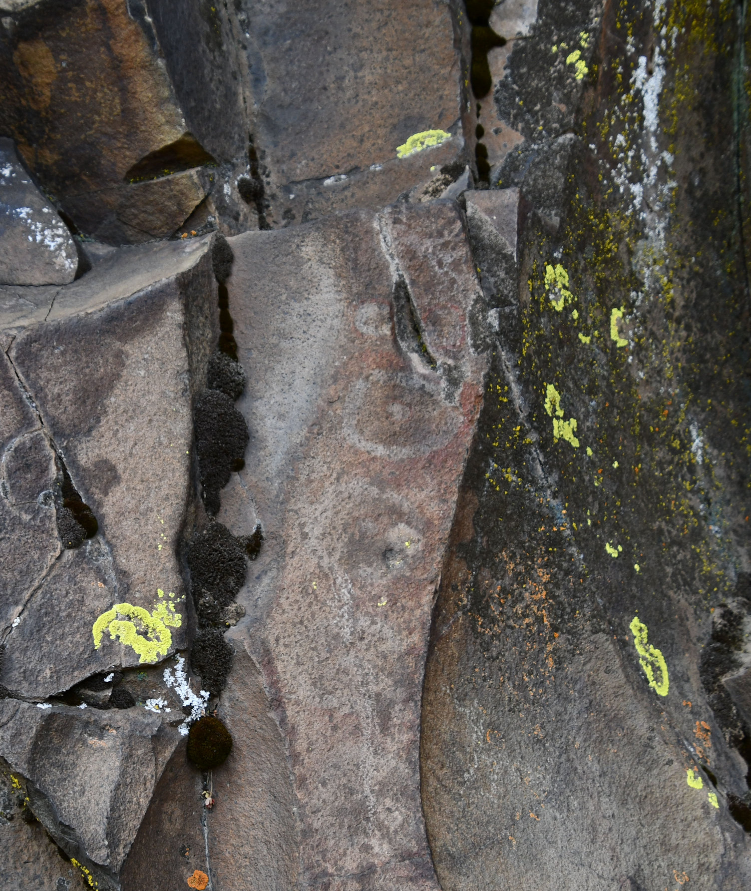We separated into two groups to make it easier to get up close to the rocks, so I missed it when Ranger Brock pointed out the location of the former village of Nixluidix. The age of the pictographs at this site is estimated to be near 300 years old. This estimate doesn’t take into account the story of Coyote and the Chief, however, so I wonder how old the Wishram would say it is.