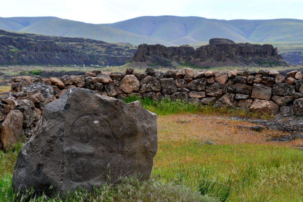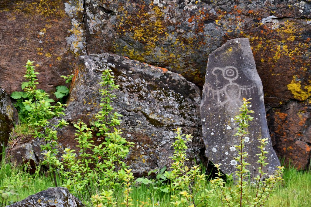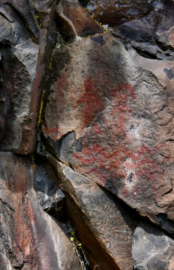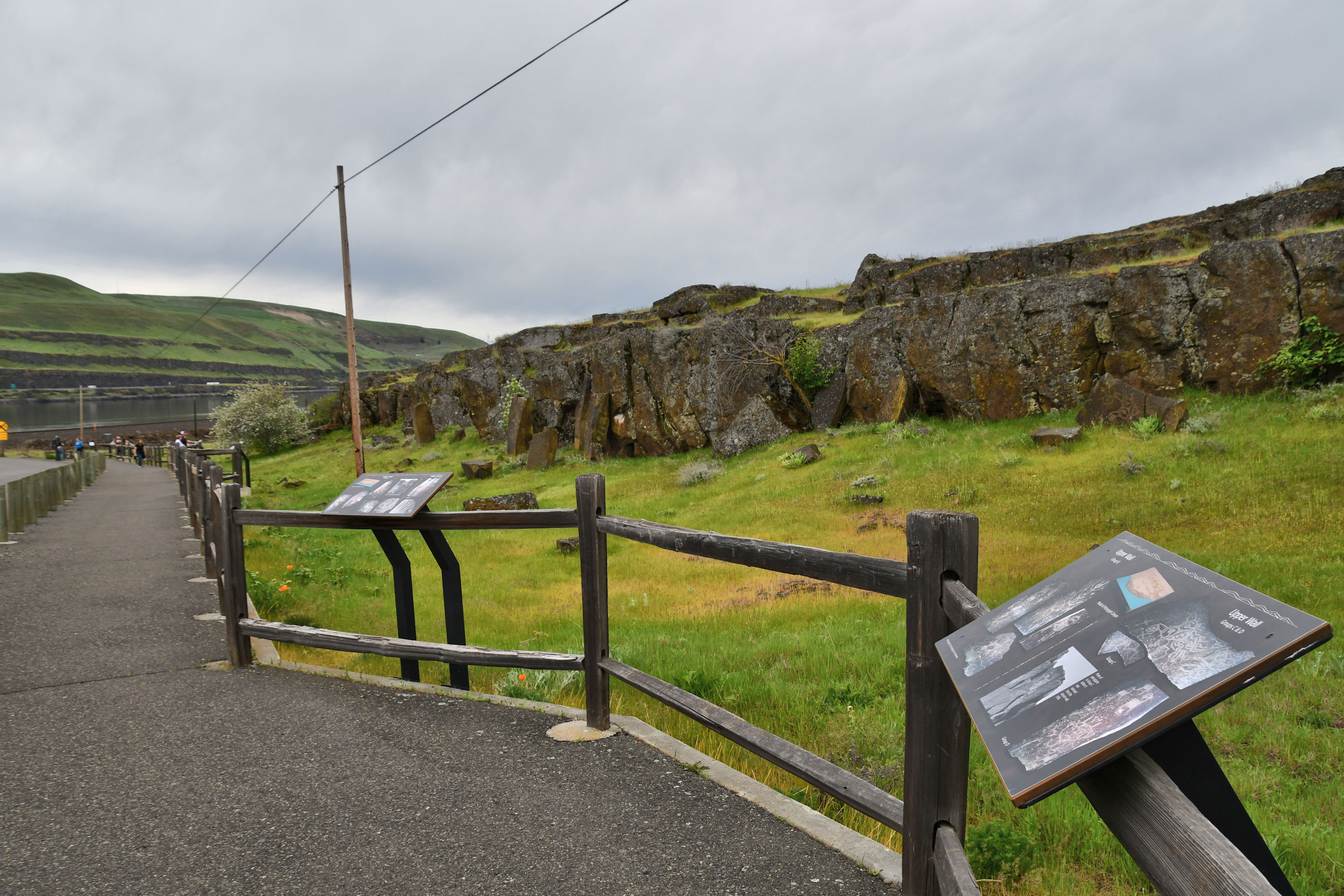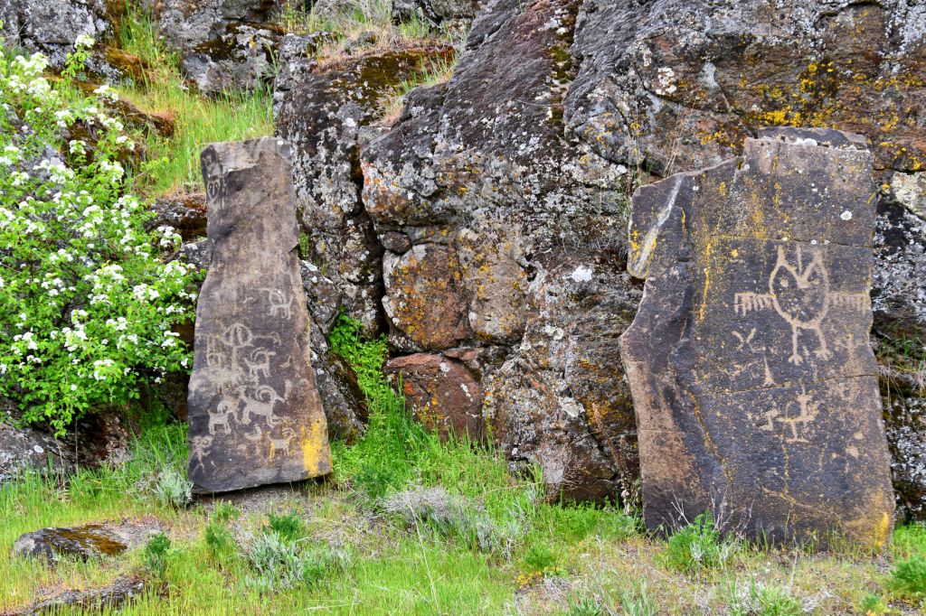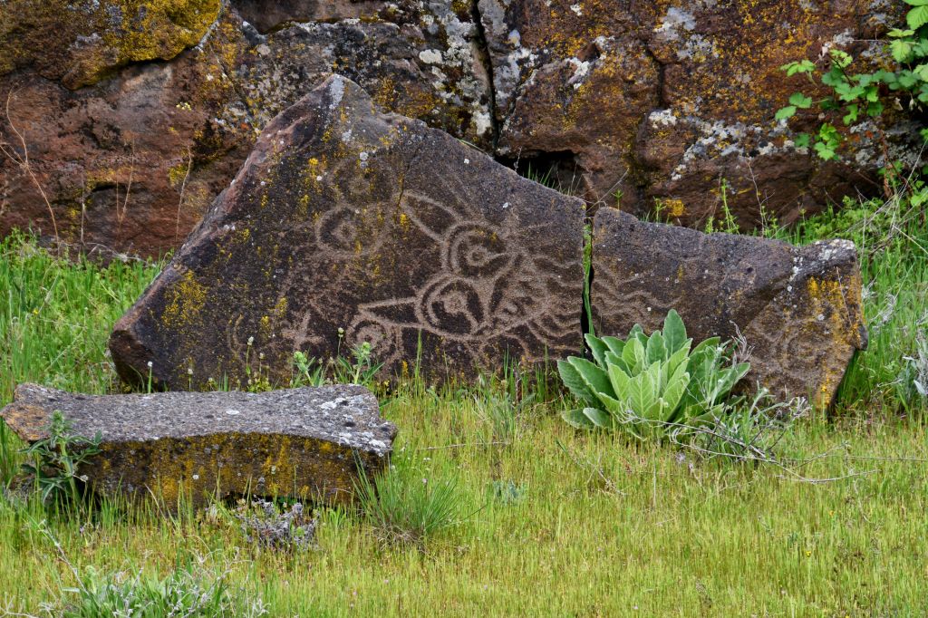 We separated into two groups to make it easier to get up close to the rocks, so I missed it when Ranger Brock pointed out the location of the former village of Nixluidix. The age of the pictographs at this site is estimated to be near 300 years old. This estimate doesn’t take into account the story of Coyote and the Chief, however, so I wonder how old the Wishram would say it is.