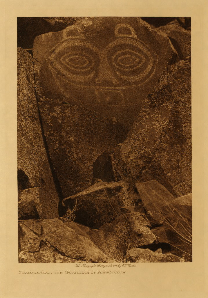 I don’t know the Wishram language, so I don’t know the exactly proper way to spell her name in their own syllabary, but Warm Springs Natives today write the anglicized version as: Tsagaglalal, and I will follow their lead. Tsagaglalal is the word in the Wishram language, for the character in this pictograph. Colloquially, most people know her as She-Who-Watches. Edward Curtis provides the earliest photograph of this pictograph that I could find, taken sometime around 1910.