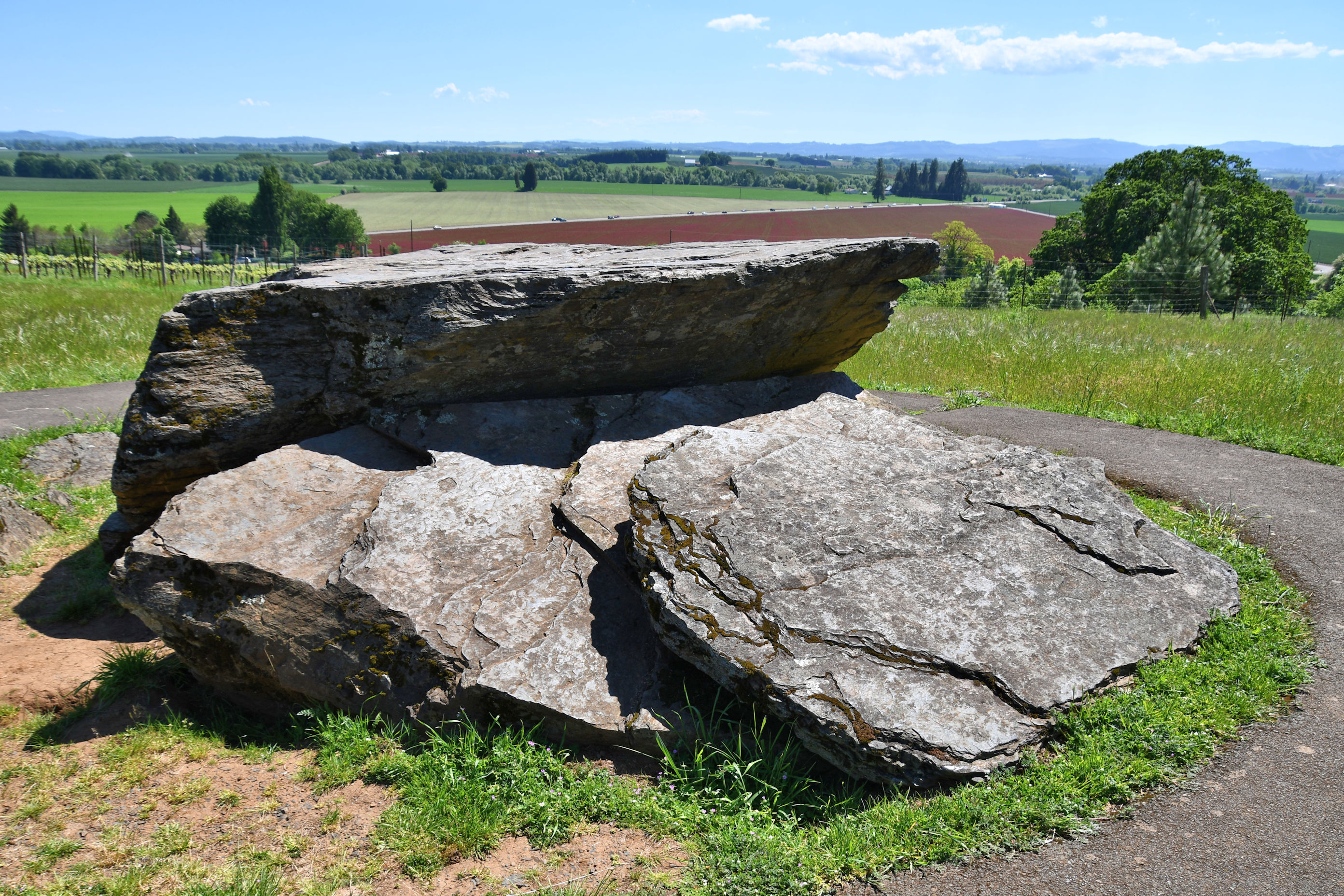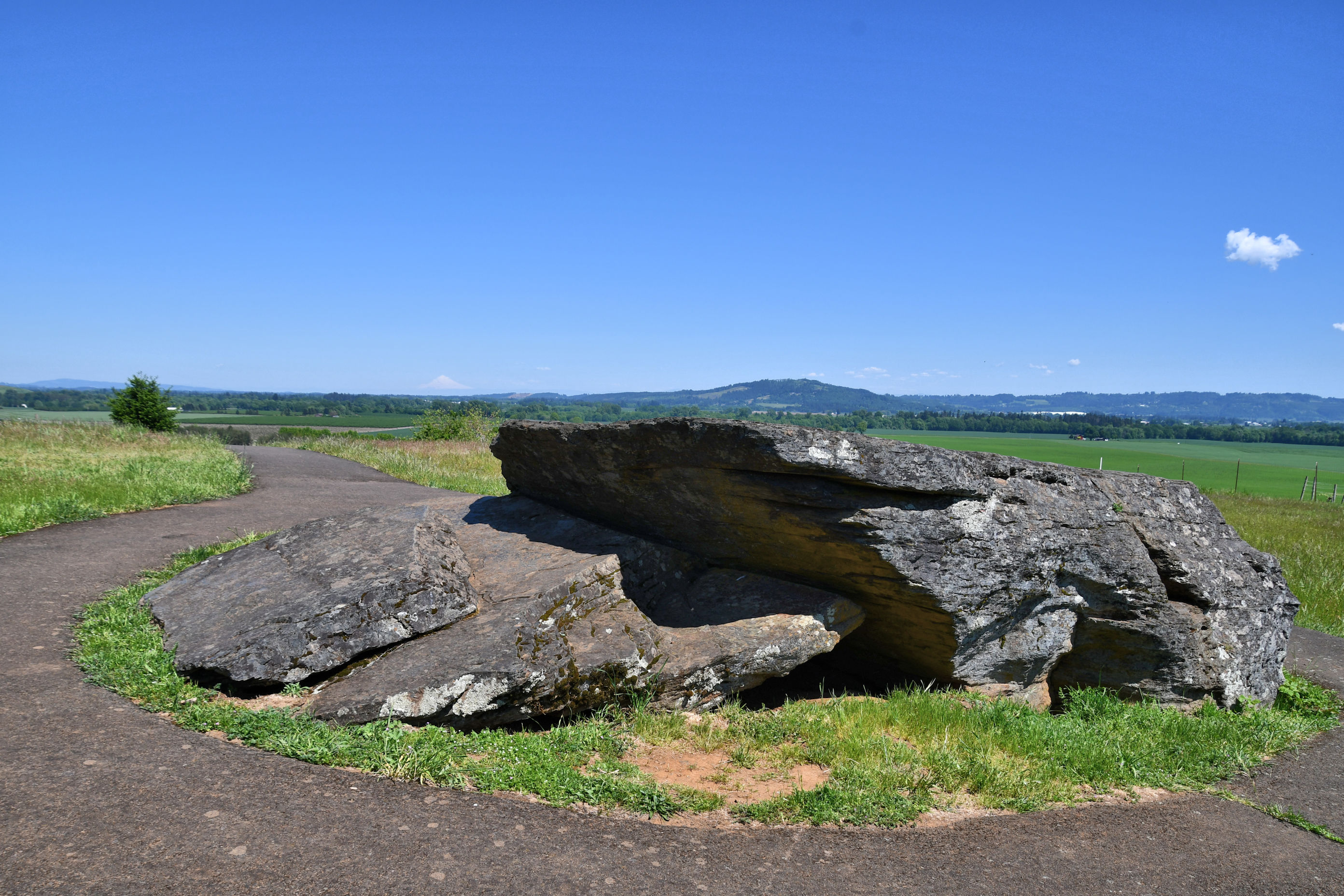 The Missoula Floods were up to 1000 feet deep and carried glaciers with embedded boulders. When the glaciers melted, they dropped the boulders at that spot. This one is the largest of hundreds in the Willamette Valley.