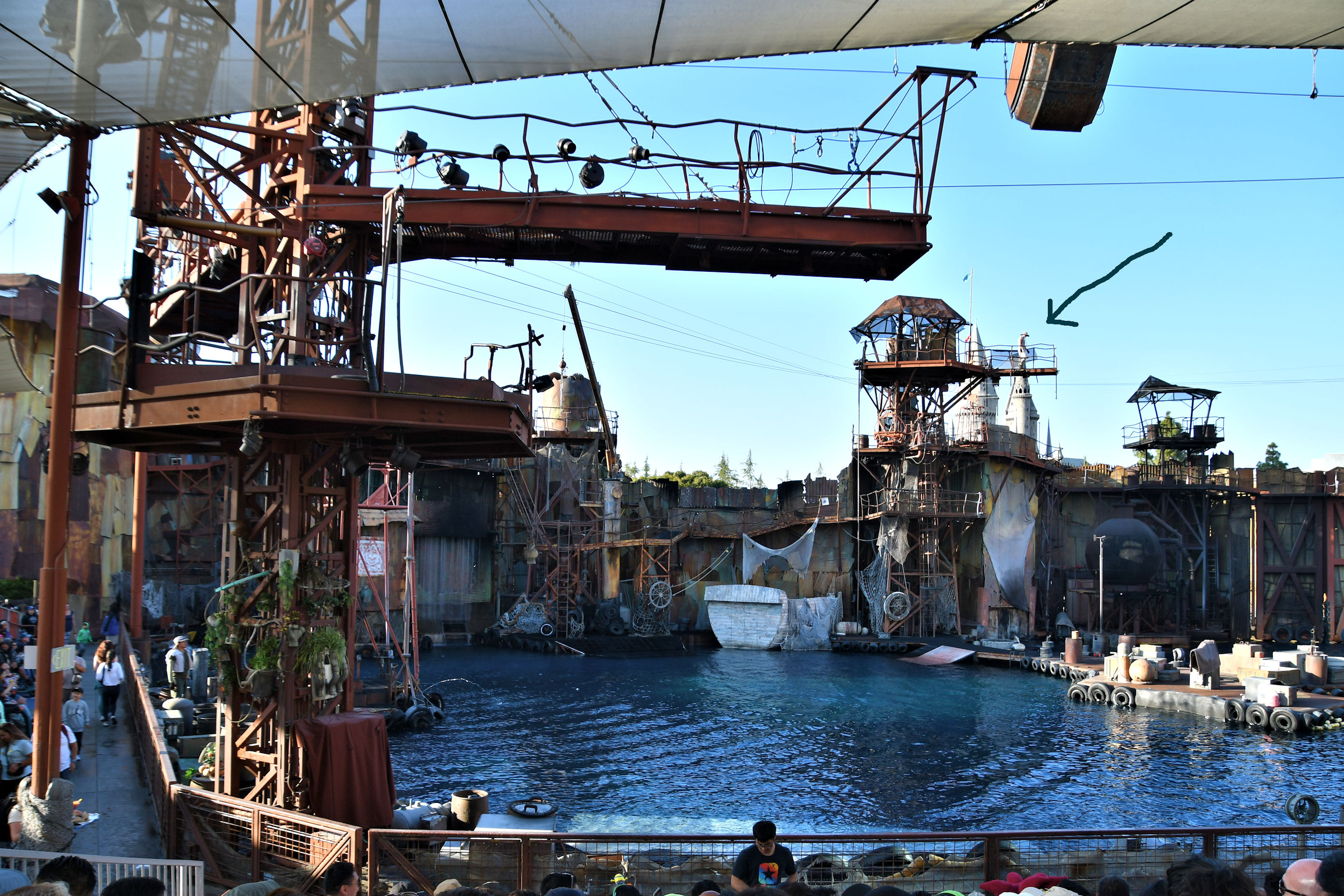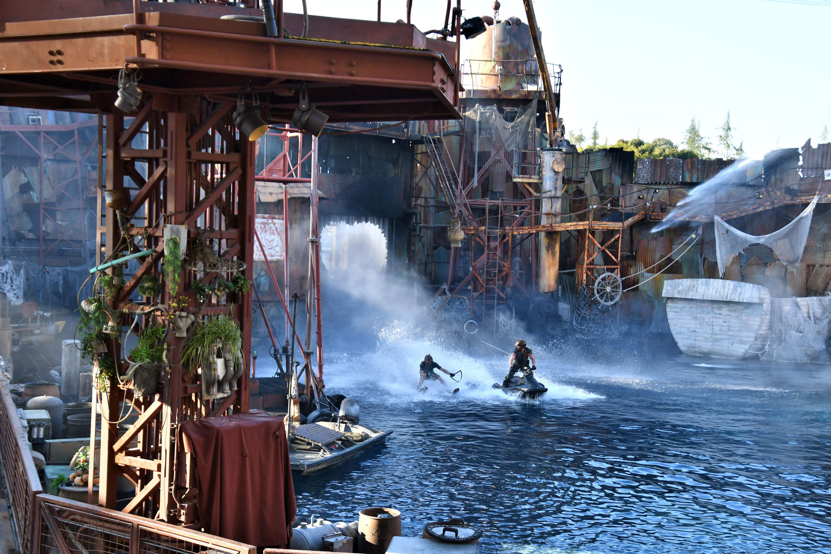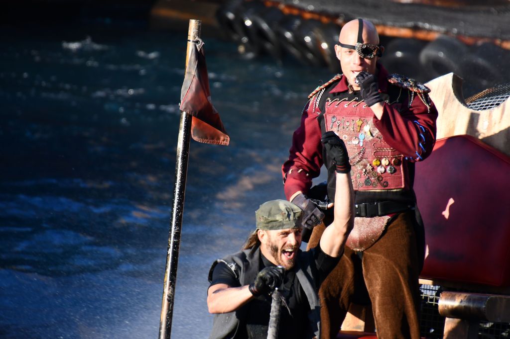 The Waterworld show is a scene acted out that was not in the movie, but would have fit into that world. The setting is a friendly island of floating metal scavenged from beneath the global-warming flooded world. Right away, scouts come zooming in on jetskis and do some great acrobatics and tricks. The scouts indicate that a nearby enemy floating island has sent a couple of villains on their way to attempt to take over their island. The characters all go to their stations to prepare to defend their home.