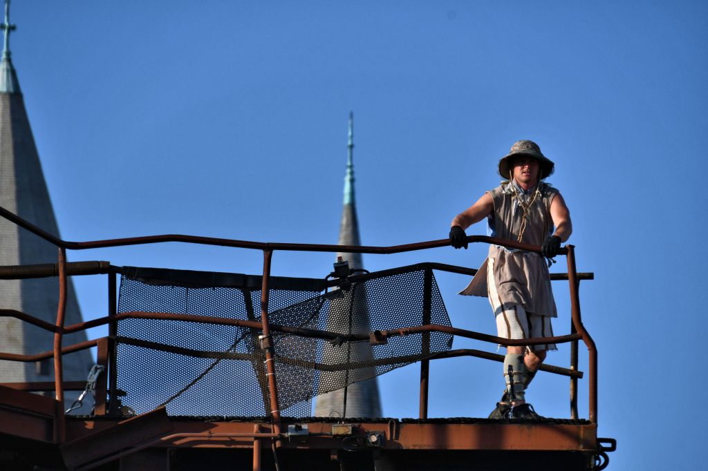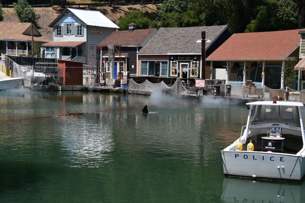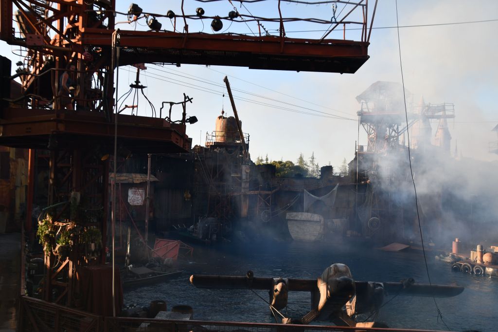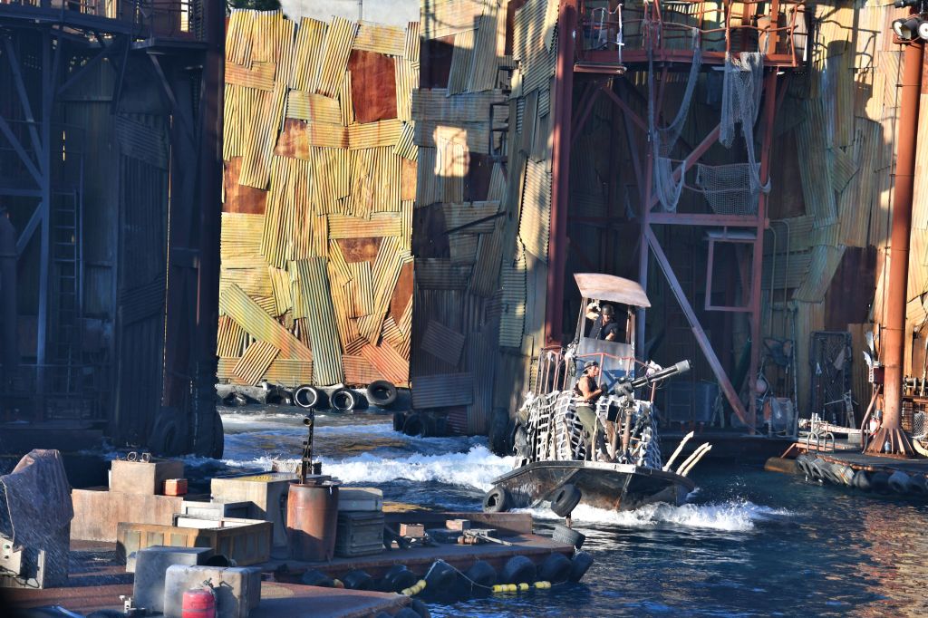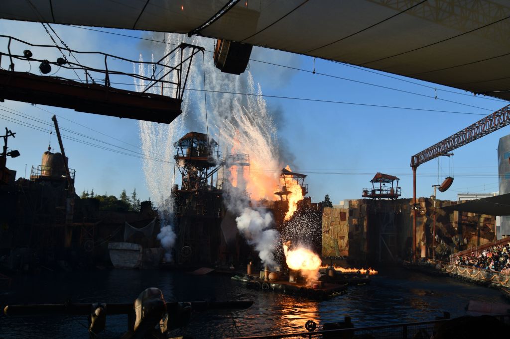 The Waterworld show is a scene acted out that was not in the movie, but would have fit into that world. The setting is a friendly island of floating metal scavenged from beneath the global-warming flooded world. Right away, scouts come zooming in on jetskis and do some great acrobatics and tricks. The scouts indicate that a nearby enemy floating island has sent a couple of villains on their way to attempt to take over their island. The characters all go to their stations to prepare to defend their home.