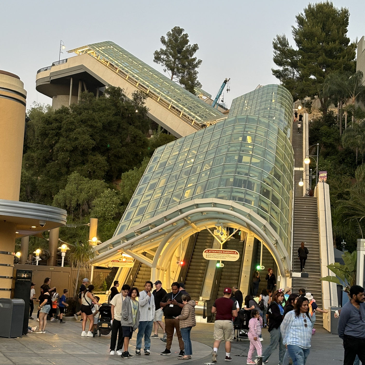One totally different feature that USH has that Disneyland does not have is that it is built on a rather steep slope. To get from the upper park attractions to the lower park attractions requires traveling up and down a series of four escalators in a row. These were easy to use and always reliable with no lines.