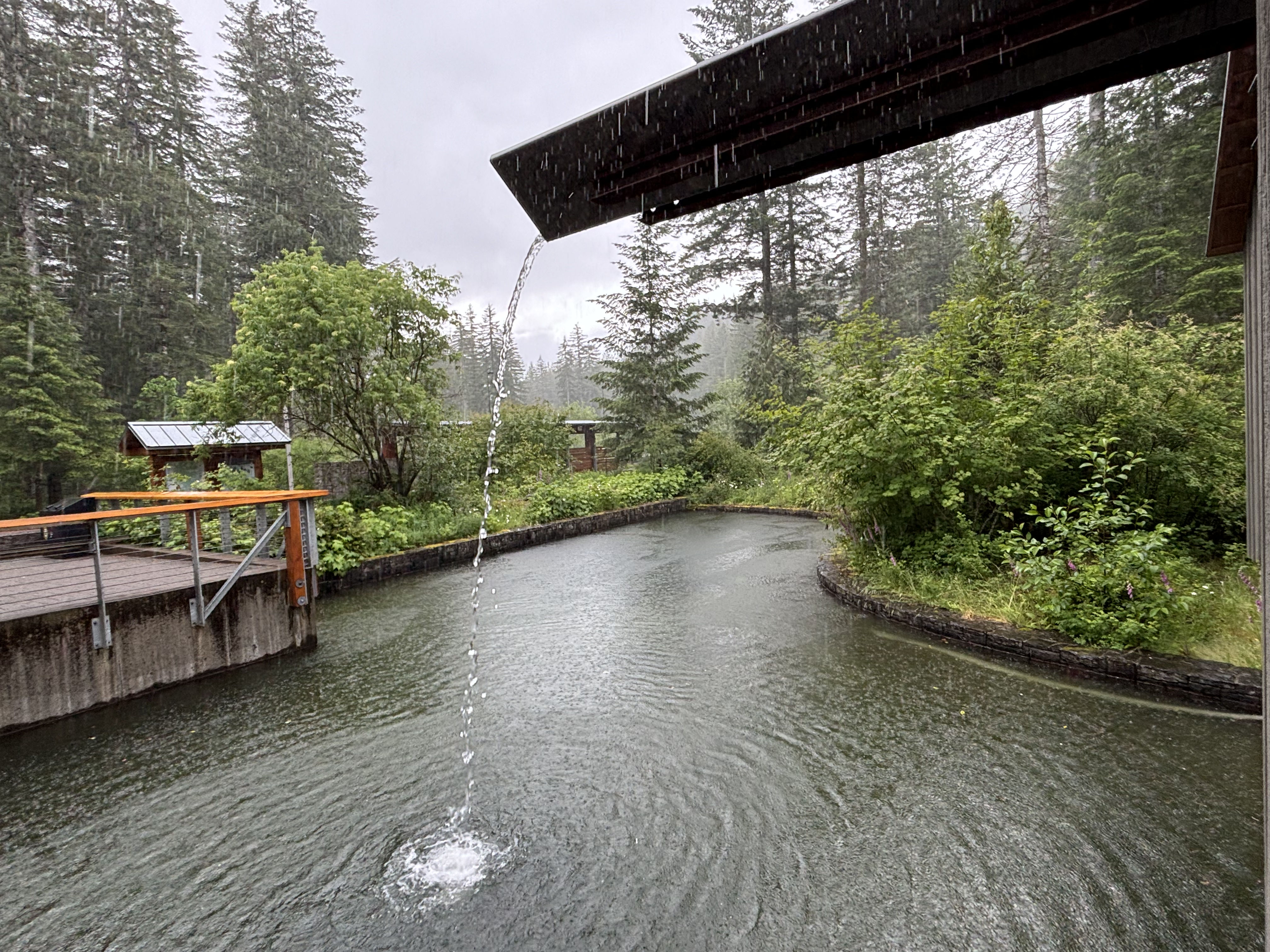 Andre examined the outside of the building and noticed the long, V-shaped protrusion you can see in the above photo that hovers over the water. He surmised that it was a creative waterspout to make rainfall into a waterfall. That seemed like a good guess, but no one knew. Then a doozy of a rainstorm began, and his theory was proven to be true.