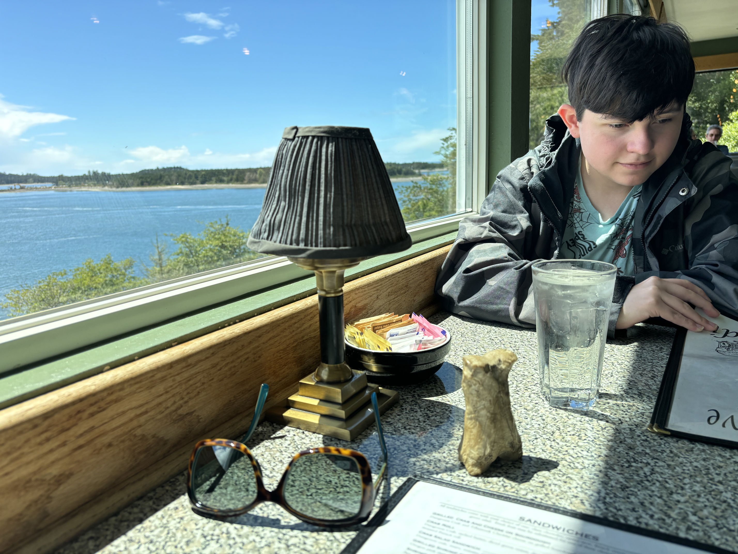 Liam looks at the menu with a Pacific Coast view in the back ground. Bone already knows what he wants to eat.
