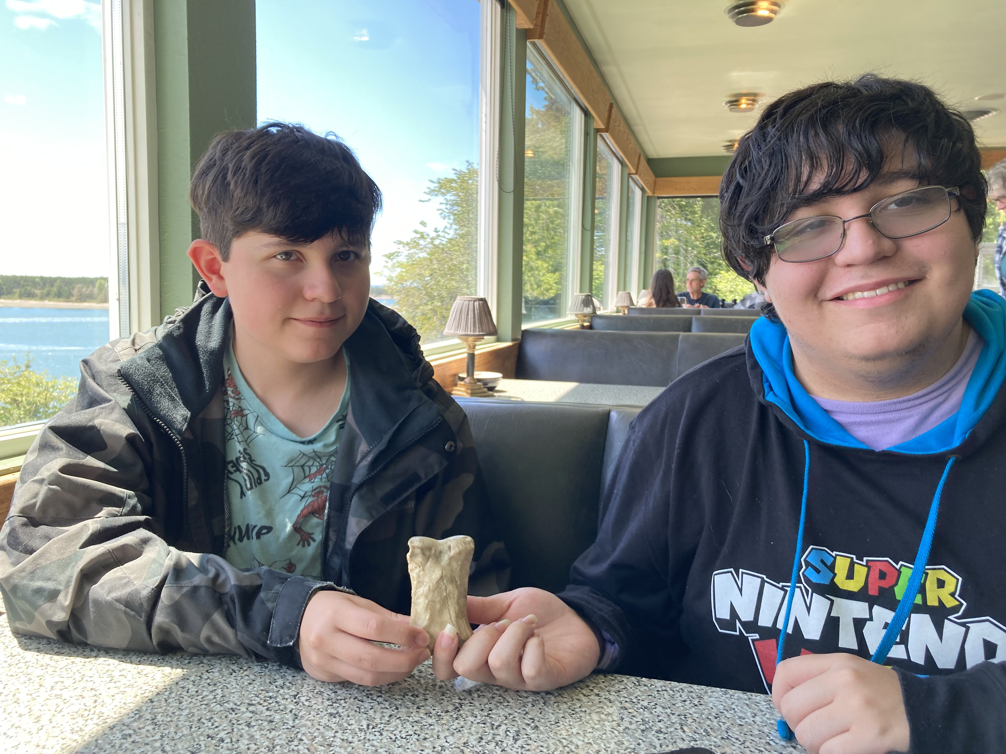Anyone who has followed Curt’s blog is familiar with Bone, the Traveling Bone. Bone came to visit me back in 2018. We did so much stuff: visited my bees, went to Astoria on the coast, and best of all, spent a week in Oklahoma learning about the Cherokee Nation. Read all about it in my blog post about Bone. Anyway, Bone and I have been friends ever since. But Liam and Andre got to meet him for the first time.