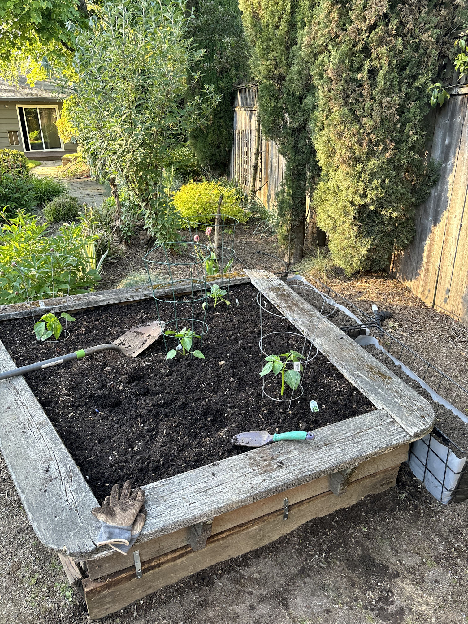 After a month in the ground, our plants in the second bed were not doing much. We had fertilized and composted and watered, but they were barely clinging to life. Then we realized that things were struggling worse on one side of the bed than the other. The side where nothing grows is the side adjacent to the former hot tub. We suspect hot tub water may have splashed into the garden. OK. Another lesson learned for next year. I took two of the peppers out of there and replanted them into the Greenhouse Garden.
