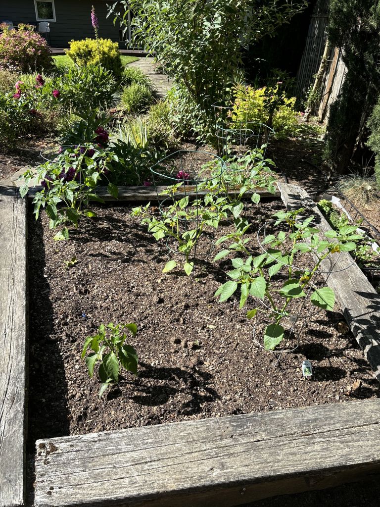 In the second bed, I planted tomatoes and peppers. The basket used to be on the other side, but I moved it to here.