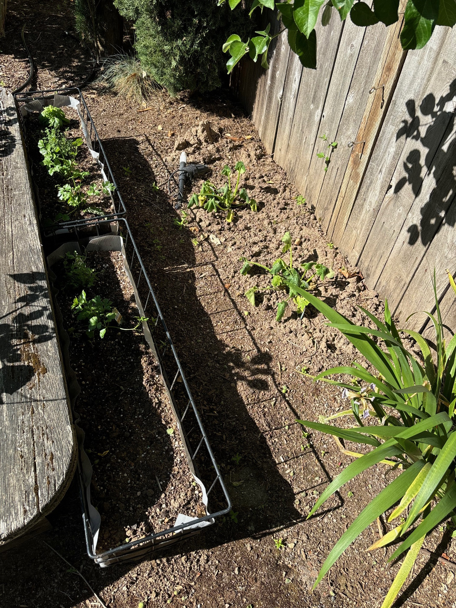 To take advantage of all the sun, I planted herbs in the baskets and zucchini in the clay beside the fence. Oops, they need water!