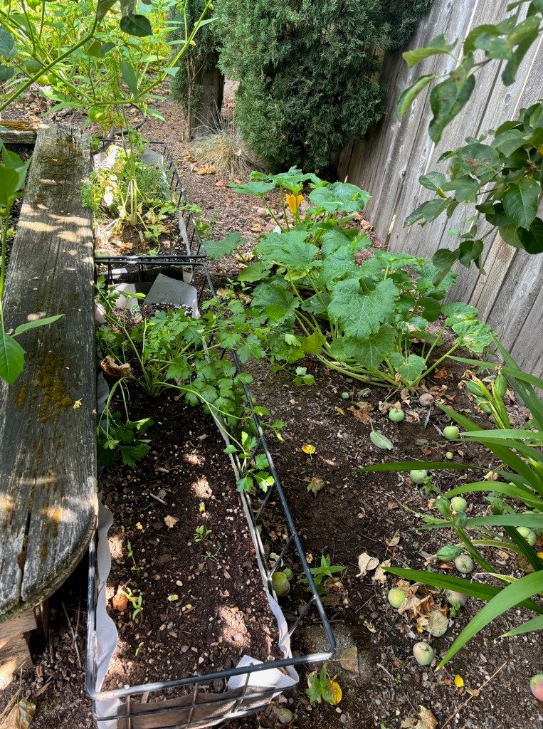 The apple tree got huge. I wasn’t watching, so I don’t know what happened there, but the branches loaded with apples have reached out to the tomatillos and made a garden that’s in constant shade now, between the bed and the fence. The zucchinis have terrible soil and constant shade so I don’t expect much out of them this year.