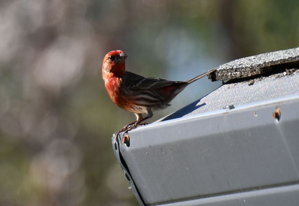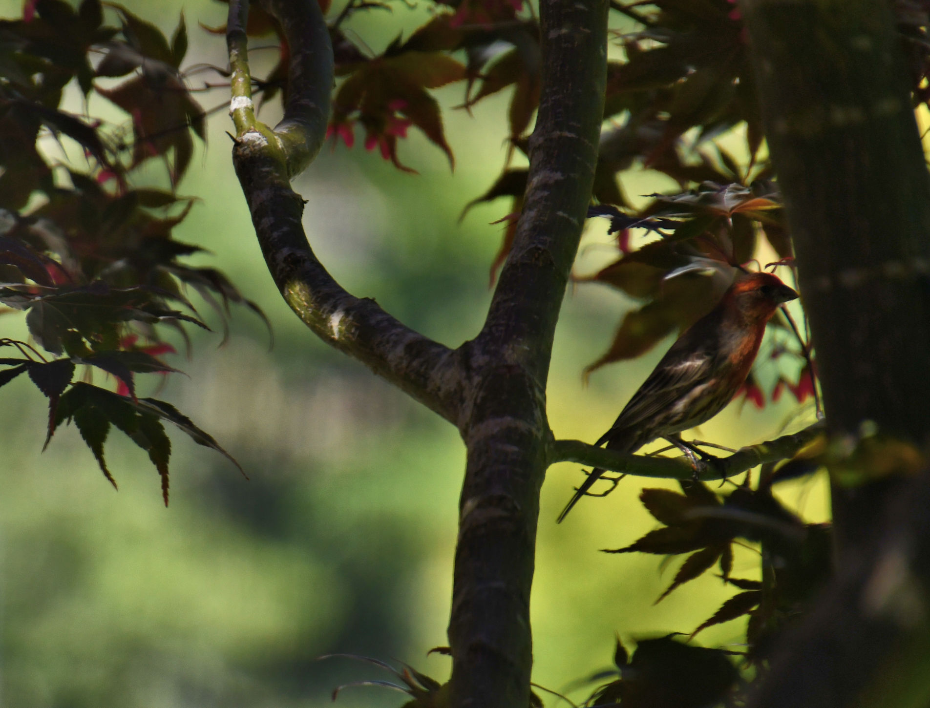 For a couple of weeks, I could spot her up there. I no longer heard Mr. Finch, and wondered what he was up to. I would see what seemed like a flash of red in the ornamental maple by the office window, but I was never sure till I captured him one day.