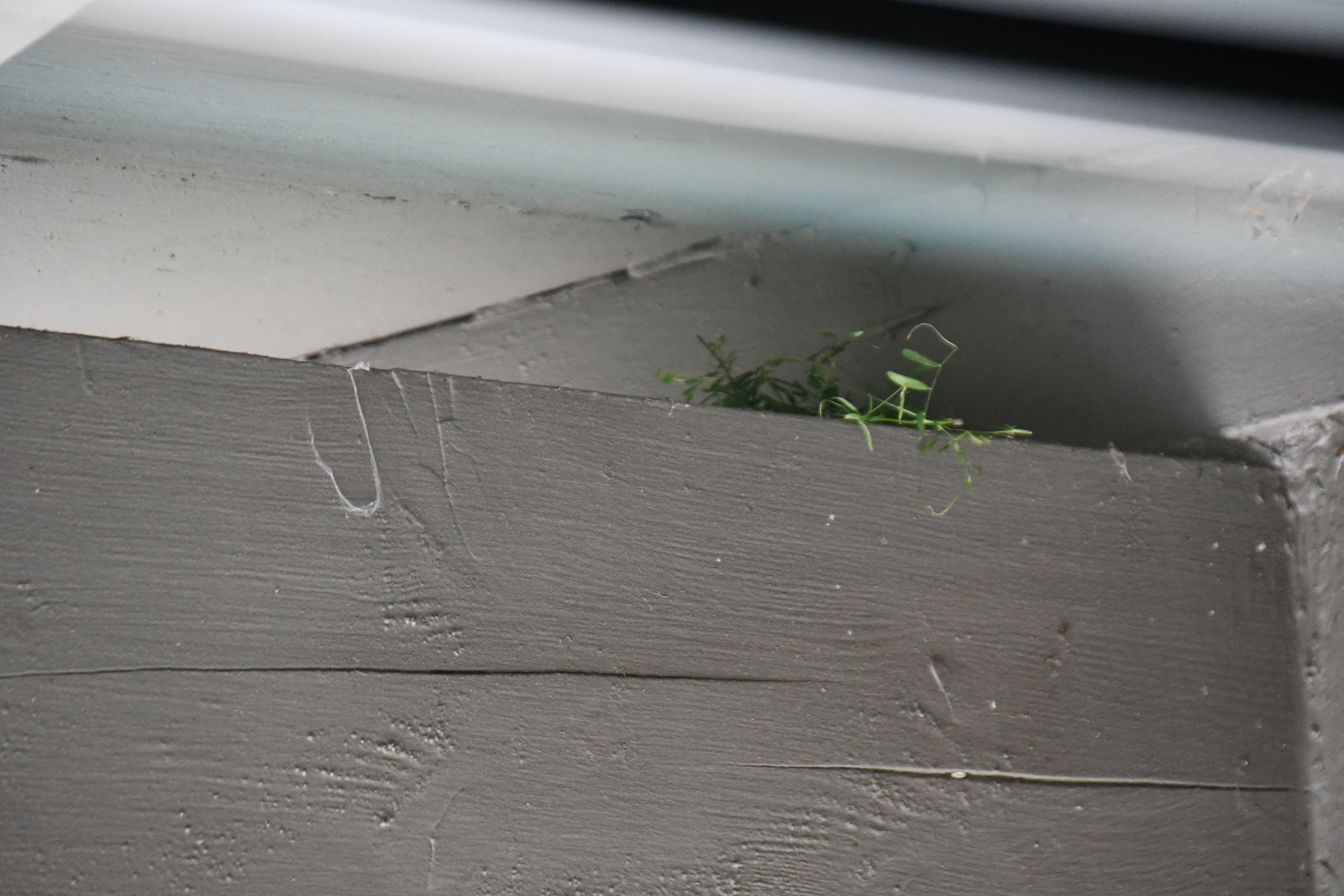 One bird perched on the roofline, singing loudly and as aggressively as a tiny and beautiful bird with a beautiful song can do. The other bird flying back and forth, back and forth, dropping debris onto a beam in our porch. Bad balancing and a little bit of wind that day kept dropping her attempts onto the porch below.