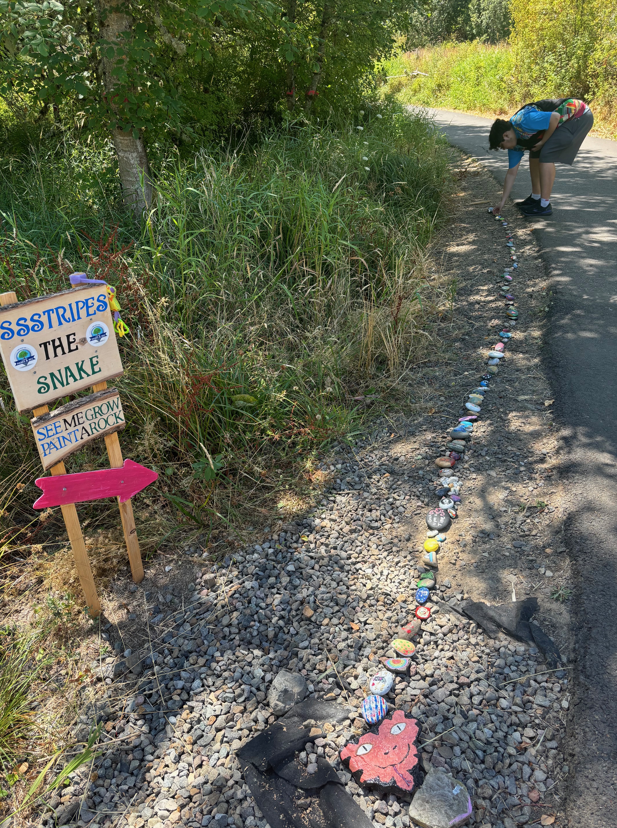 Along the Fanno Creek trail near our house is a cute idea with a rock snake that grows over time when random people decorate rocks and add them. We finally made the time to paint our own rocks and add them to the snake. I painted the squirrel and the plant thing. Andre made the symbol for Earth bending from Avatar. Pedro did the cat painting. Liam did a whole pile of rocks and liked them all so much he kept them, but finally agreed to part with the green and black creeper from Minecraft.