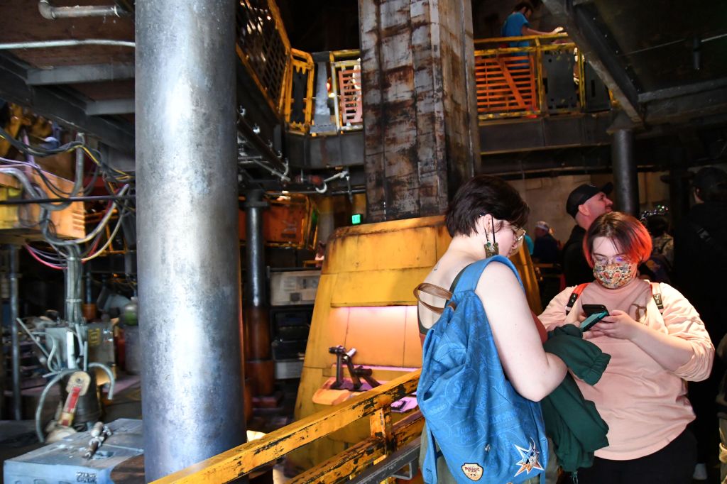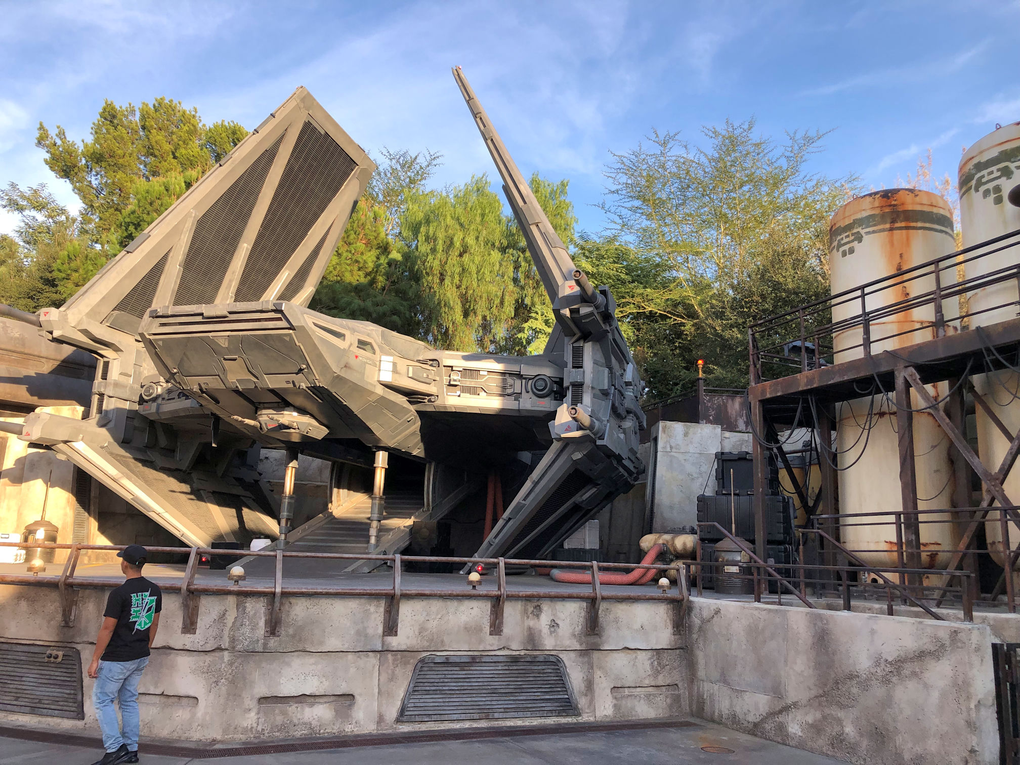 This is the entrance to a ride called Smuggler’s Run, where you actually get to fly the Millennium Falcon. Our Disneyland real time ride app told us the wait would only be 25 minutes, so we got in line. After a bit of a wait, the app updated to say the wait time was now 125 minutes. We thought that seemed like a mistake, so we stayed in line. After an hour, we weren’t even close to the front, and we realized we had made the wrong choice. For some reason we got stubborn and stayed there, and waited the full 125 minutes. It was sooo long. But there was a lot to see as we waited. Disney does a good job of this in multiple places, placing things to look at while you wait. First of all, we got to stare at the marvelous ship as the line crept around it.