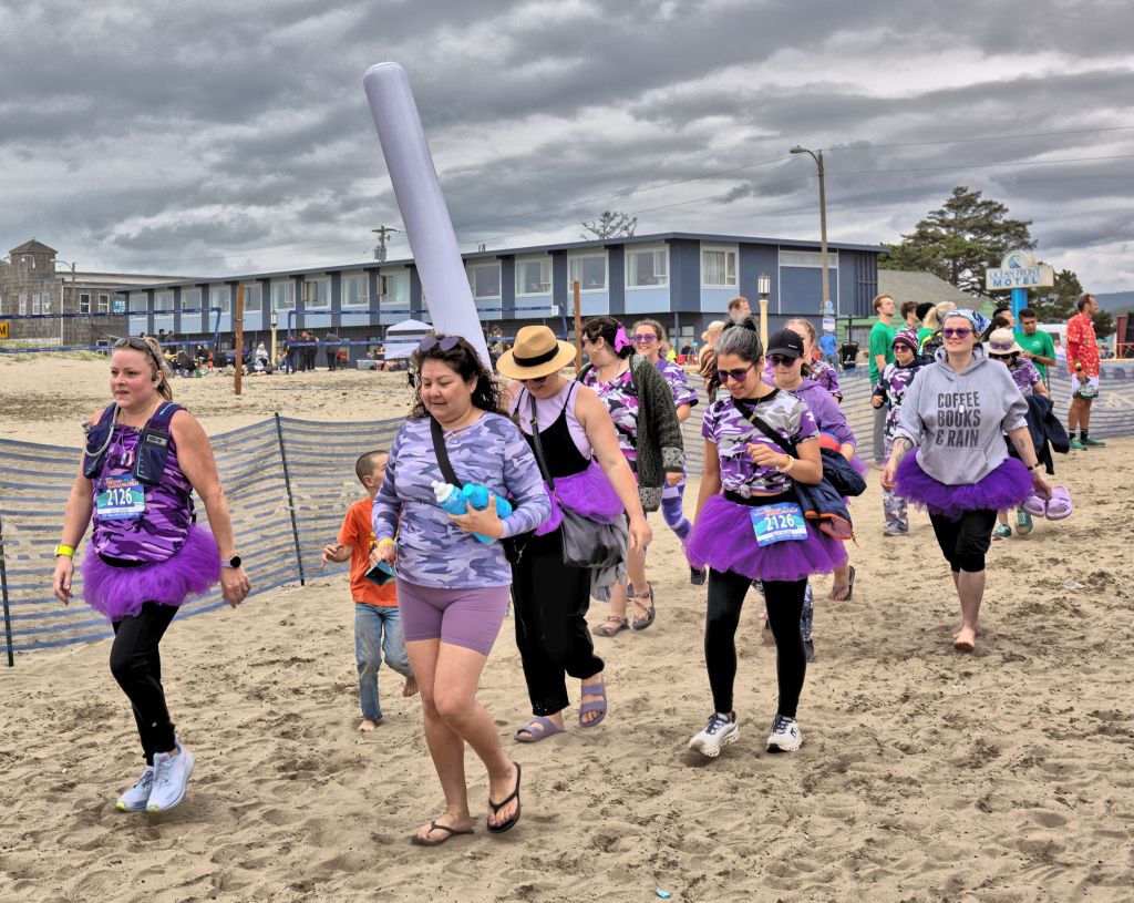 My regular readers have heard about this race from me, so it’s old news. But if you didn’t know, there is a gigantic running relay race every August known as the Hood to Coast, that covers 190 miles from the Timberline Lodge on the slopes of Mt. Hood to the sandy beaches of Seaside, Oregon. There is a simultaneous race called the Portland to Coast that covers 120 miles, consisting of walking teams, and that’s what our team is. Everyone around here has heard of it, even if they have not been involved, because for two days you can see the runners and walkers beside the road. There are about 18,000 participants, plus organizers, volunteers, and crews supporting them, so that is like a whole additional city that scoots slowly along the highways and backroads and neighborhood streets from point A to point B.
