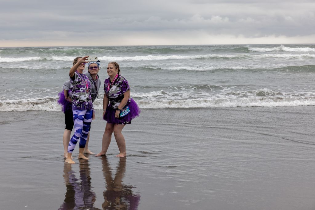 The finish line is in the middle of a humongous beach party, with not only the thousands of participants, but their thousands of supporters. It is madness, and not many on our team are interested in joining them while we are exhausted. We usually make our way through them all, and off to the beach. Because, the ocean is right there and we want to touch it!