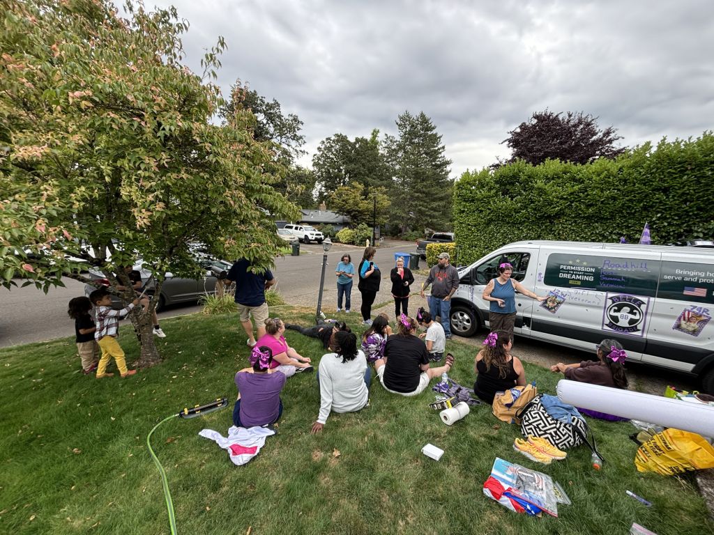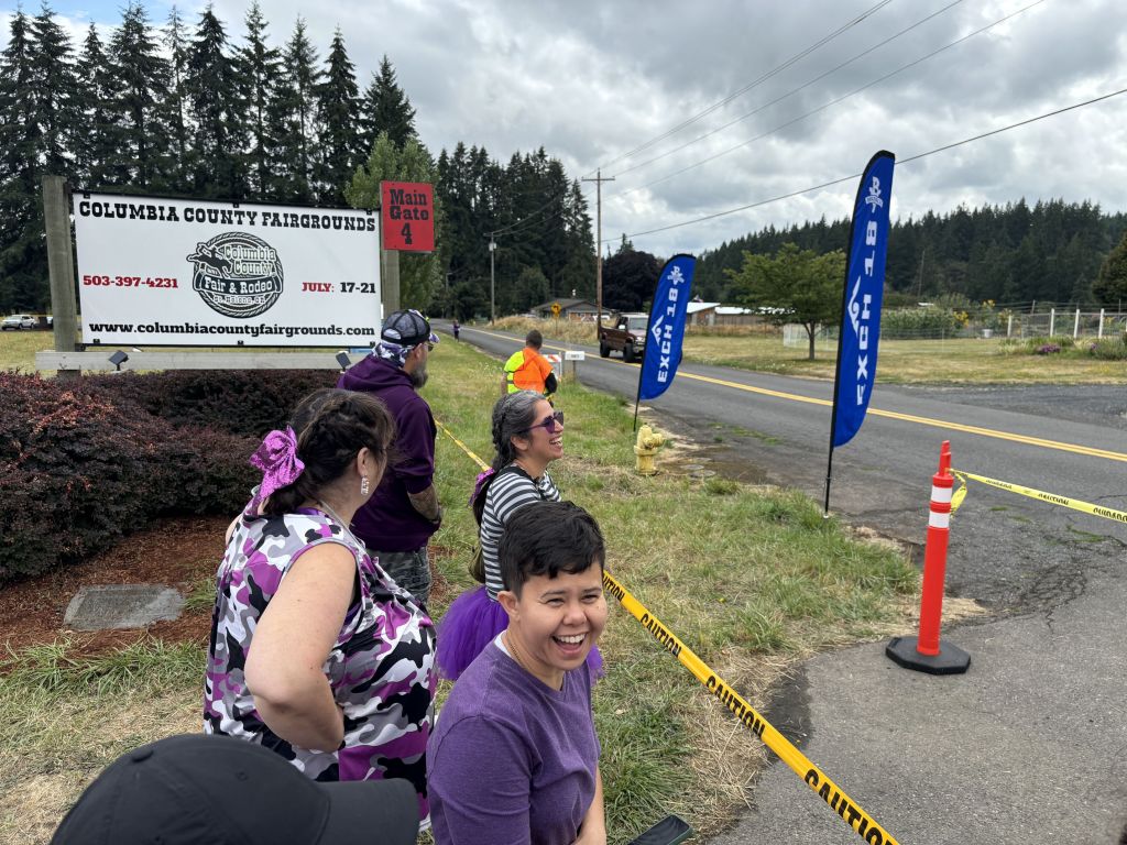 Van 1 starts us off, at the Oregon Museum of Science and Industry (OMSI), beside the Willamette River in Portland. Each woman speed walks her segment, which is from 3.5 miles to nearly 8 miles long (depends on terrain and safe places to put exchange points), then hands off a slap bracelet to the next woman. (I’m saying “woman,” but one person on our team is non-binary. They told me it’s ok to keep referring to it as an all-woman team.) When the sixth woman finishes her leg of the race, she slaps the bracelet onto the wrist of the first woman on Van 2, and then all the ladies in Van 1 go eat and rest for about 7-8 hours, till it’s time to take over again.